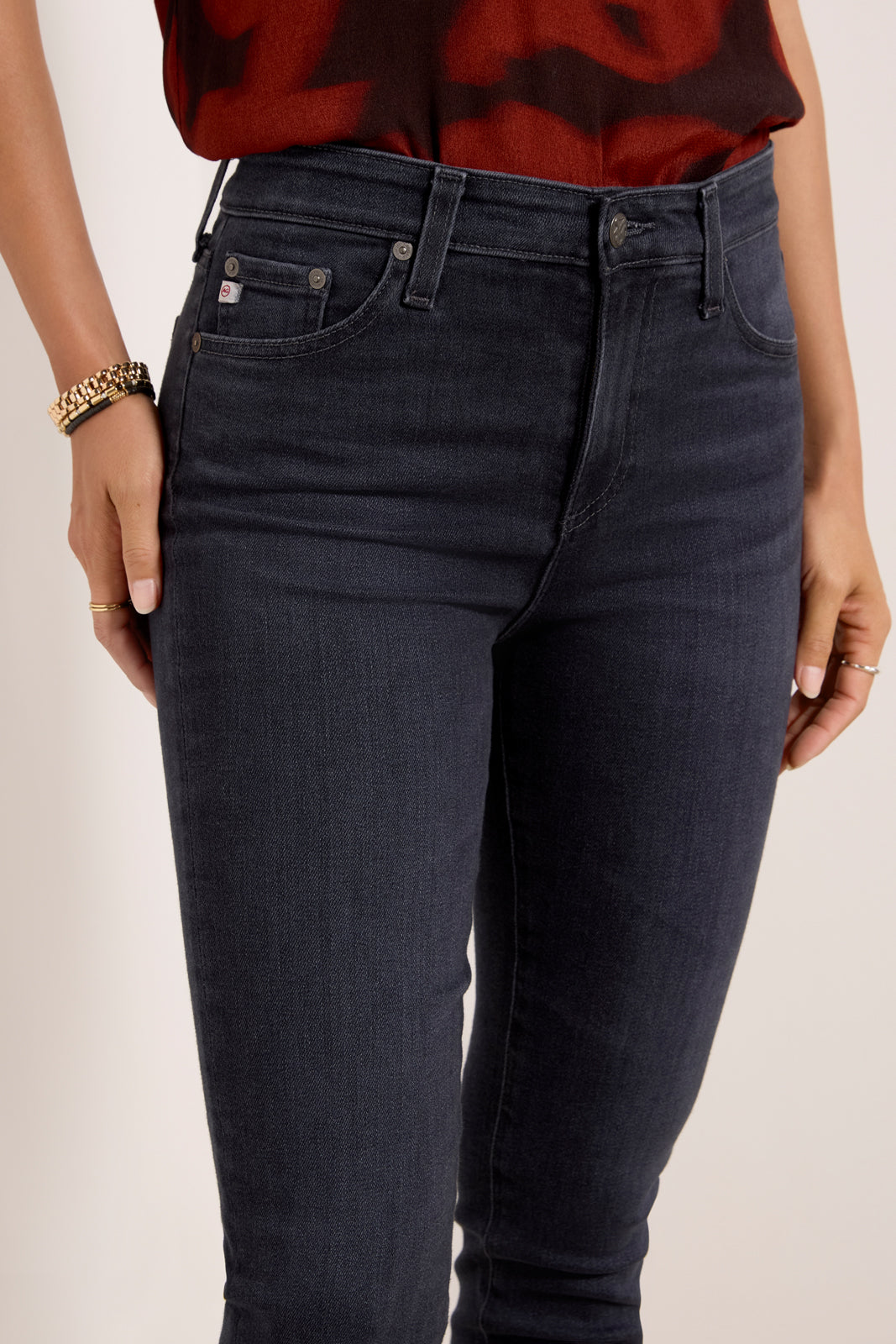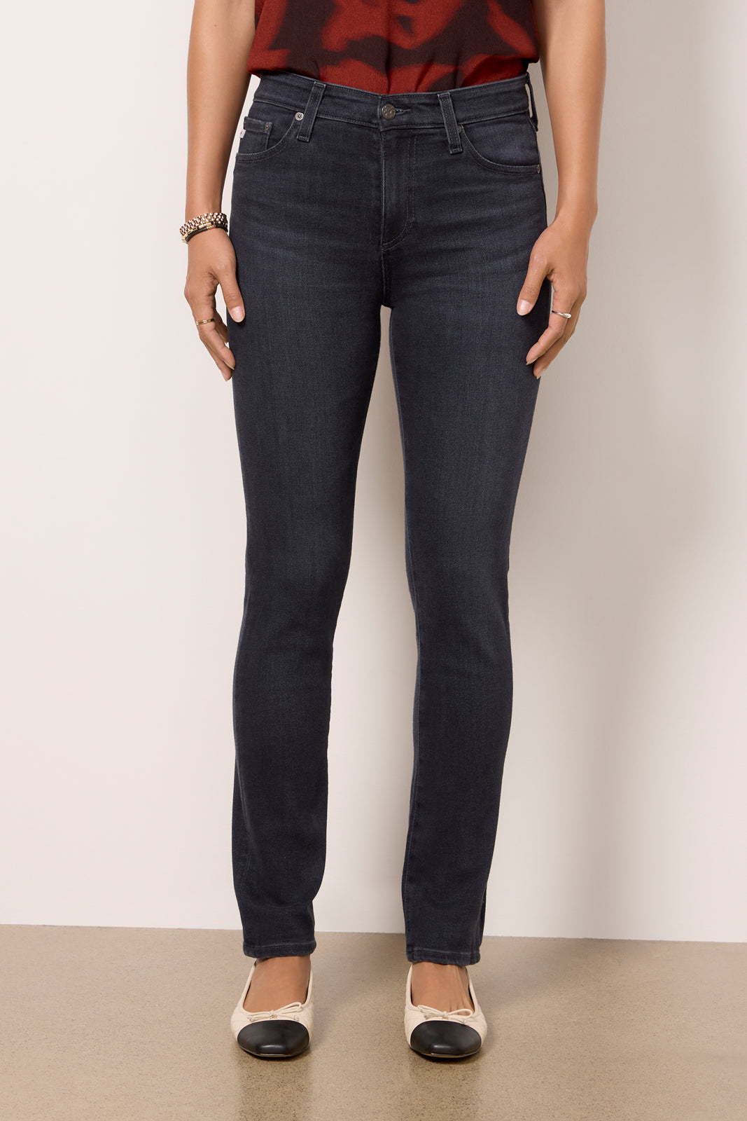 A slim straight leg creates the sleek silhouette of these AG jeans. featuring a mid-rise waist. faded black wash. and full-length inseam. Take them from day to night with a tee. tank. or blouse.