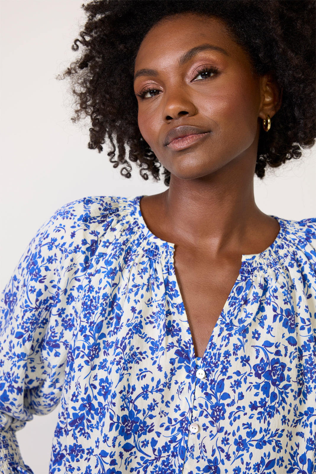 A gorgeous floral pattern elevates this button-front blouse by Rails. featuring a relaxed fit. flowy lyocell-blend fabric. and three-quarter sleeves with ruffled smocked cuffs.