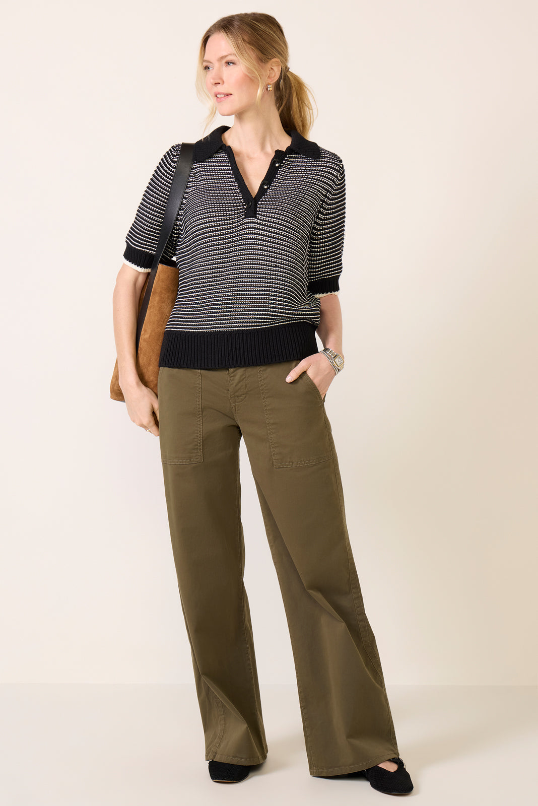 Add to your lightweight summer sweater collection with the Marley Striped Pullover by Michael Stars. featuring a polo collar. button neckline. rib knit detailing. and a relaxed fit.