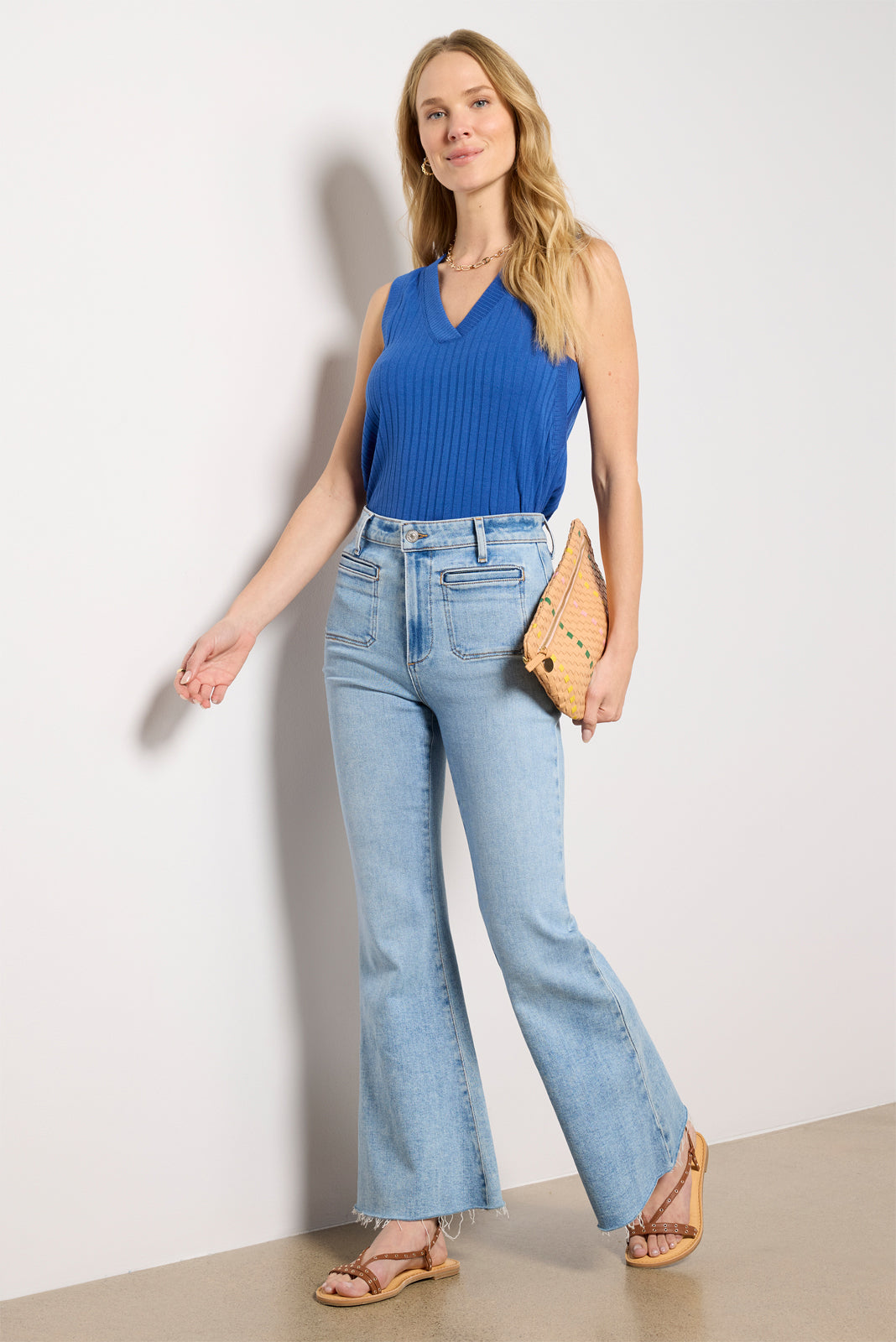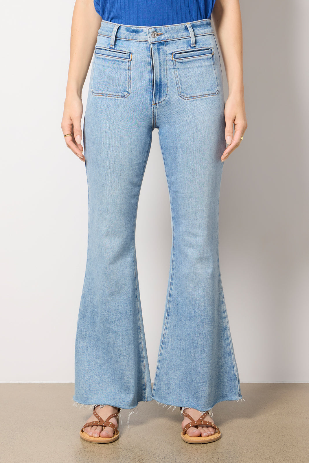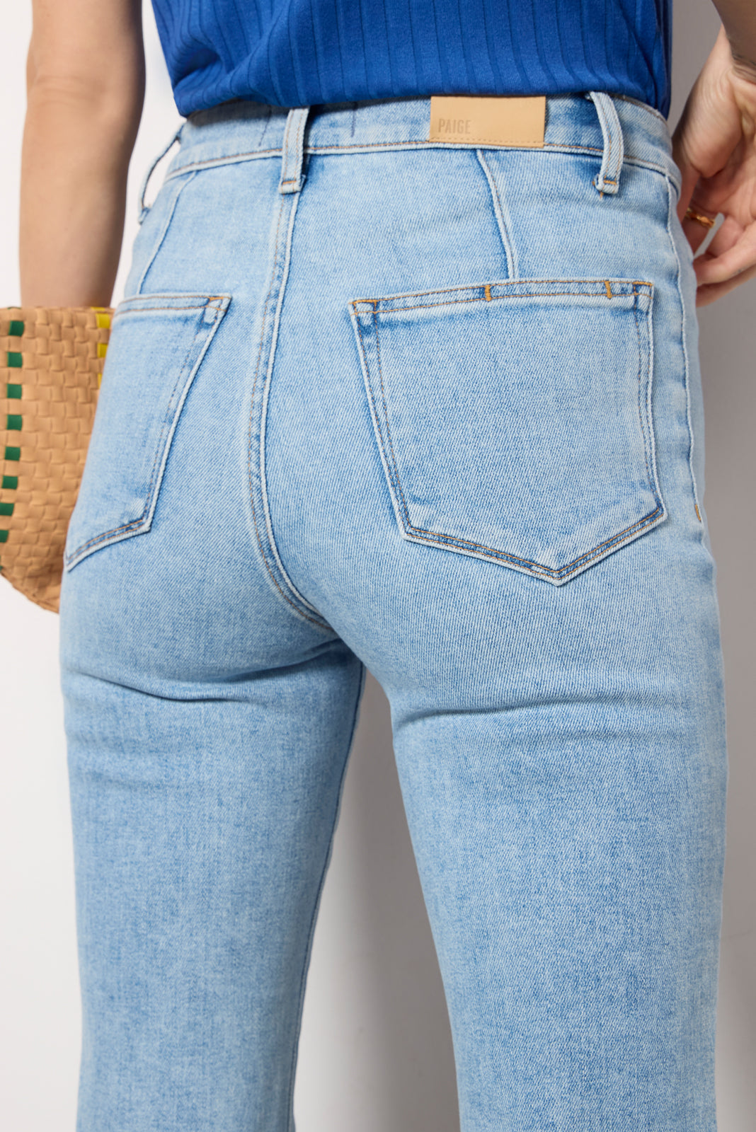 Welt pockets define the flattering Marlow Skimmer Jean from Paige. featuring stretch cotton denim. high-rise waist. and a flare leg silhouette with a full-length inseam.