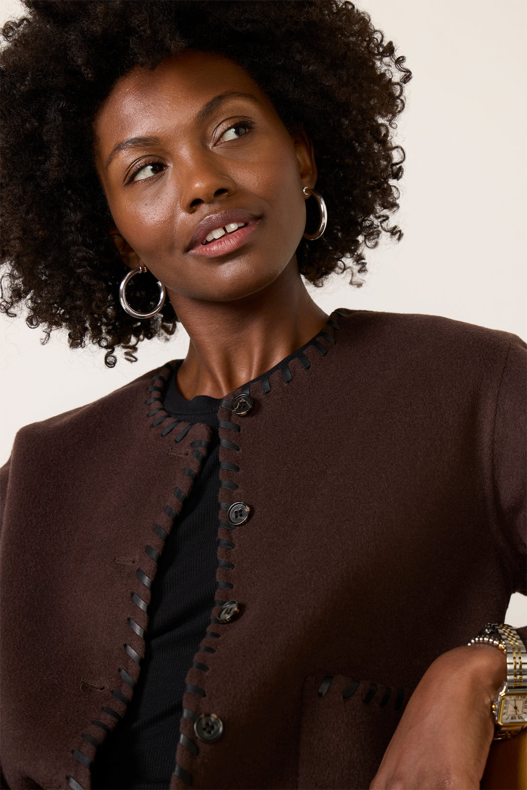 Whipstitch detailing adds a chic touch to this stylish wool-blend jacket by Rails. featuring a boxy. cropped silhouette with a round neckline. front button closures. and patch pockets.