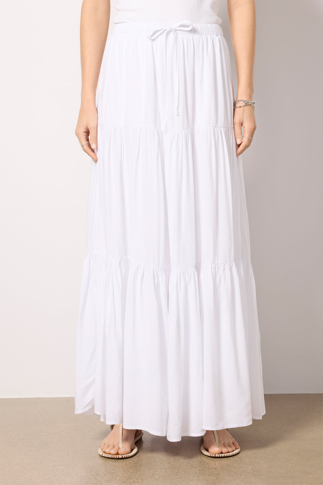 Say hello to your new favorite summer staple. the Melanie Skirt by Splendid features a drawstring waist. tiered detailing. and a maxi silhouette.