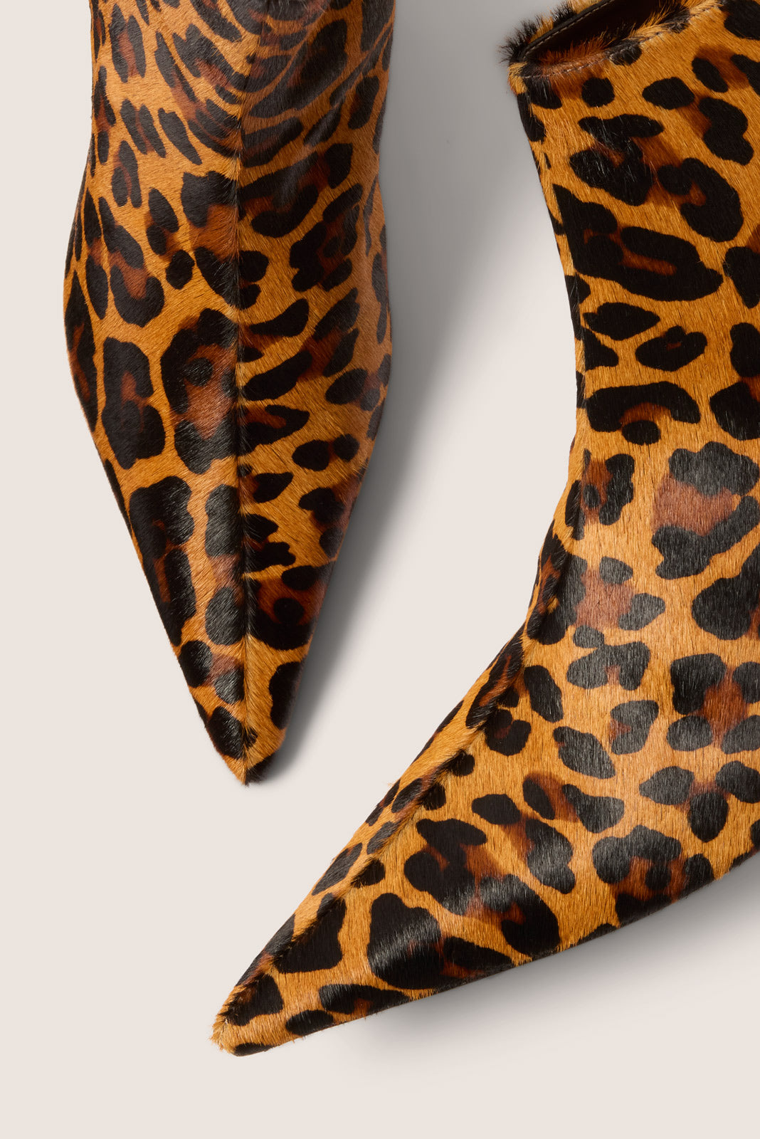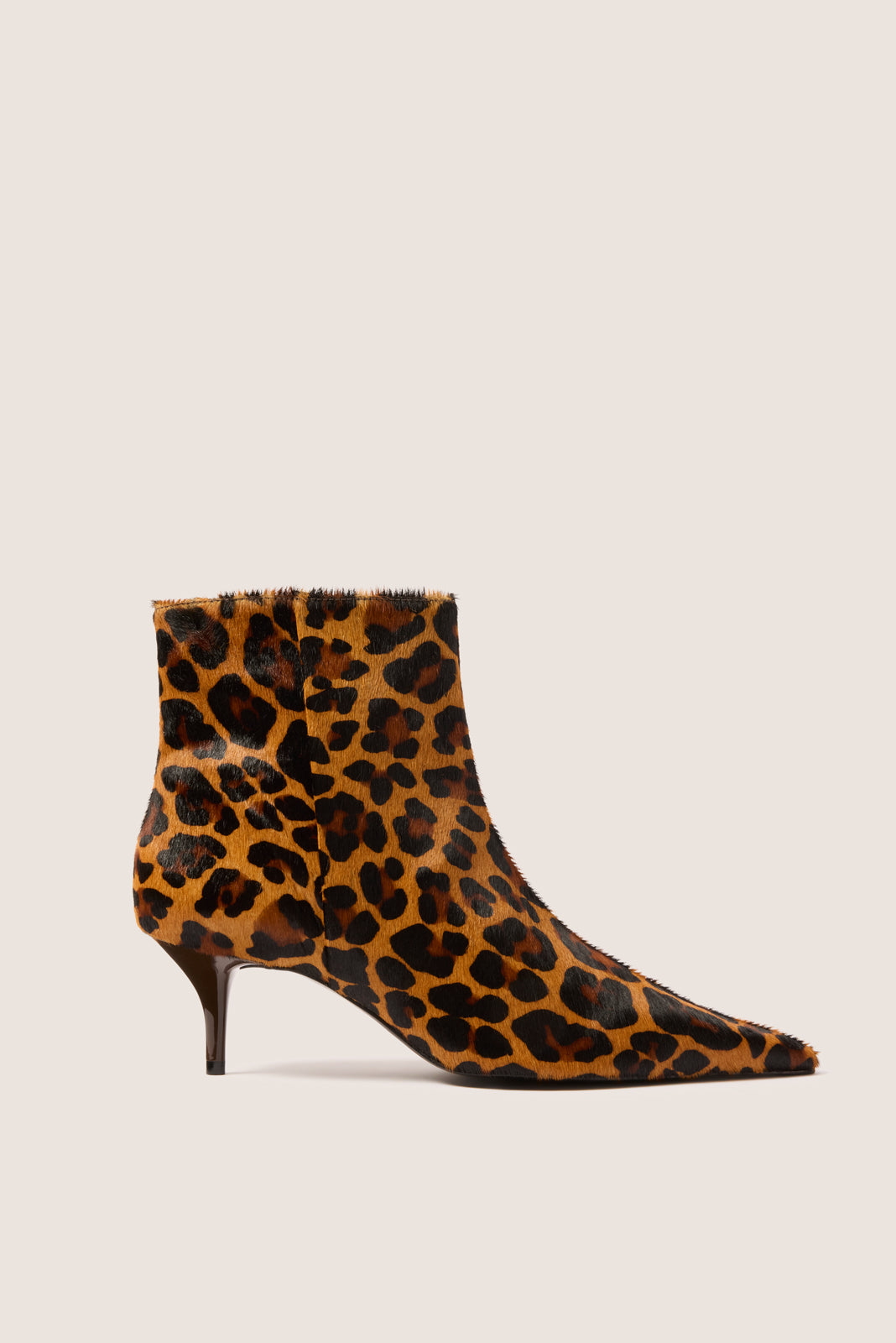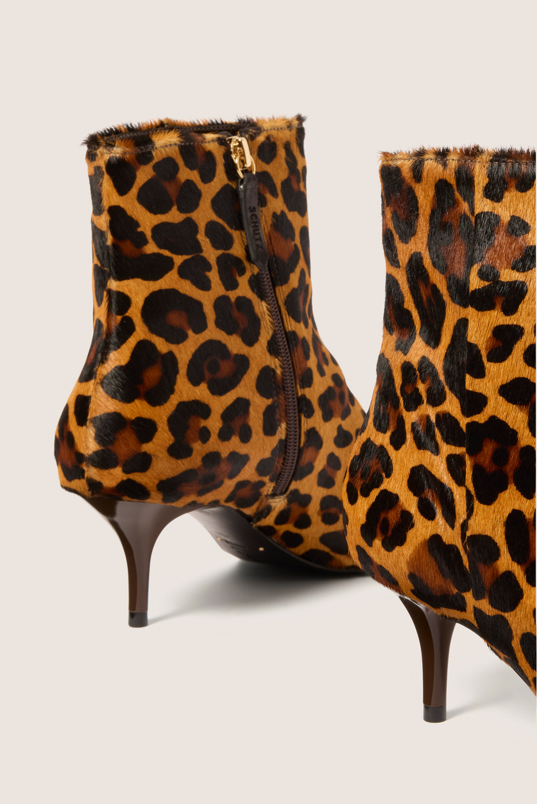Elevate any look with the Mikki Mid Bootie by Schutz. Crafted in leather and textured leopard print. these booties feature a pointed toe. a side zipper closure. and a stiletto heel.