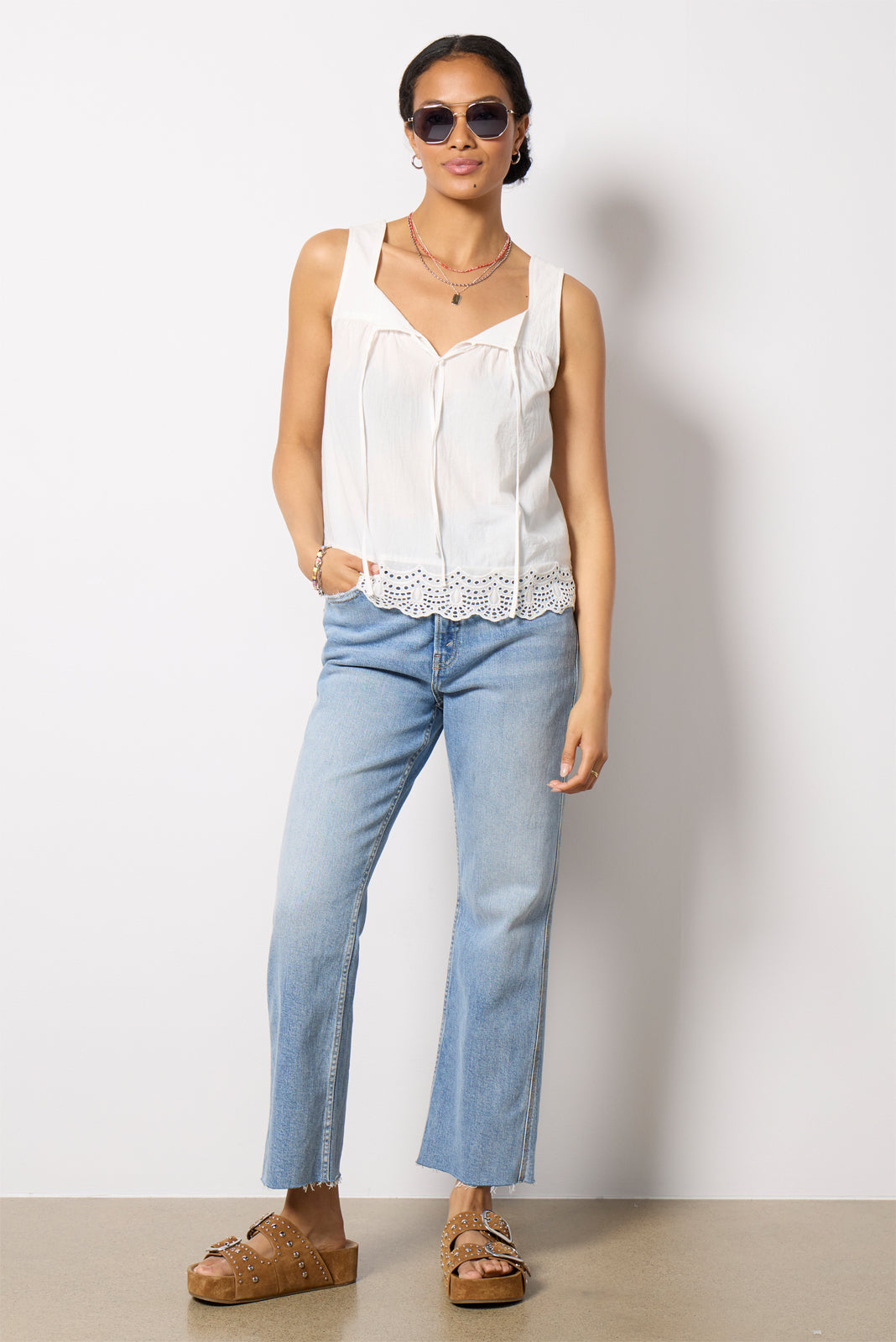A scalloped eyelet hem elevates this sweet and summery tank by EVEREVE. featuring a relaxed fit. flowy cotton fabric. and a square neckline with tie details.