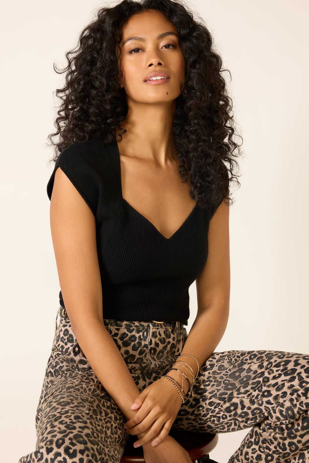 This sweater by LNA is the perfect transition piece for your wardrobe. featuring a v-neckline. cap sleeves. rib knit detailing. and a fitted silhouette.