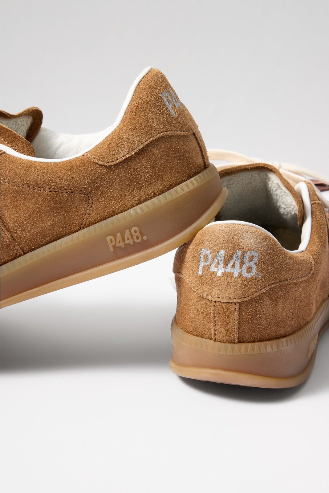 Finished in rich brown suede. the Monza Sneaker by P448 features a court-inspired design with a gum sole and two lace options.