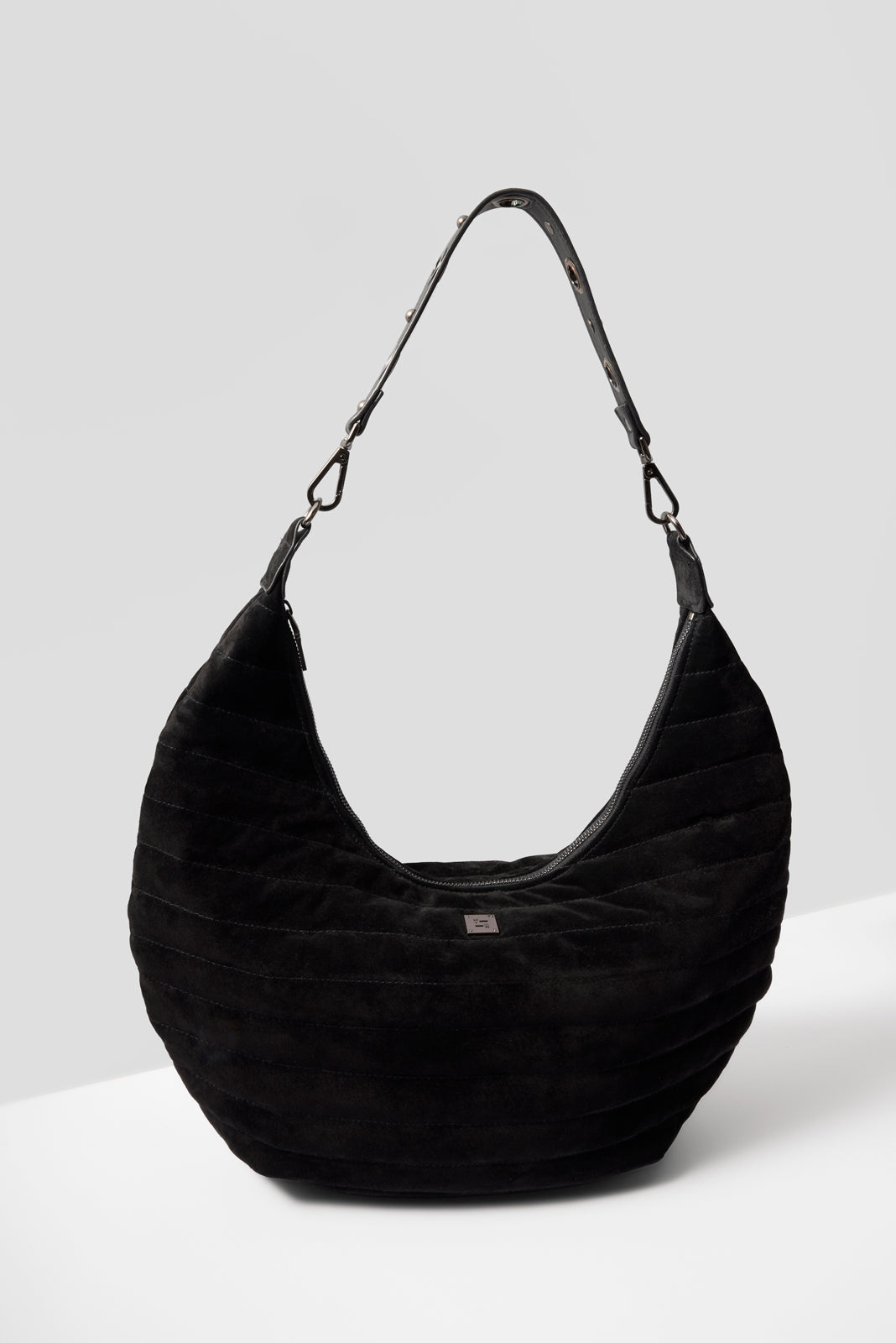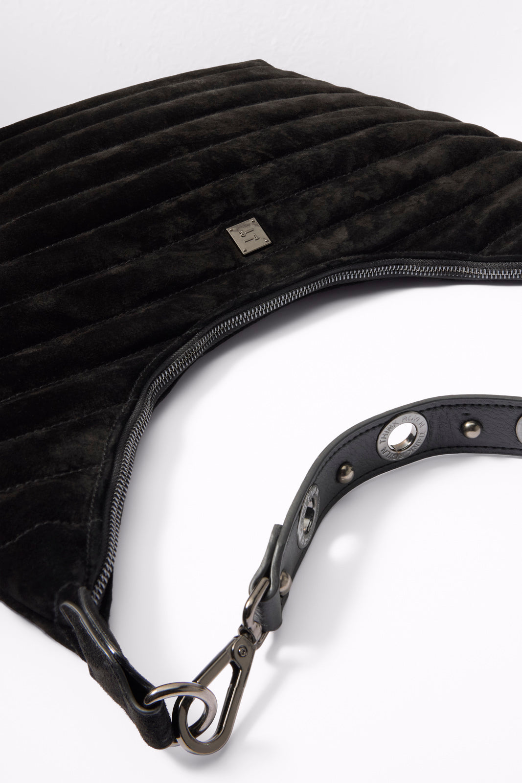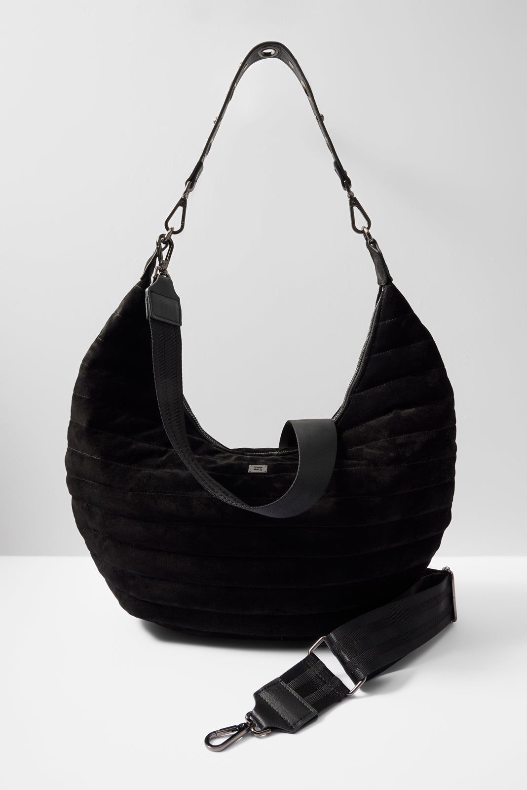 Soft black suede makes the Moonstruck Hobo Bag by Think Royln the perfect night out accessory. featuring a top zip closure and two detachable strap options—a grommet strap to wear on the shoulder or an adjustable crossbody strap to go hands-free.