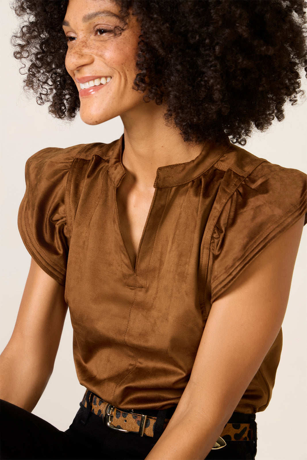 Feminine flutter sleeves elevate this stylish faux suede top by Melissa Nepton. finished with a split neckline and vertical center seam detail.