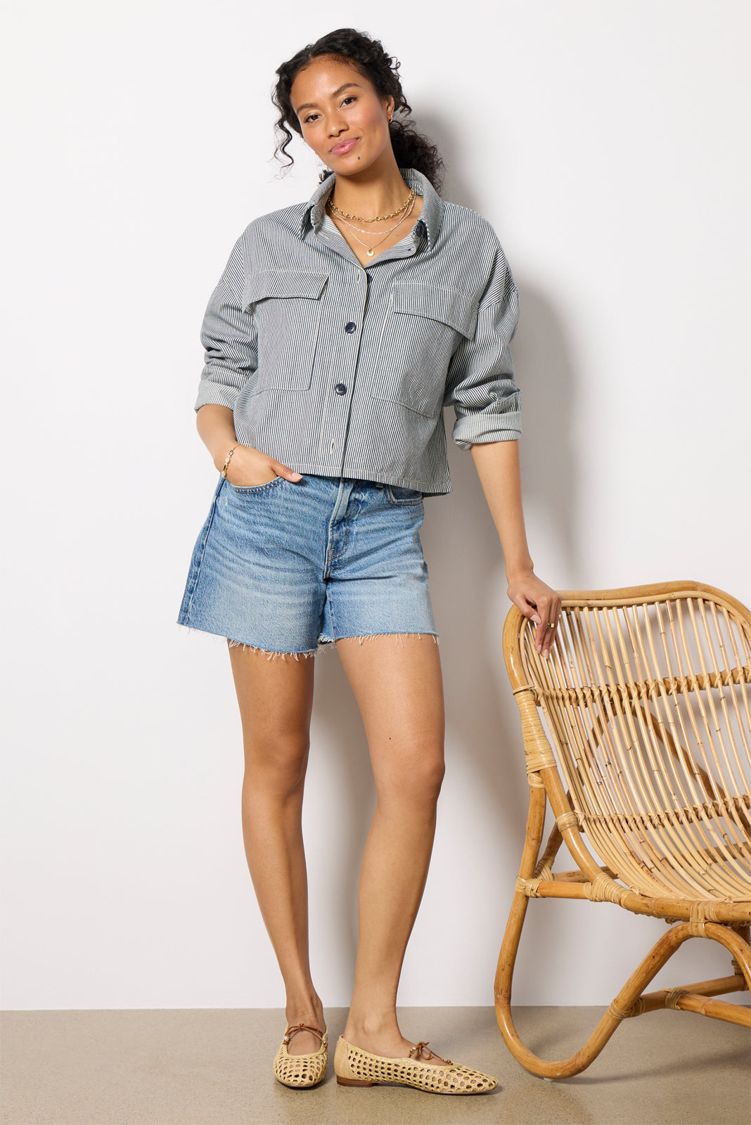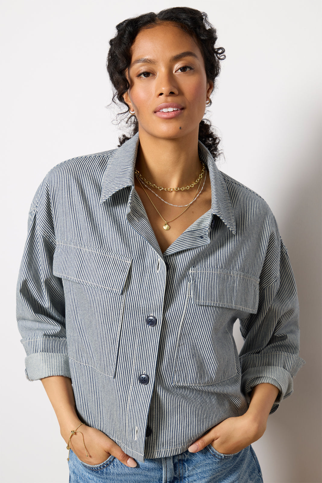Perfect for wearing alone or layered. this Sanctuary shirt jacket is finished in coastal-style stripes and features a cropped silhouette with front button closures and chest flap pockets.