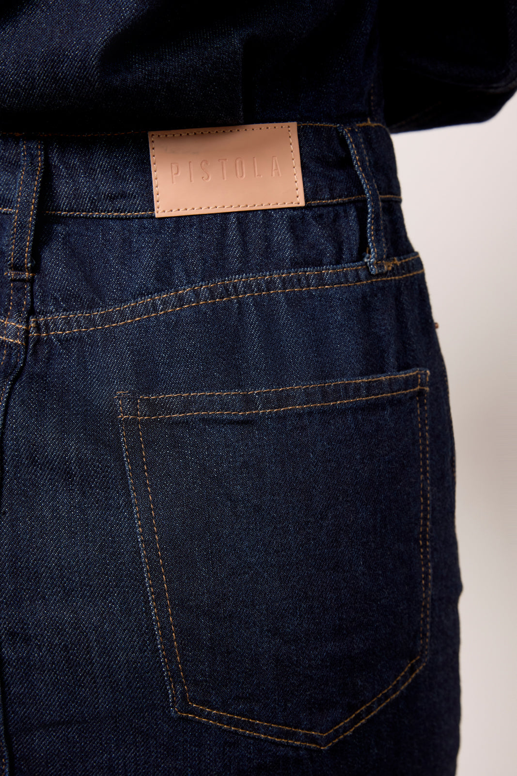 This denim dress by Pistola is perfect for your summer-to-fall rotation. Crafted from non-stretch cotton in a deep blue wash. the Nina Dress features a mini silhouette with a snap-front bodice. chest flap pockets. and belt loops at the waist.