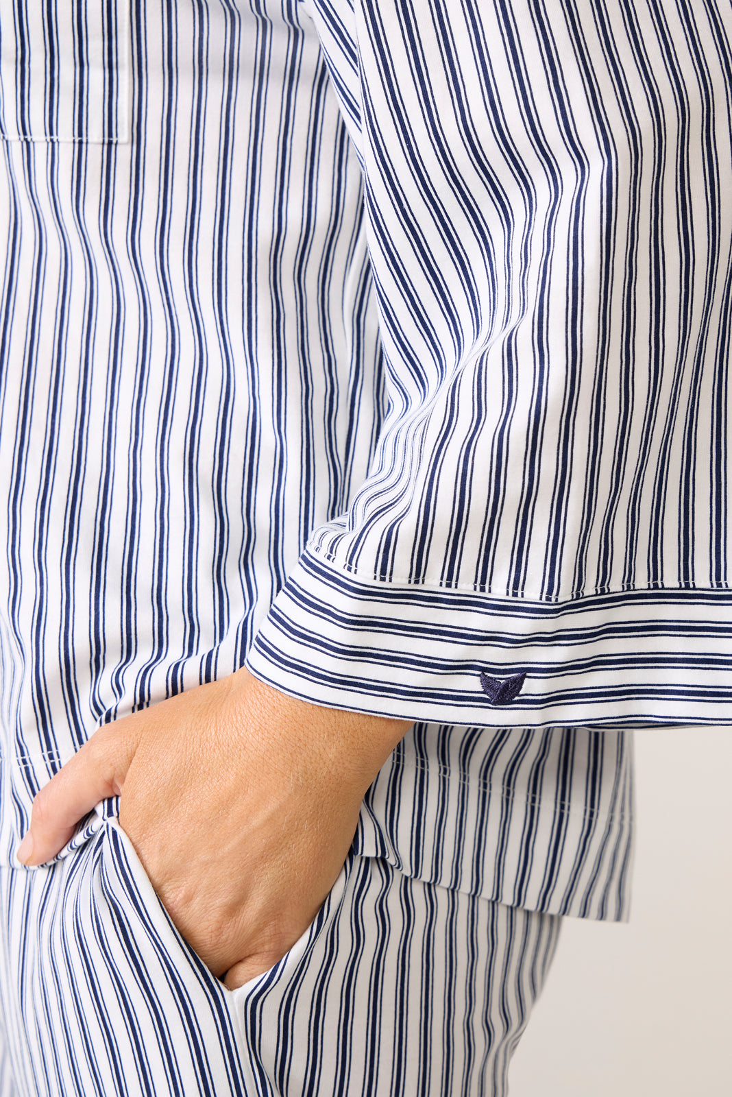 Elevate your sleepwear collection with the Olivia Wide Leg Pajama Set by Petite Plume. Finished in luxe striped Pima cotton. this two-piece pajama set features a relaxed. collared button-down shirt with three-quarter sleeves and comfy wide leg pants with side pockets and a drawstring waist.