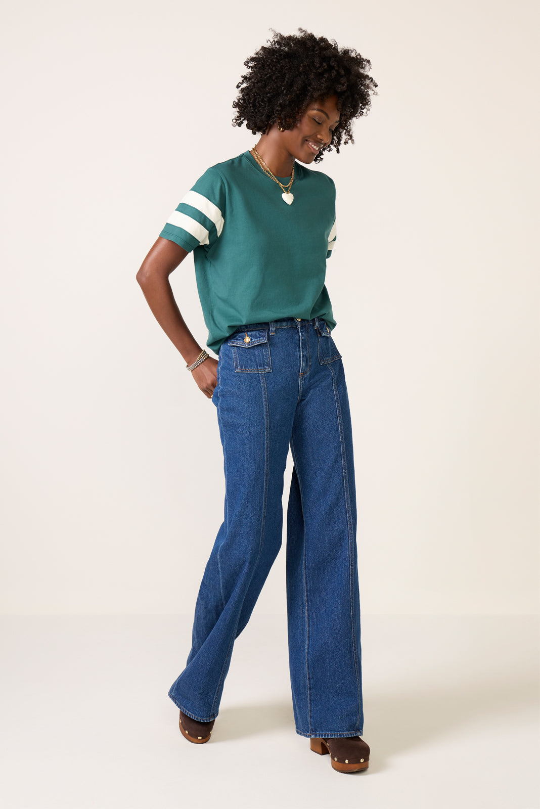 Crafted in soft cotton. this sporty tee by Clare V. features varsity stripes on the sleeves. a crew neckline. and a relaxed silhouette.
