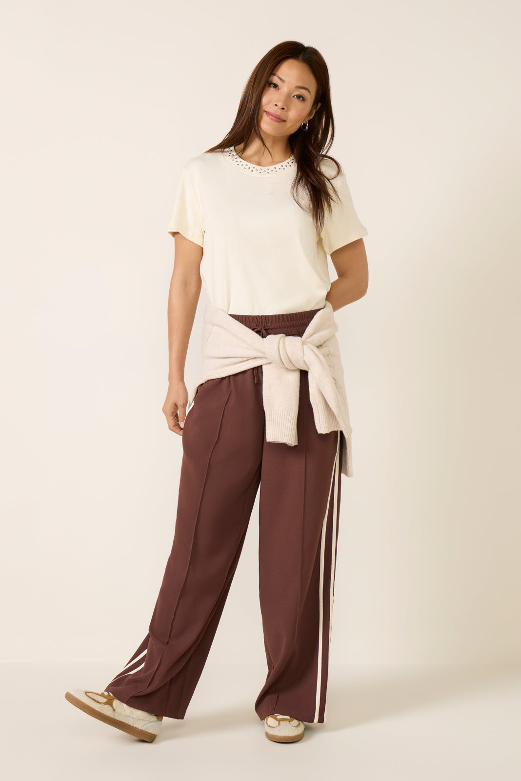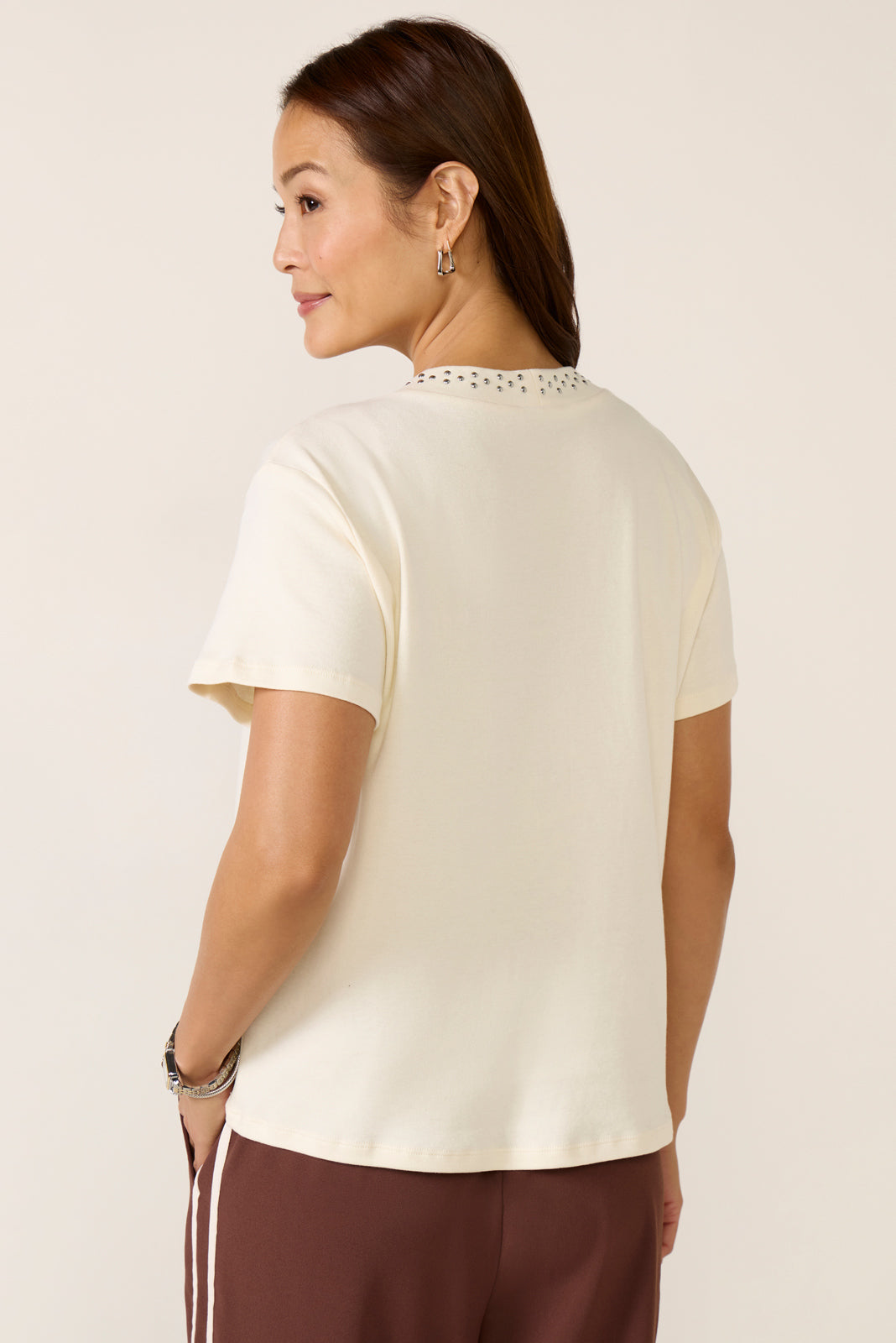 A studded collar adds a stylish edge to this elevated tee by LNA. featuring a crewneck silhouette. short sleeves. and soft cotton fabric.