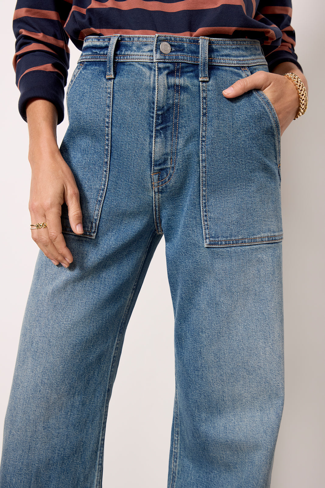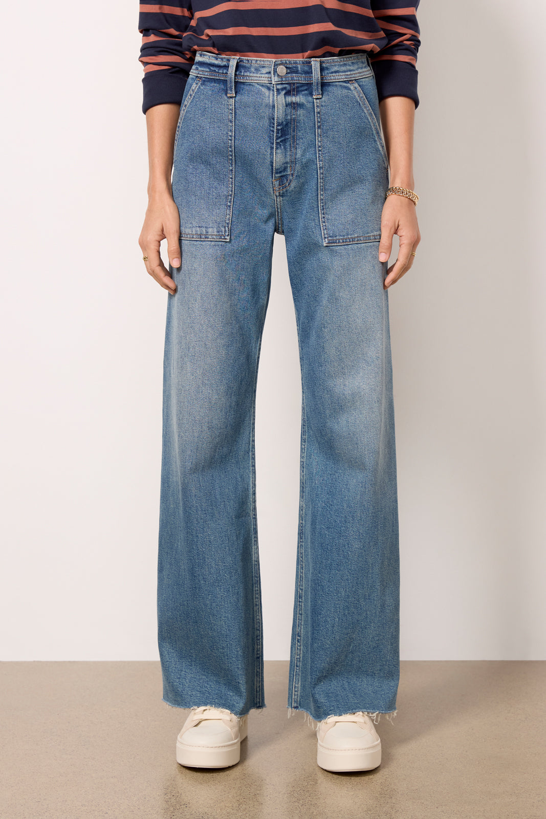 Perfect for day-to-night wear. the Penny wide leg jean by Pistola features a high-rise waist. raw hems. and front patch pockets for a hint of utility-inspired style.