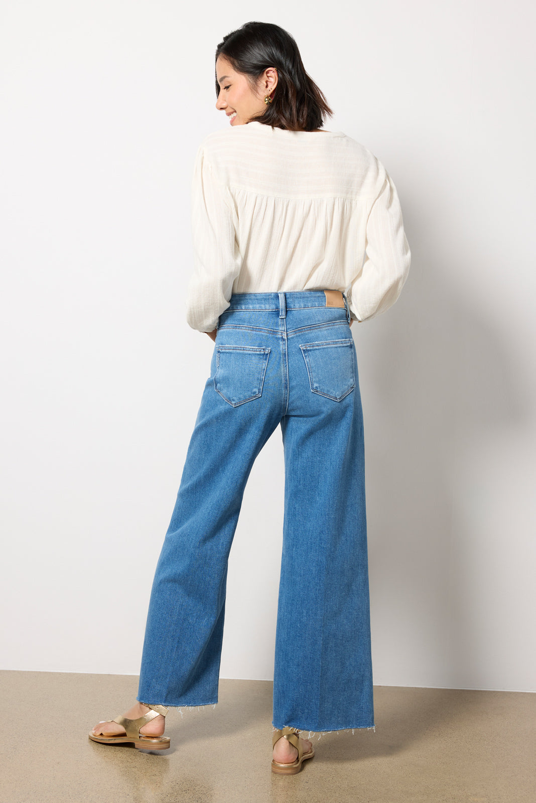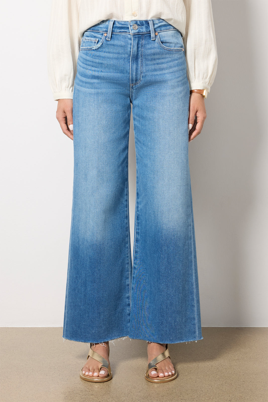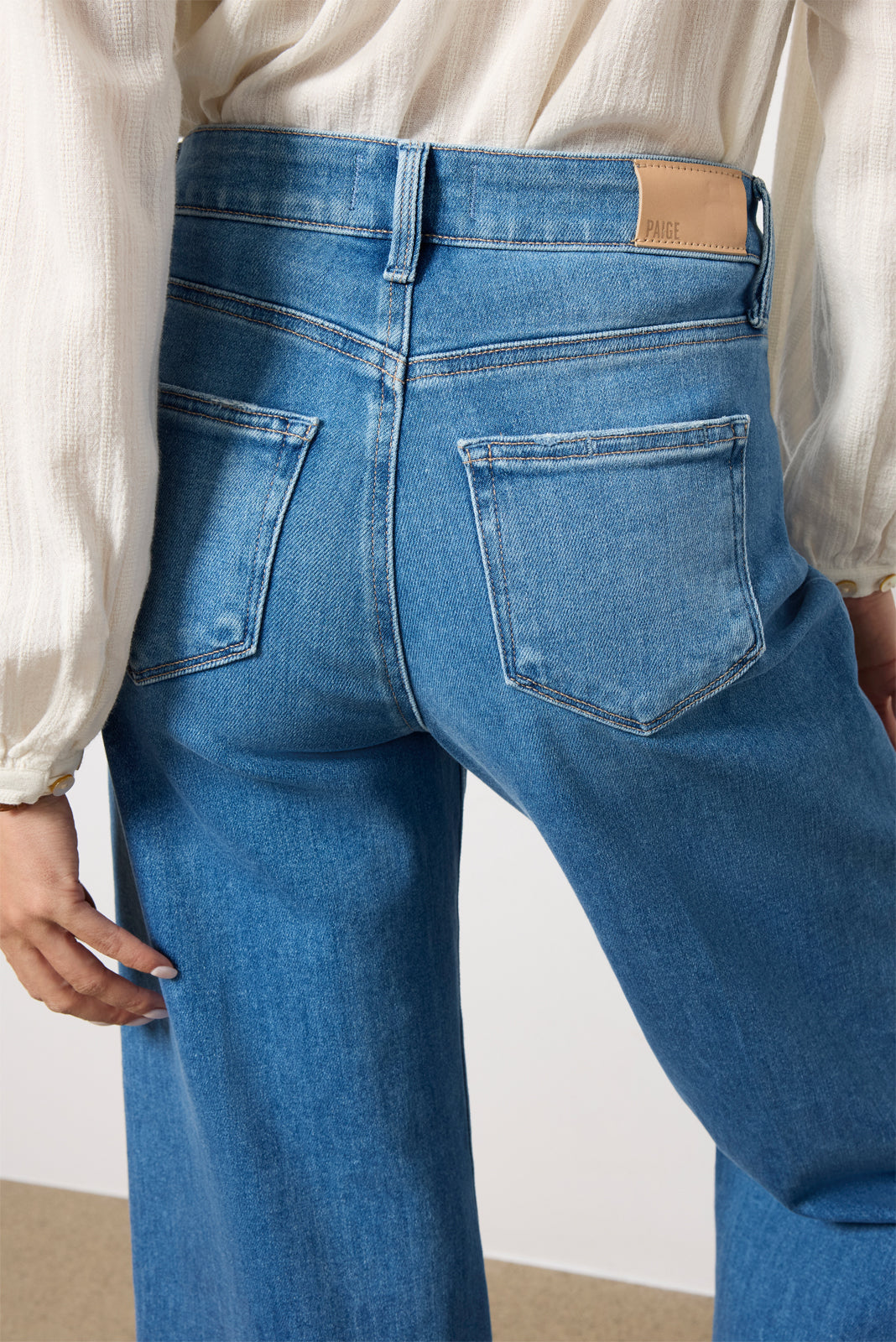 The wide leg jean you'll be wearing on repeat. Designed with a 29" inseam and higher knee and mid-thigh placements. these petite Paige jeans are crafted in soft stretch denim with a flattering high-rise fit. medium blue wash. and full-length raw hems.