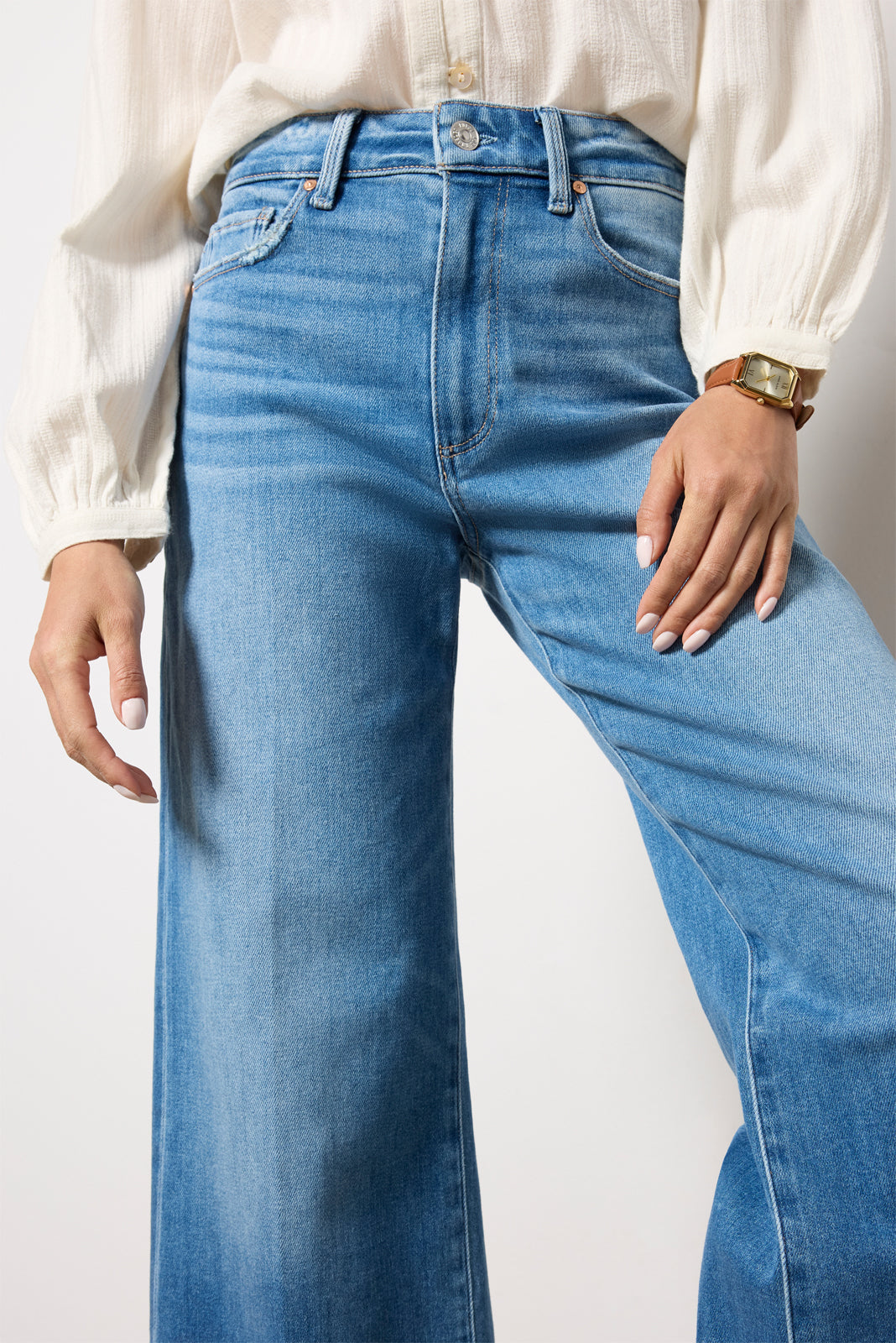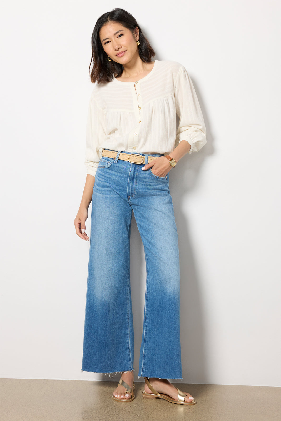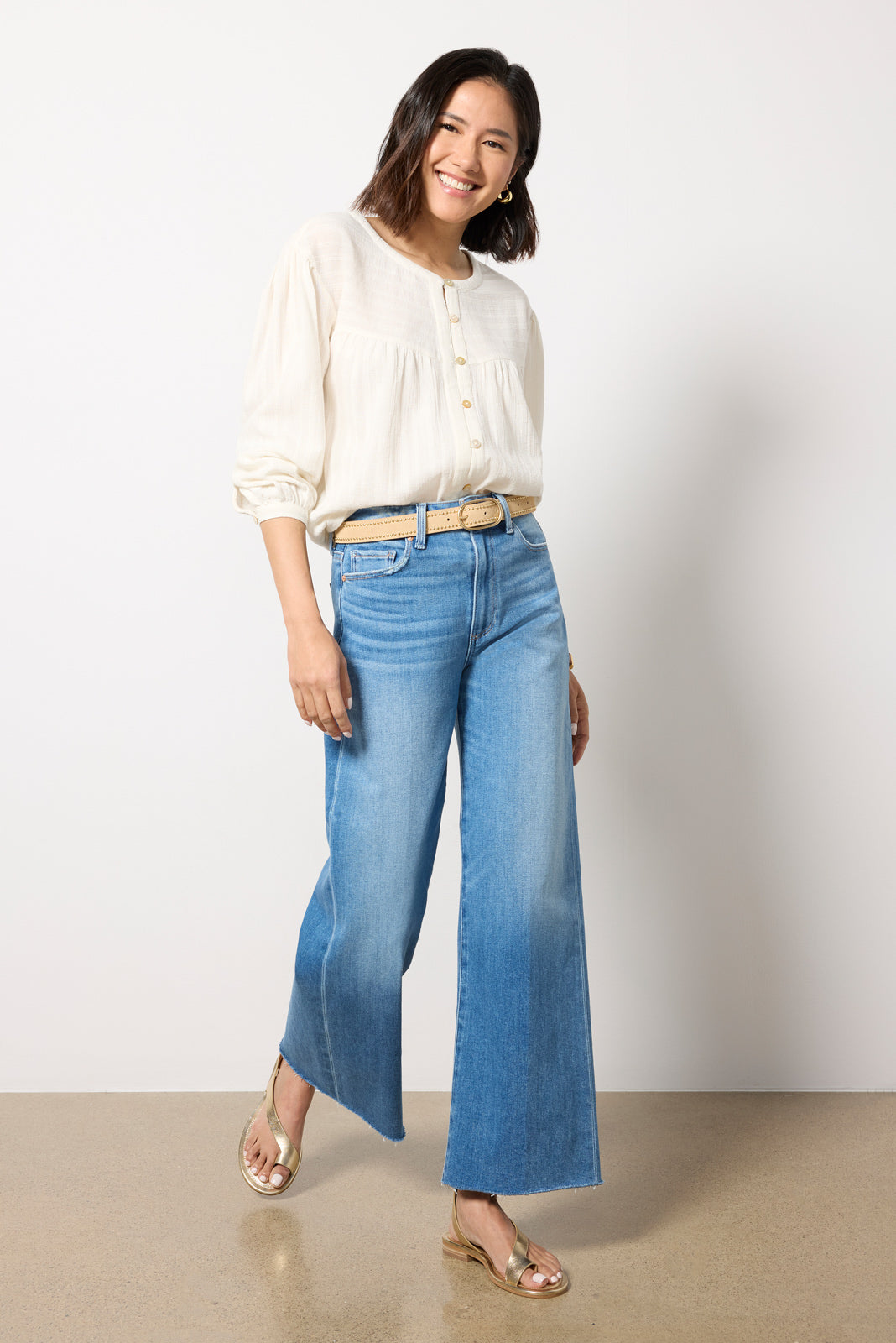 The wide leg jean you'll be wearing on repeat. Designed with a 29" inseam and higher knee and mid-thigh placements. these petite Paige jeans are crafted in soft stretch denim with a flattering high-rise fit. medium blue wash. and full-length raw hems.