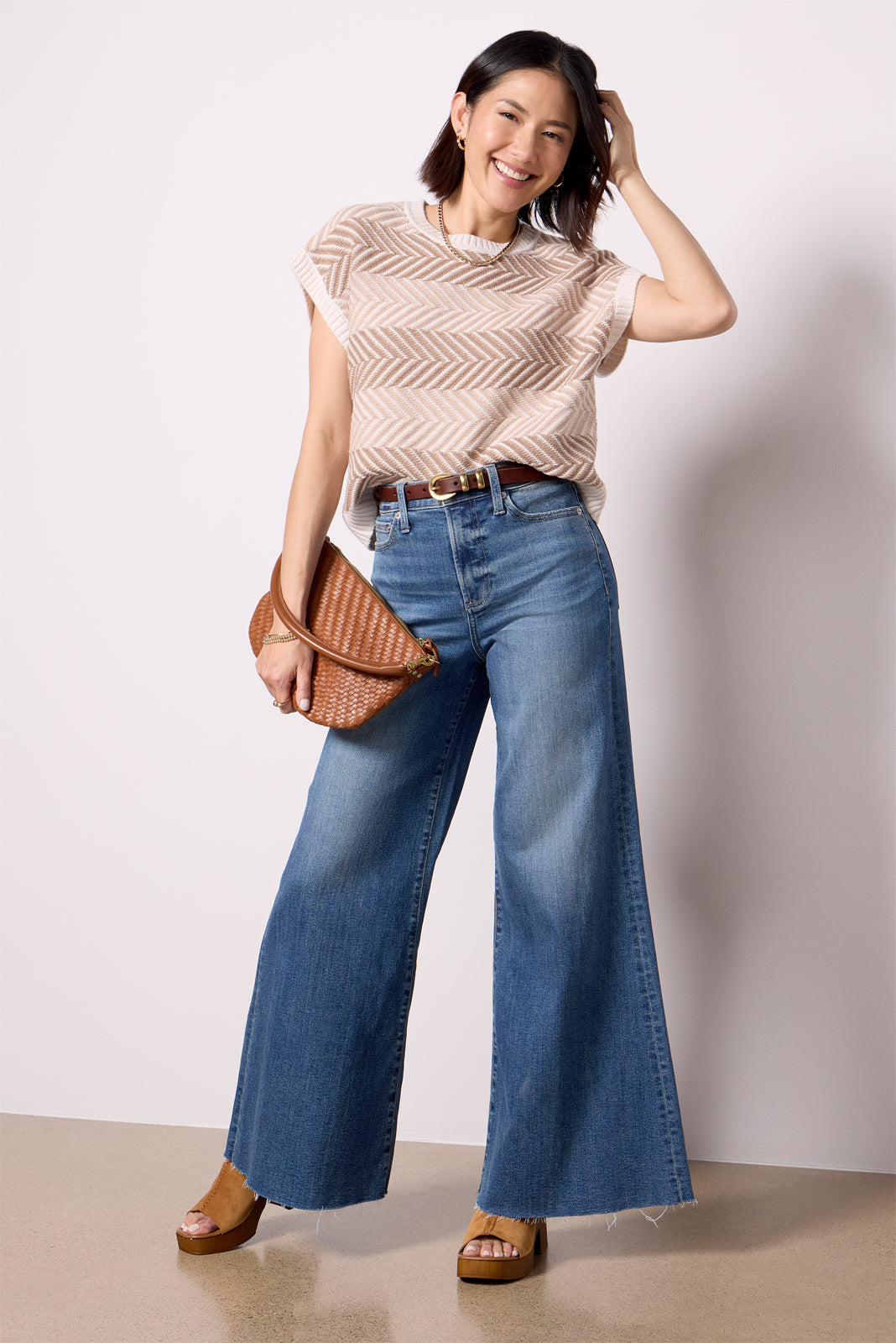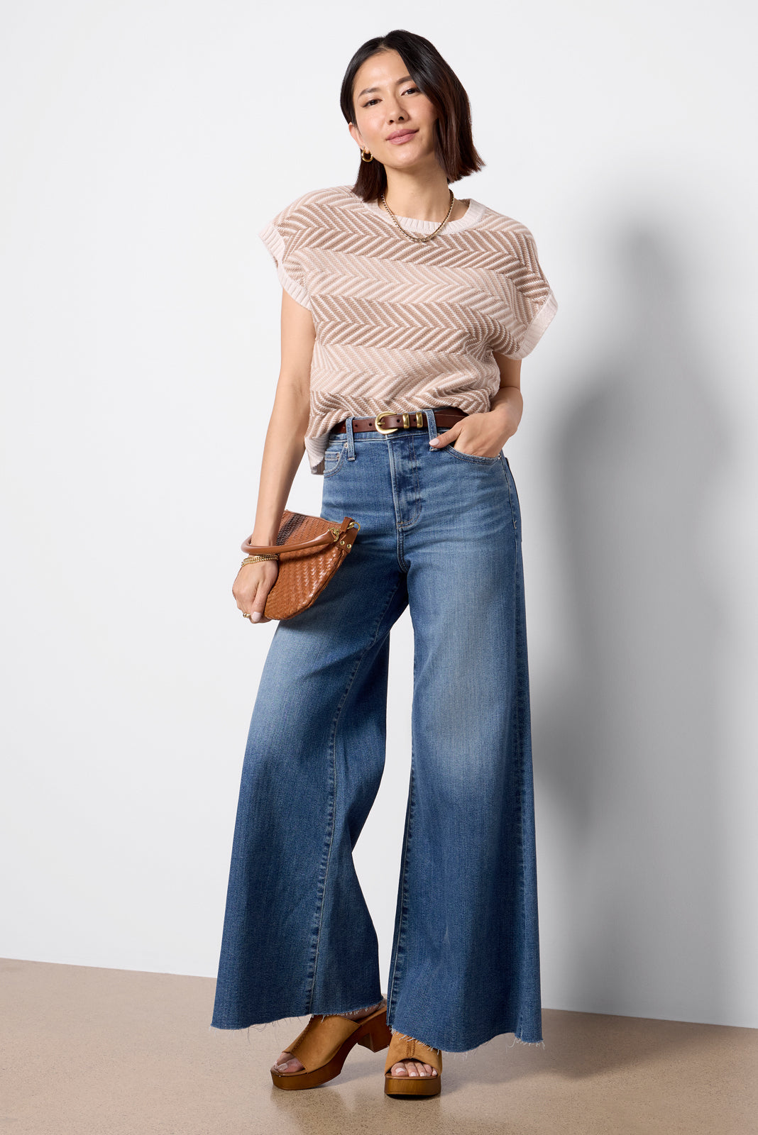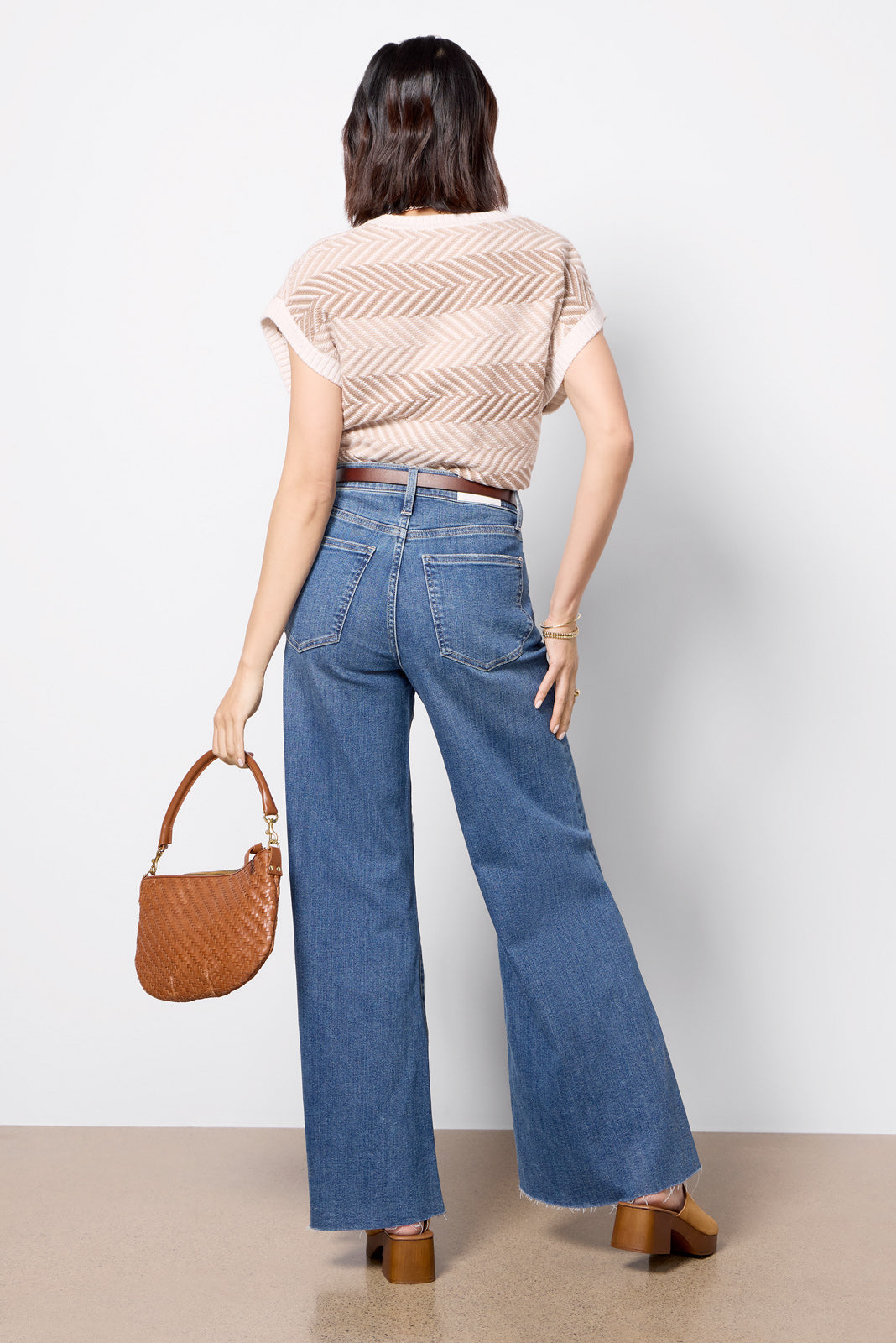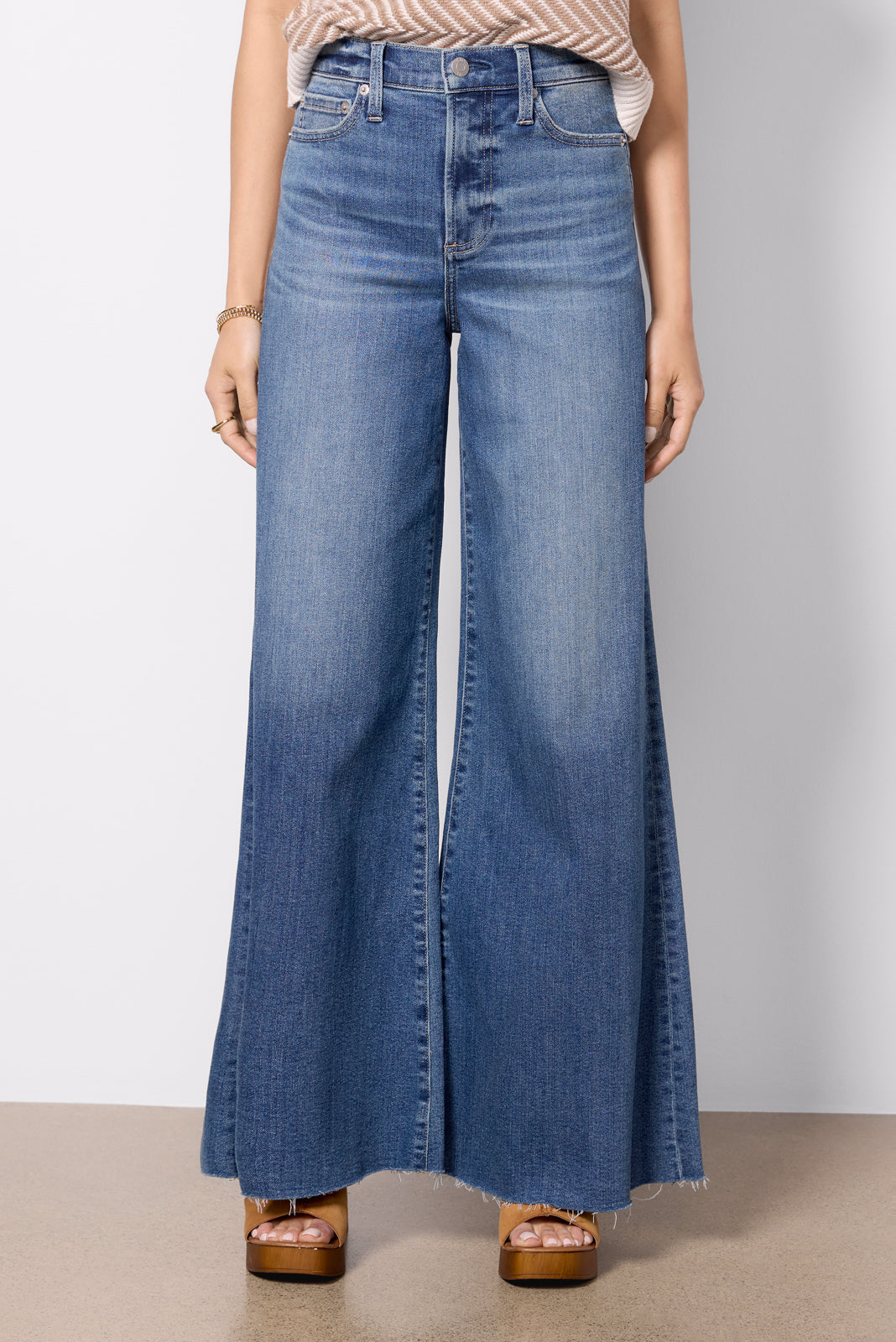 The Petite Izzy wide leg jean by Pistola will take you from day to night in style. Designed with a shorter rise and inseam for petite frames. this mid-rise jean features an exaggerated wide leg. full-length raw hems. and a faded blue wash.