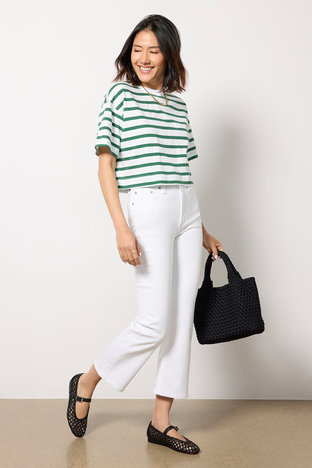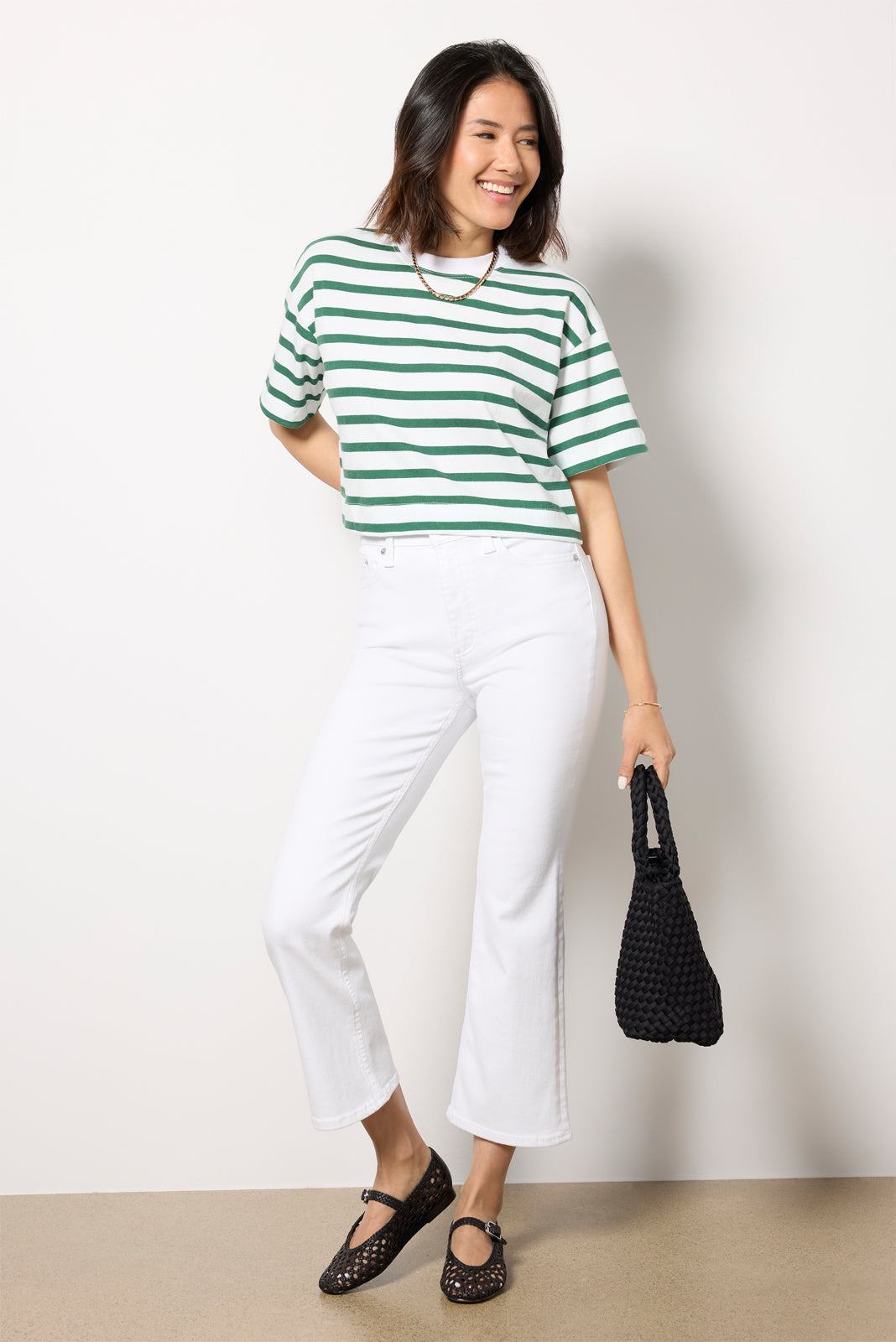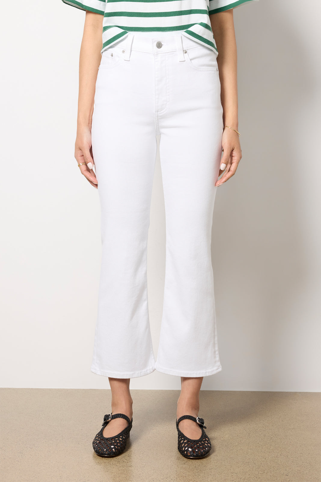 Designed with a shorter rise and inseam for petite frames. the Lennon petite bootcut jean by Pistola is crafted in soft stretch denim and features a high-rise fit. bright white wash. and clean hems cropped at the ankle.