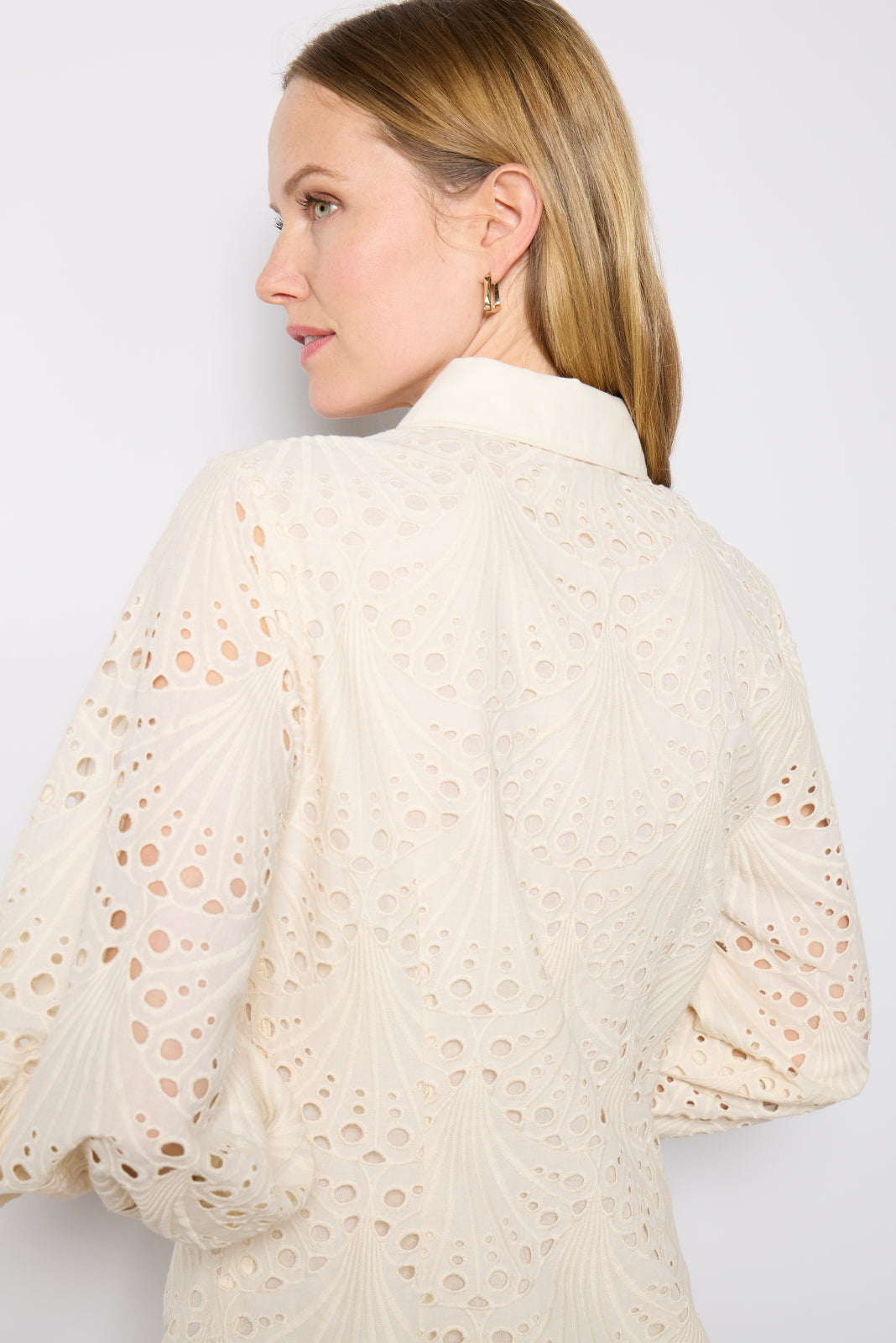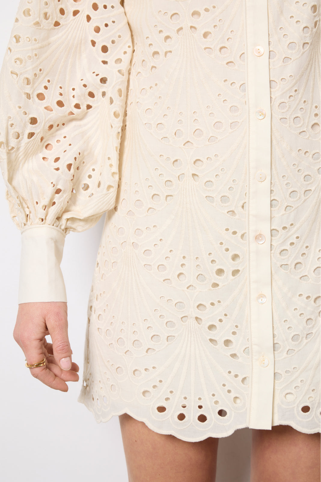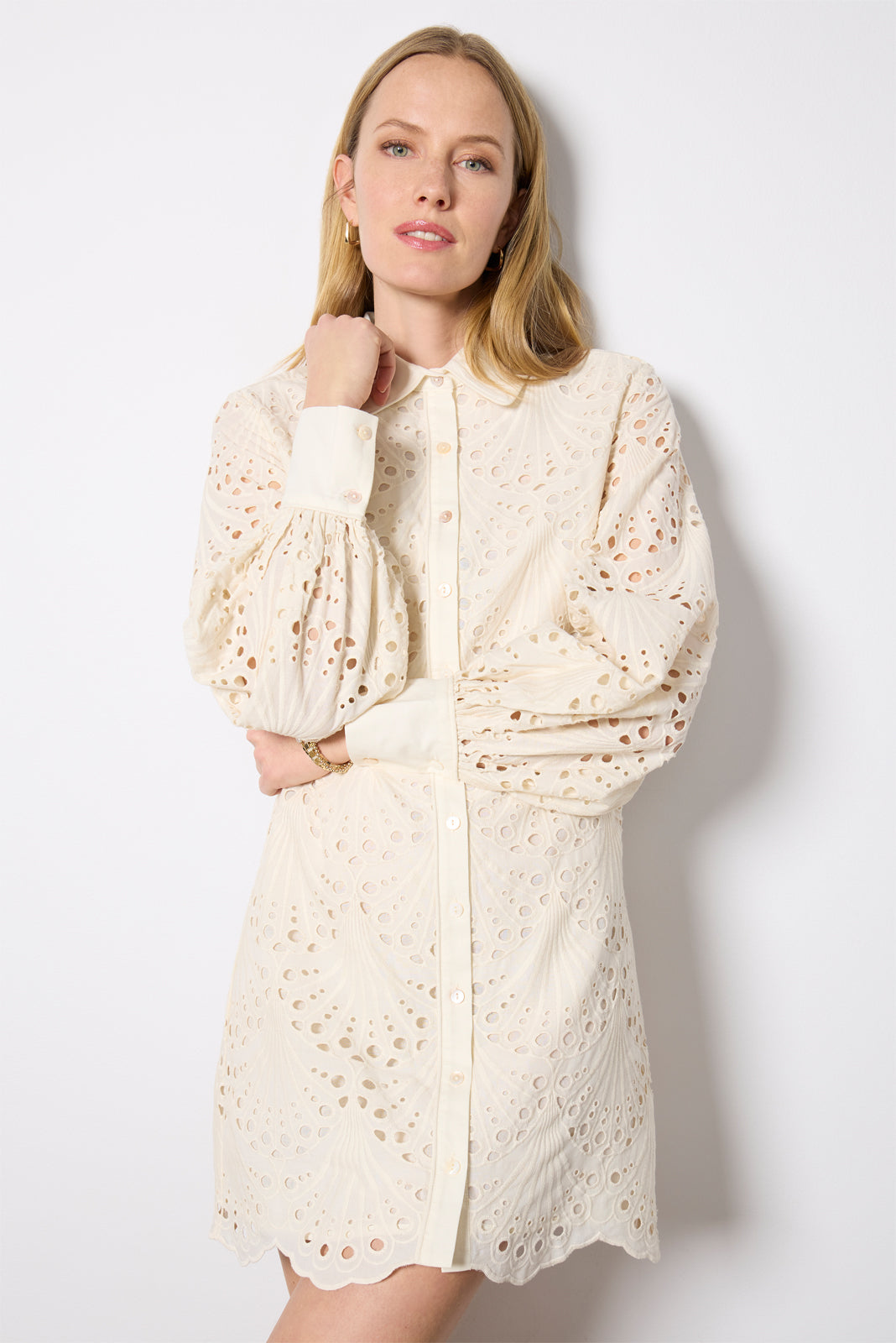 Elevate your spring dress collection with the Piper mini shirt dress by KIVARI. Finished with a shell design and eyelet embroidery. this chic button-front dress features a lined body. scalloped hem. and unlined puff sleeves.