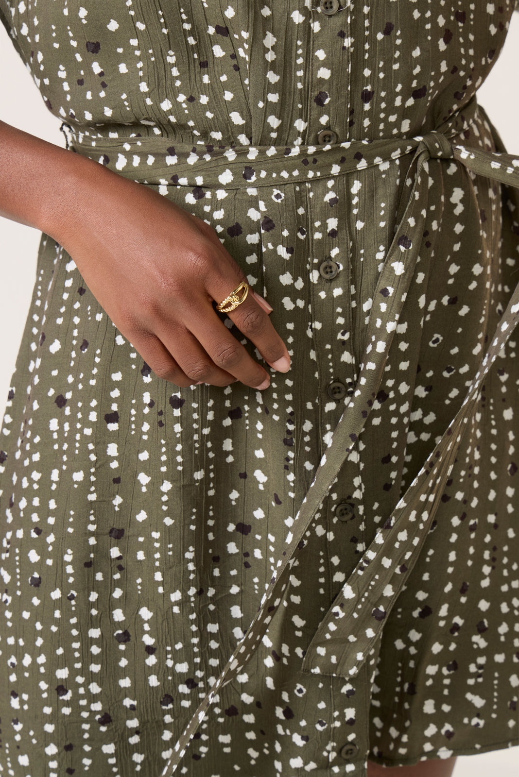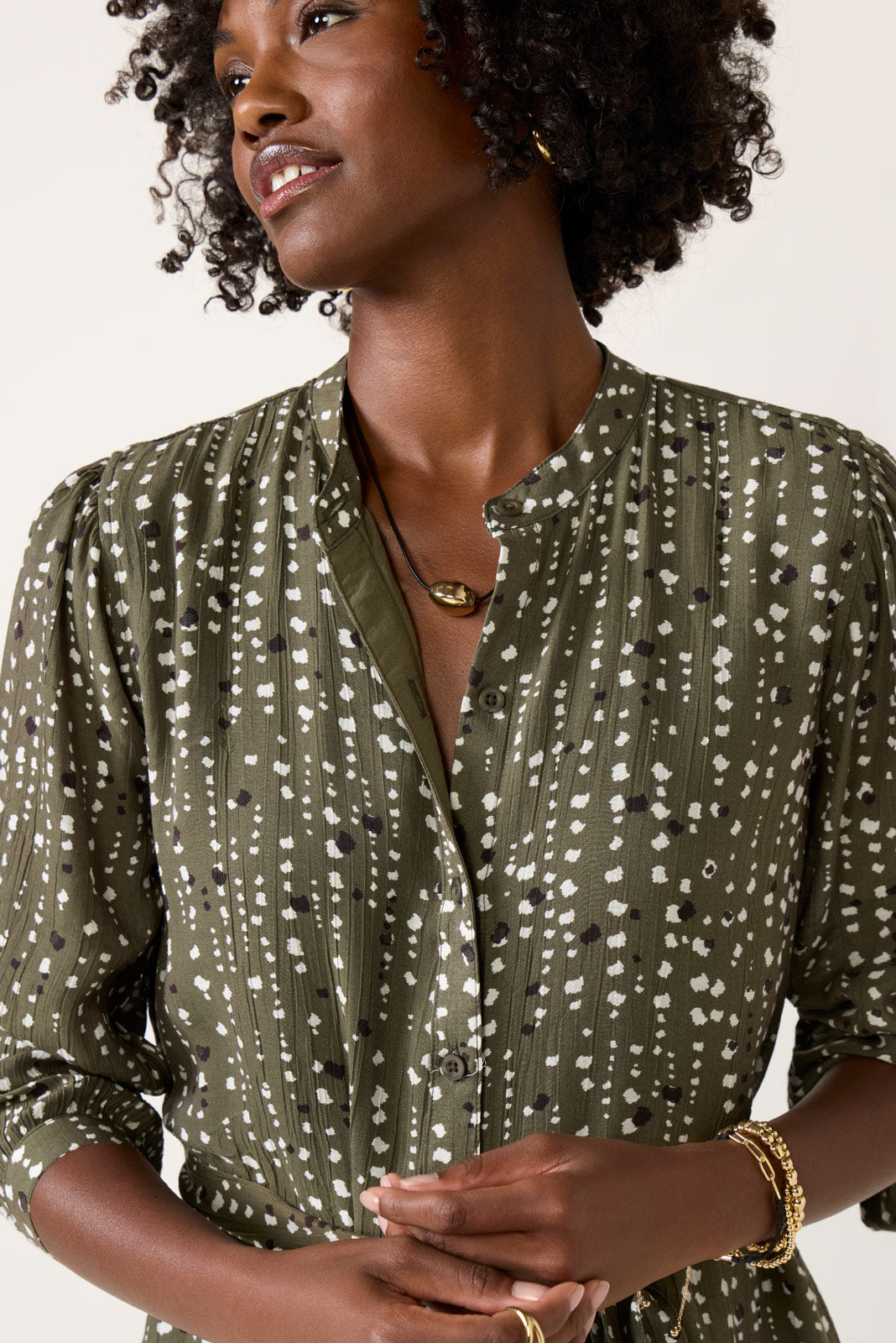 A tie waist fabric belt defines this easy shirt dress by Cloth and Stone. featuring a mandarin collar. front button closures. and long puff sleeves.