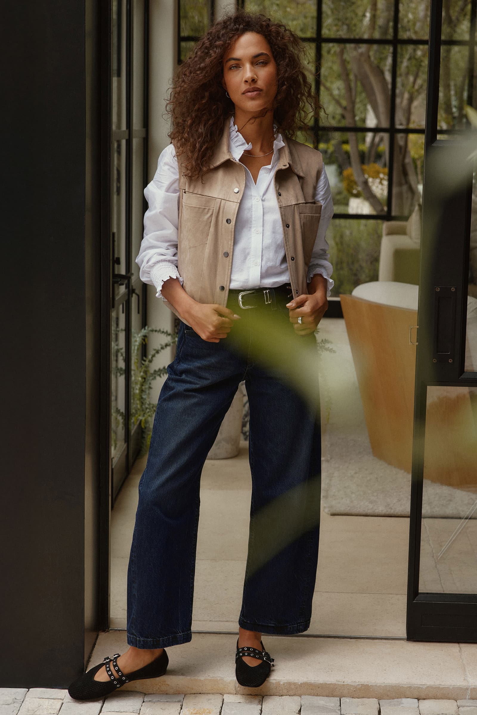 The Reagan Faux Suede Vest by EVEREVE is the perfect finishing touch to all your fall looks. featuring a classic collar. snap button closures. two chest pockets. and a cropped silhouette.