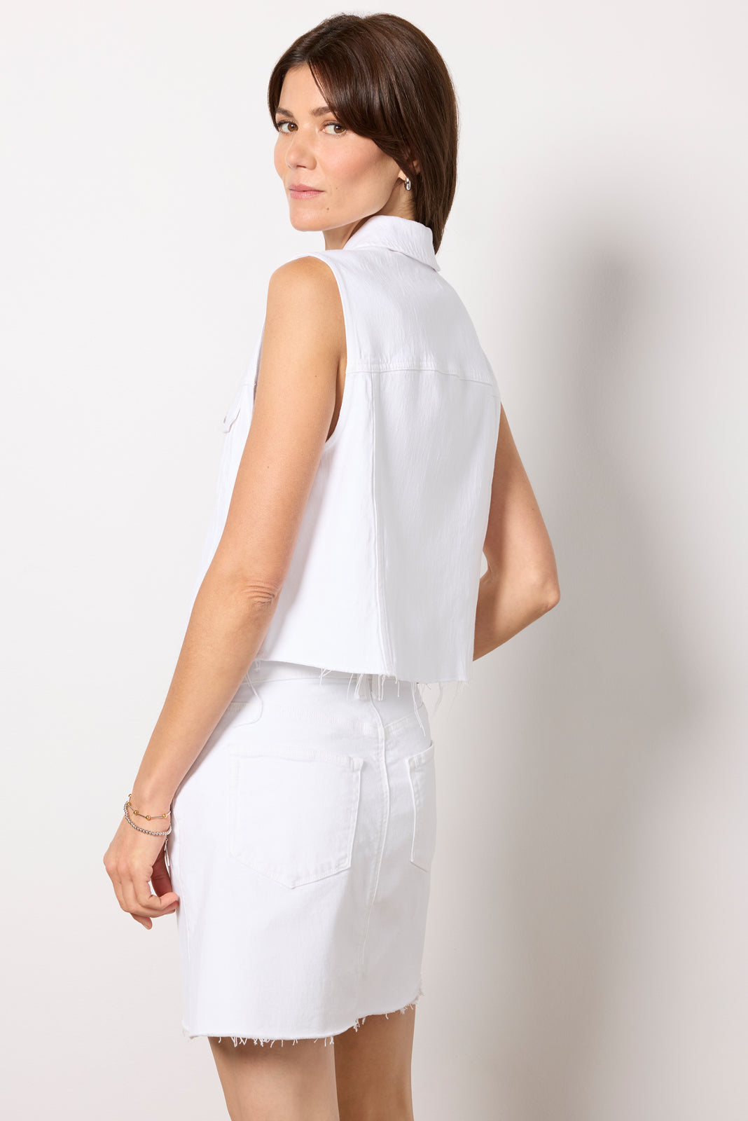 Refresh your layering collection with the Robbie denim vest by EVEREVE. Finished in cotton-blend denim. this versatile jean vest features a cropped raw hem. front button closures. and chest pockets.