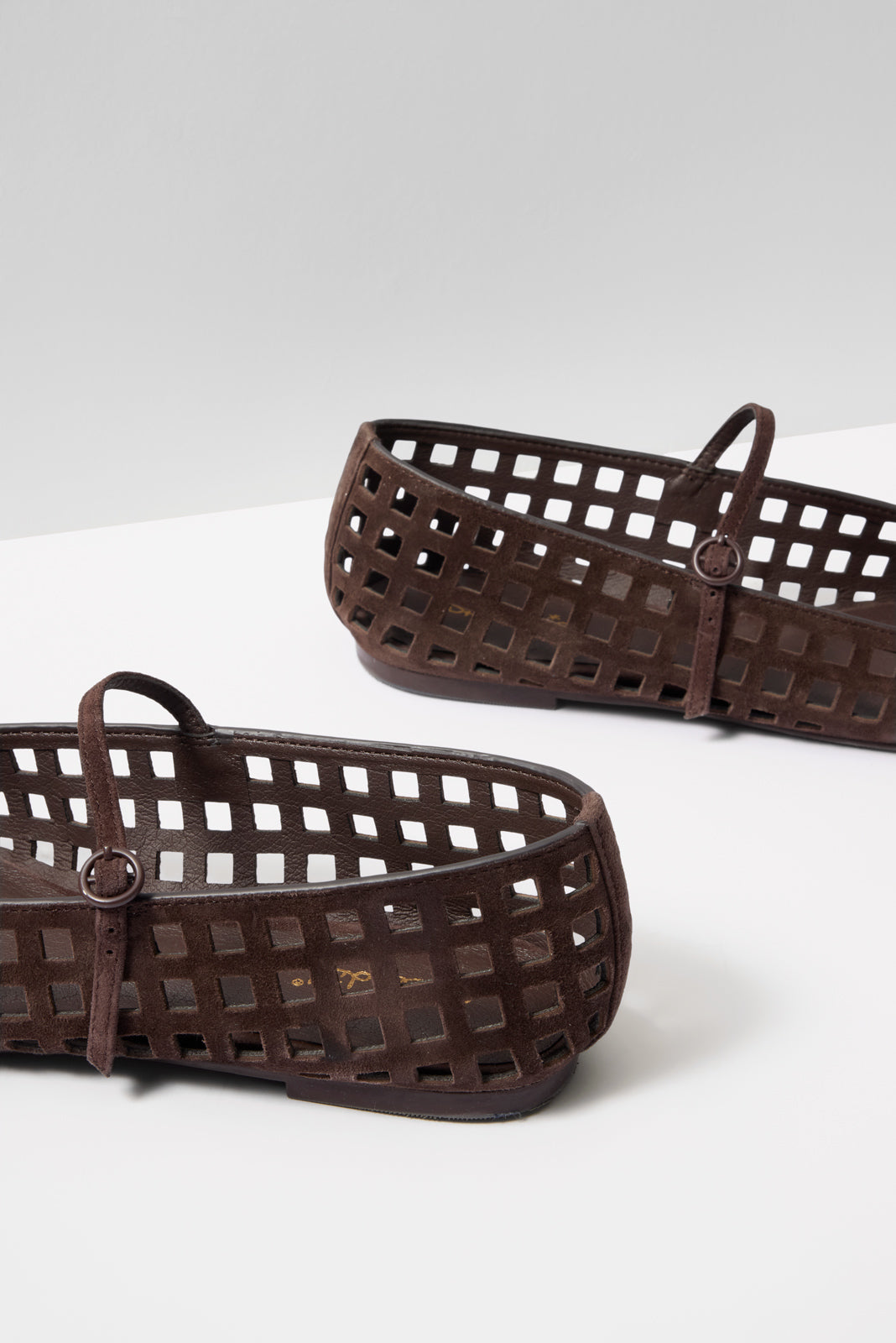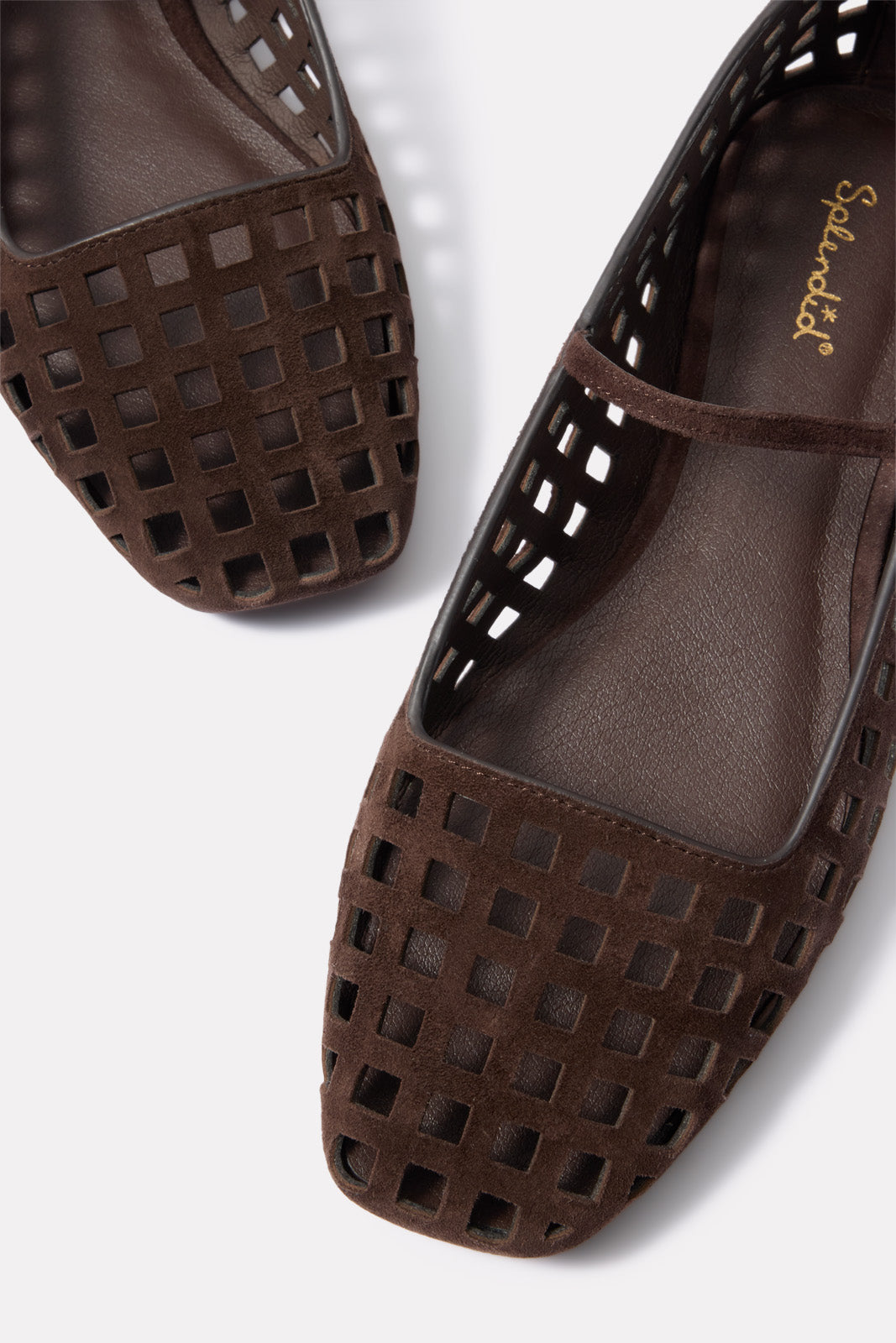 Rich chocolate suede and a breathable cutout design define these stylish Mary Jane ballet flats by Splendid Footwear. topped with an adjustable buckle strap.