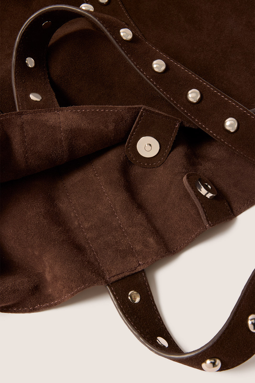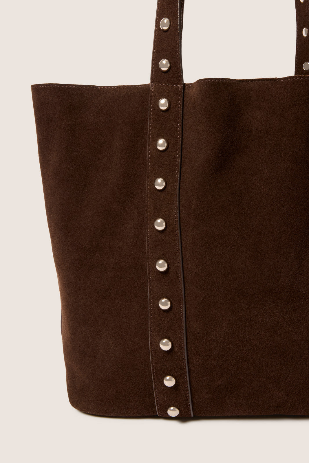 Make a statement with this stylish suede tote bag by EVEREVE. Finished with edgy studded straps for a touch of attitude. the Sloane tote bag features a magnetic snap closure and a roomy interior for all your essentials—making it a must-have for work. weekend. and everywhere in between.