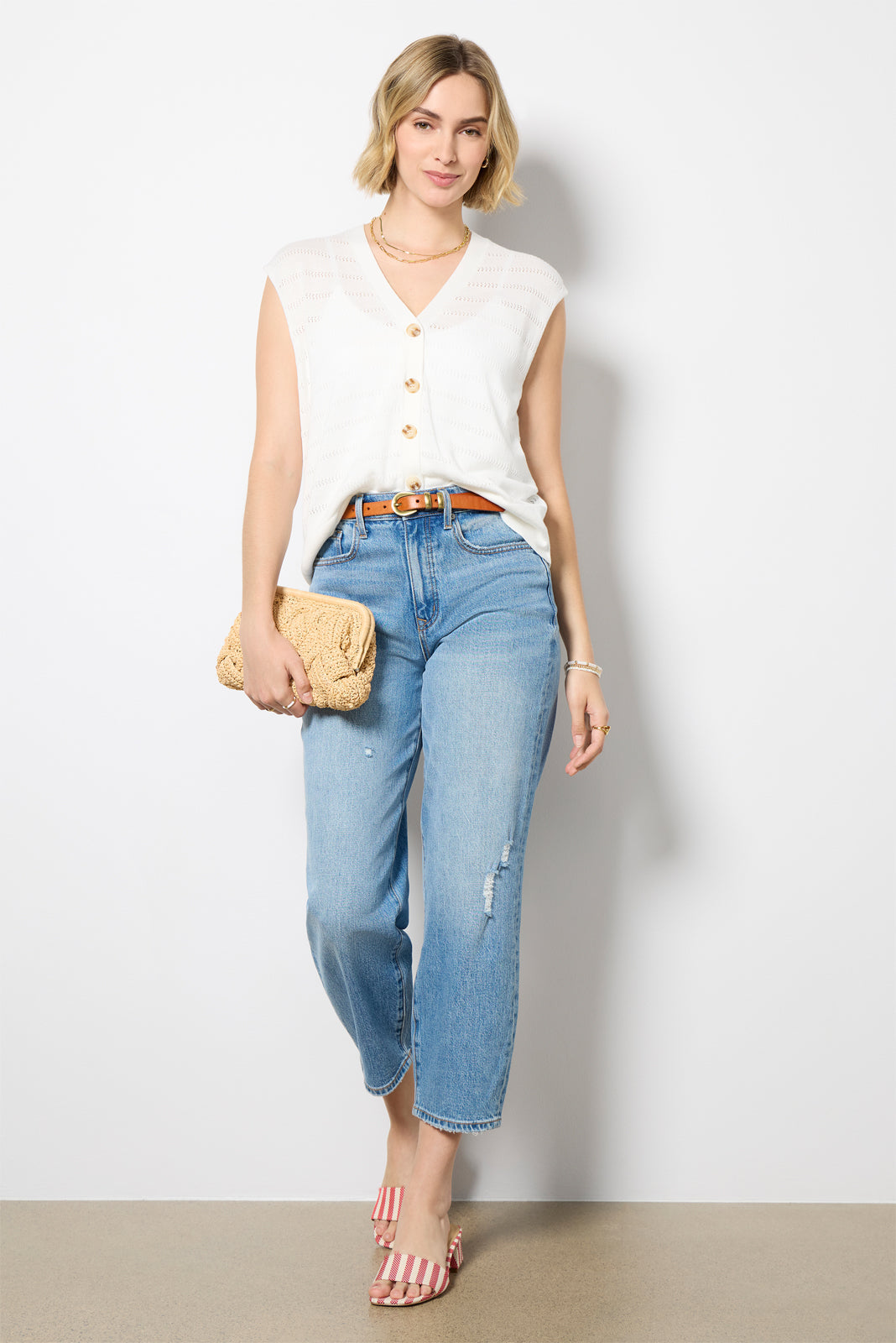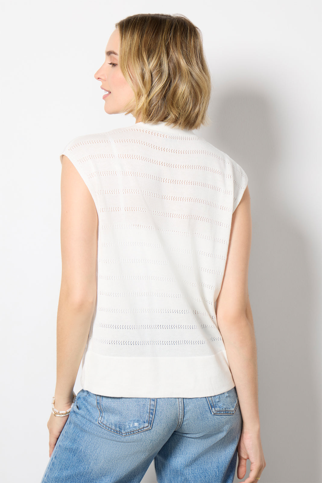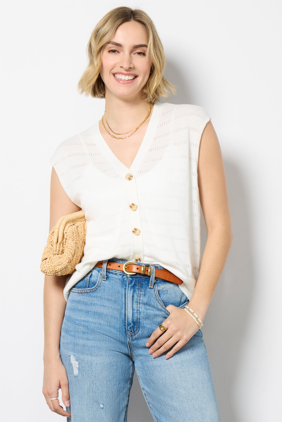 Chic and summer-ready. the St. Kitts sweater tank by EVEREVE features a relaxed v-neck silhouette. finished in a semi-sheer knit with pointelle stripes and front button closures.