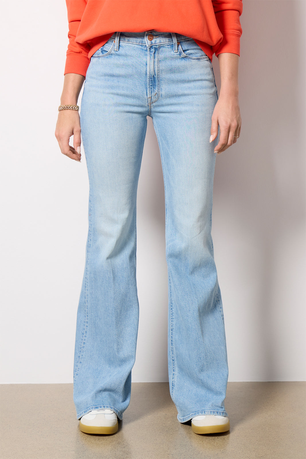 Crafted in stretch cotton denim. The Doozy Jean from MOTHER features a mid-rise waist. a flattering bootcut silhouette. and a versatile clean blue wash.