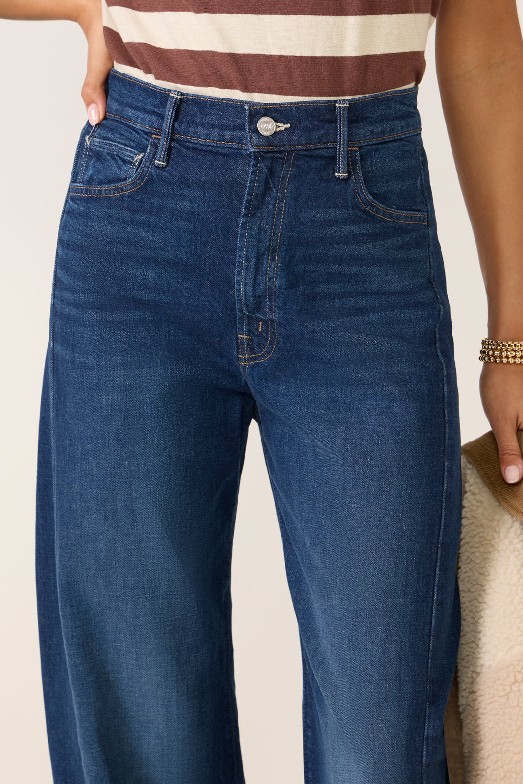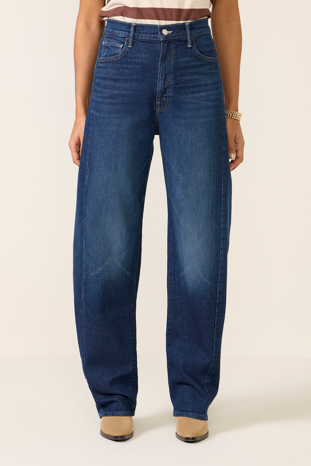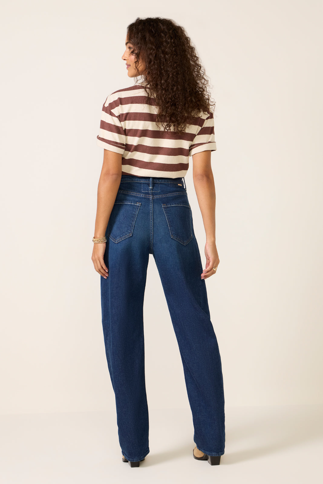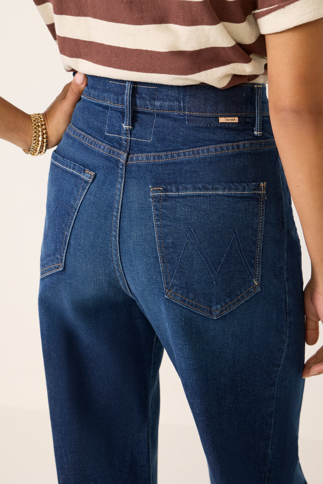 Crafted from soft stretch cotton denim. The Full Pipe Skimp by MOTHER features a high-rise waist designed to sit the hips. a barrel leg silhouette. and a full-length inseam with clean hems.