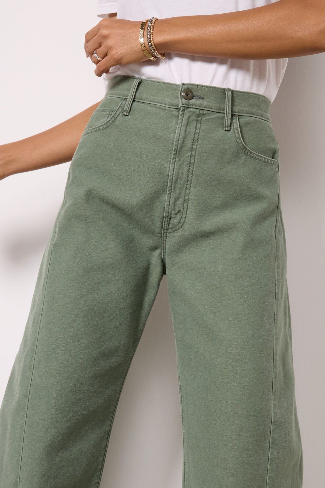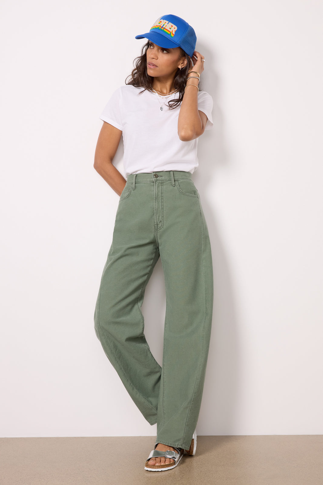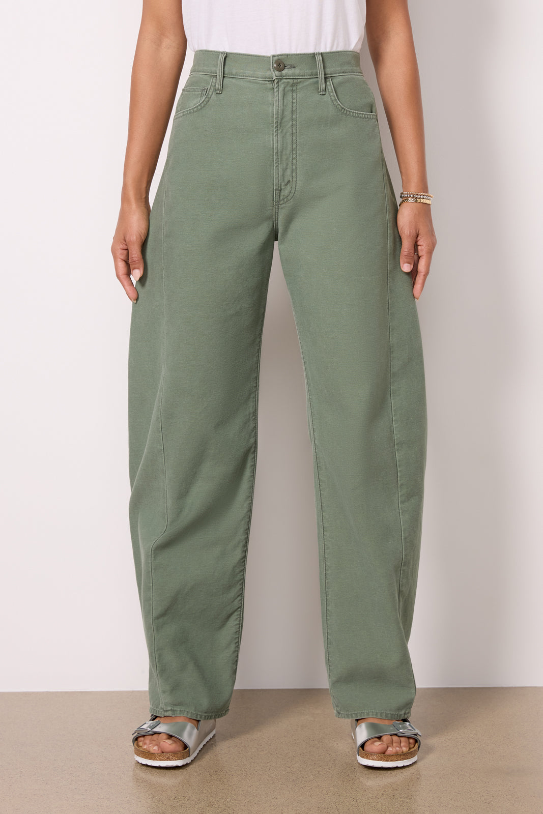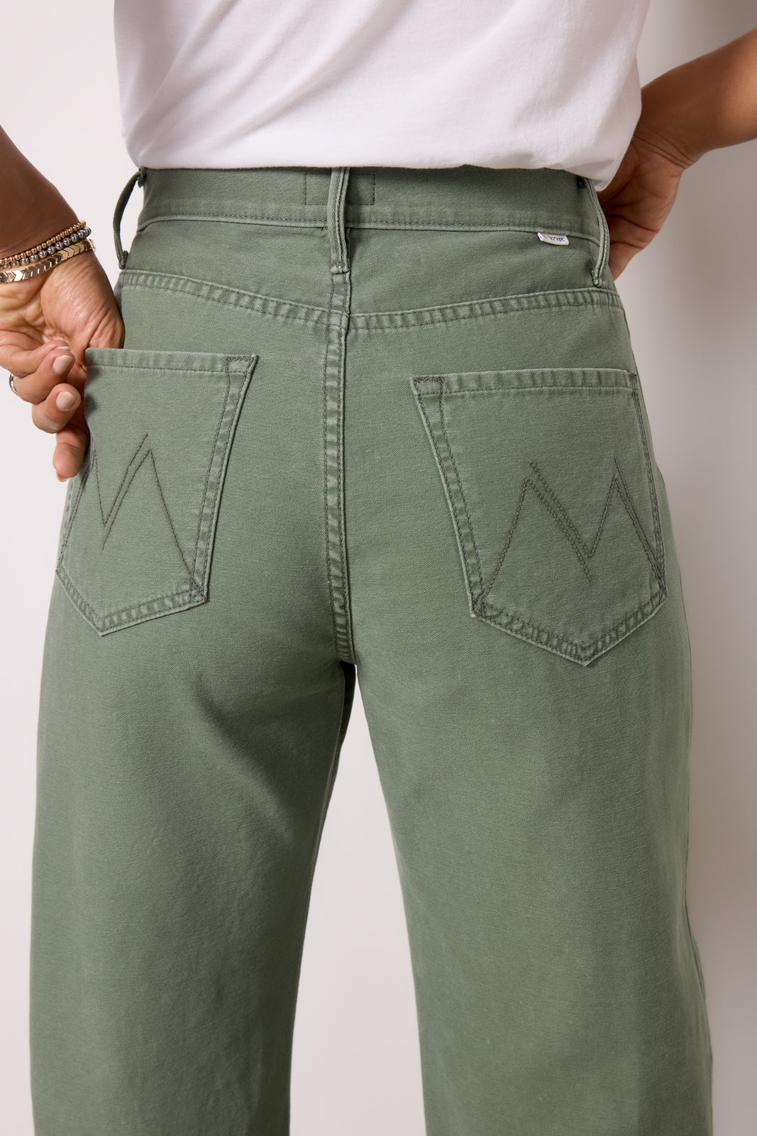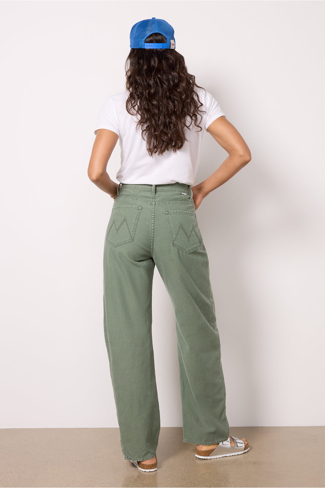 Designed with a full-length barrel leg. the Full Pipe Skimp pant by MOTHER features a high-rise waist. classic 5-pocket styling. and cotton fabric in an army green hue.