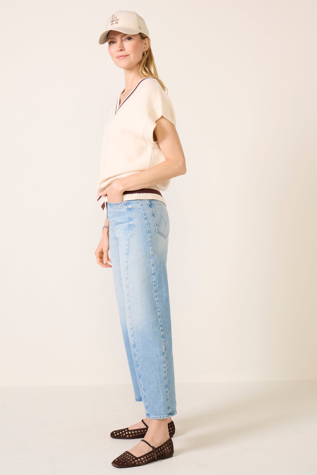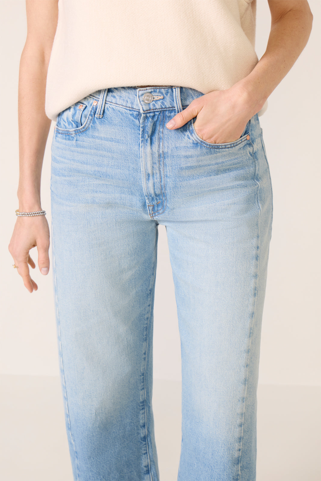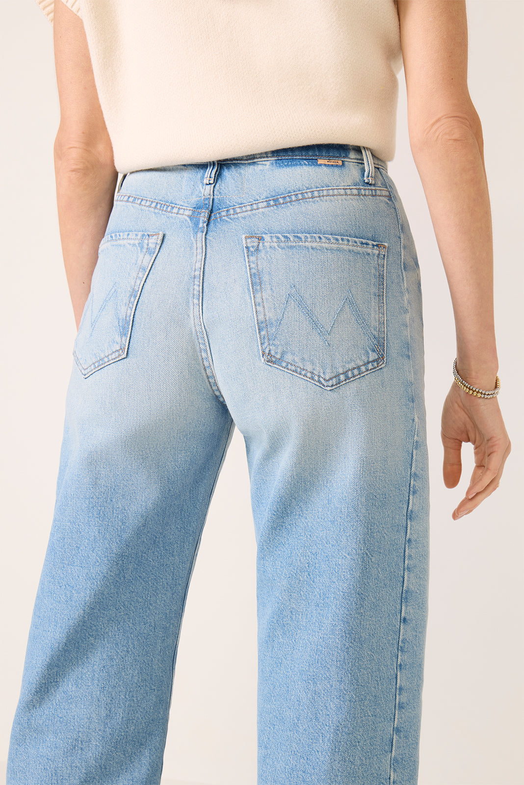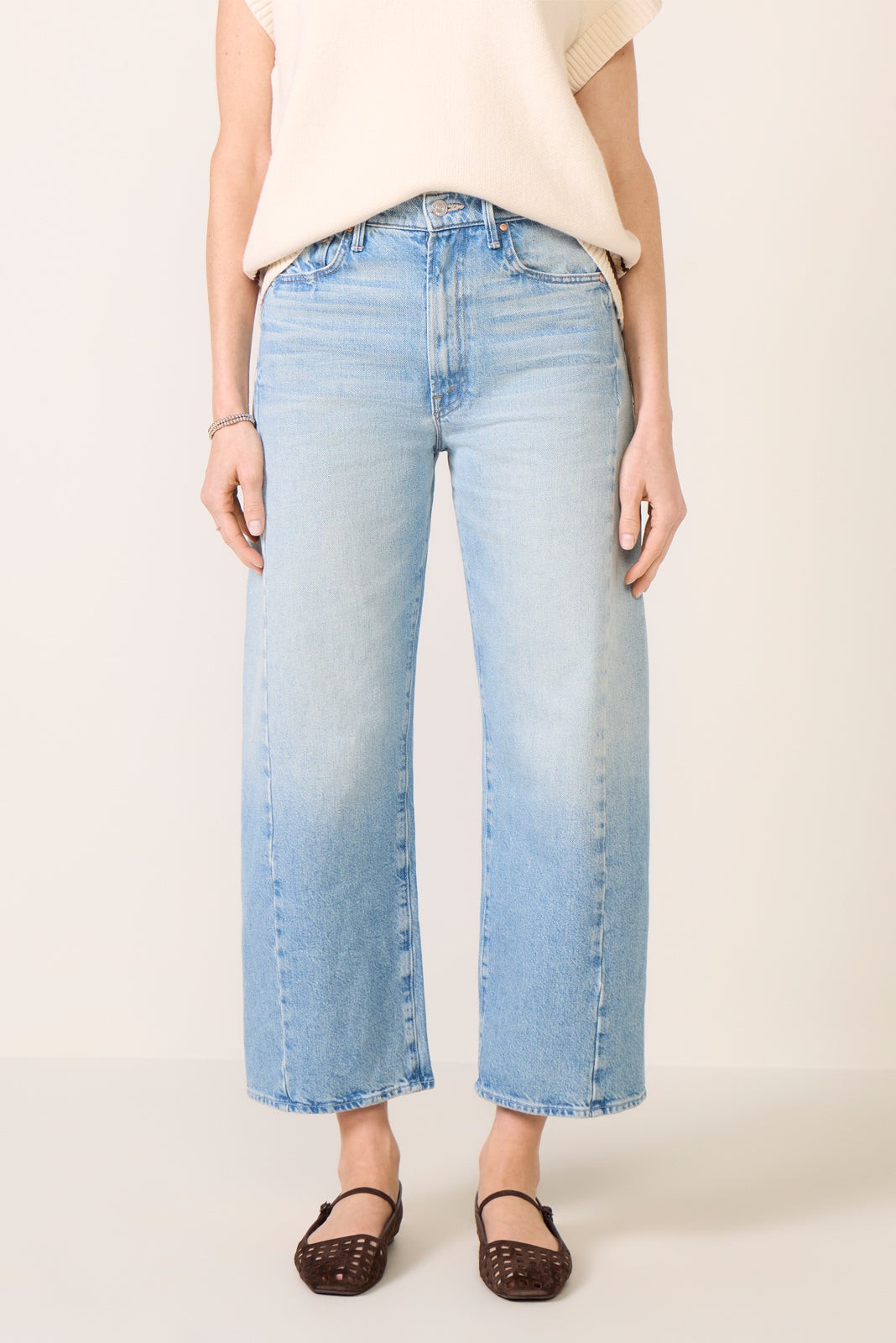A curved wide leg creates the chic silhouette of The Half-Pipe barrel jean by MOTHER. featuring a high-rise waist. ankle-length hems. and rigid cotton denim in a light blue wash.