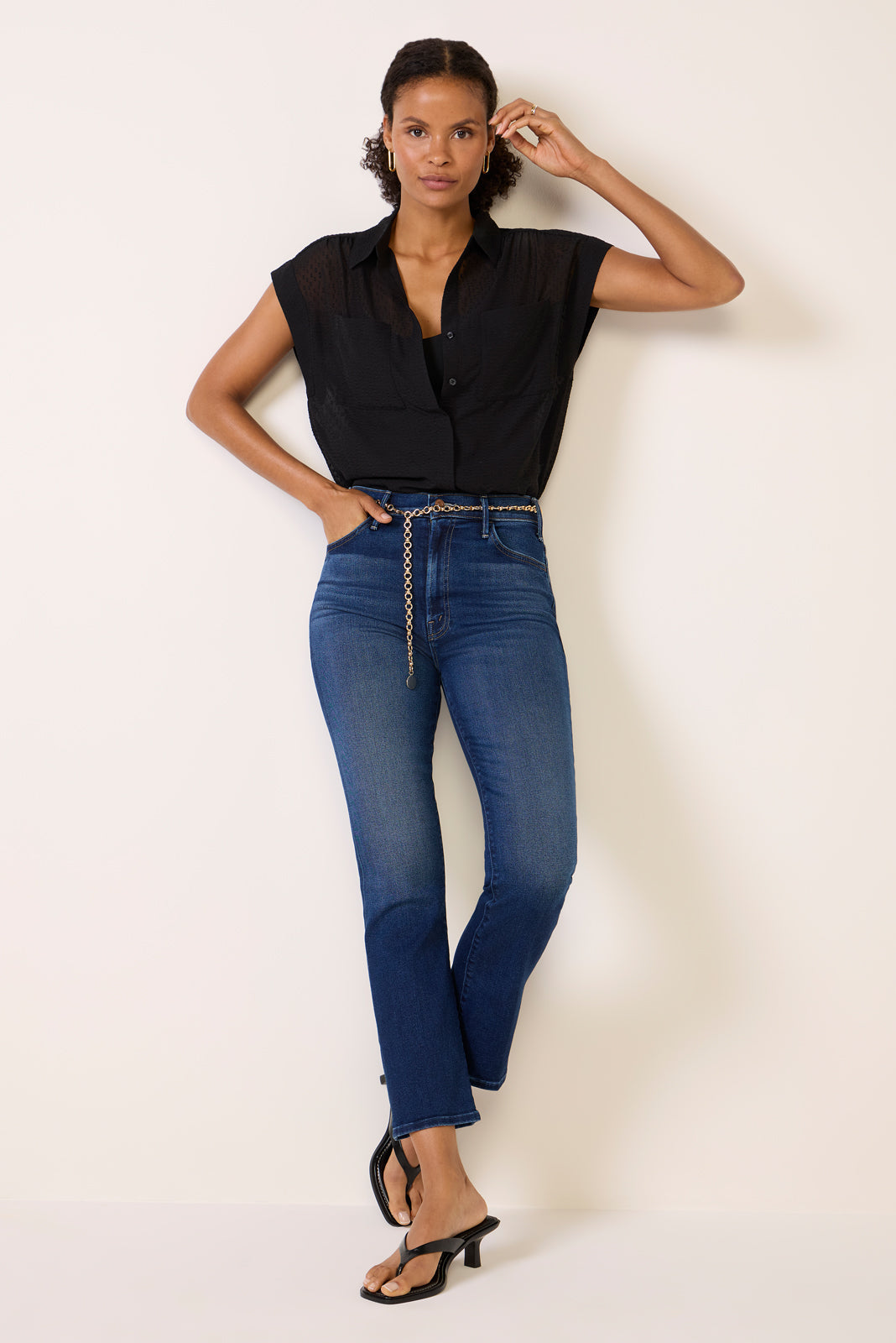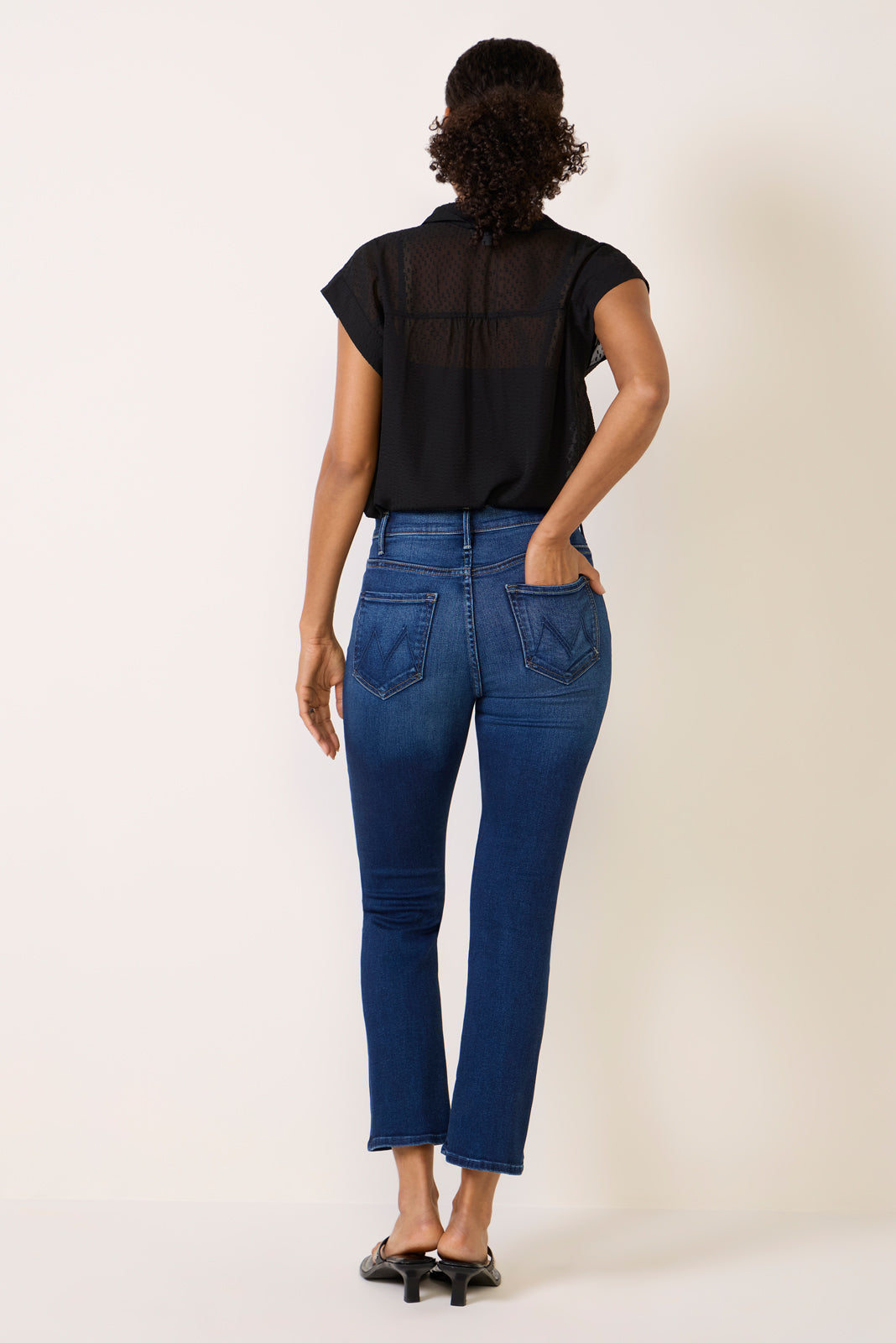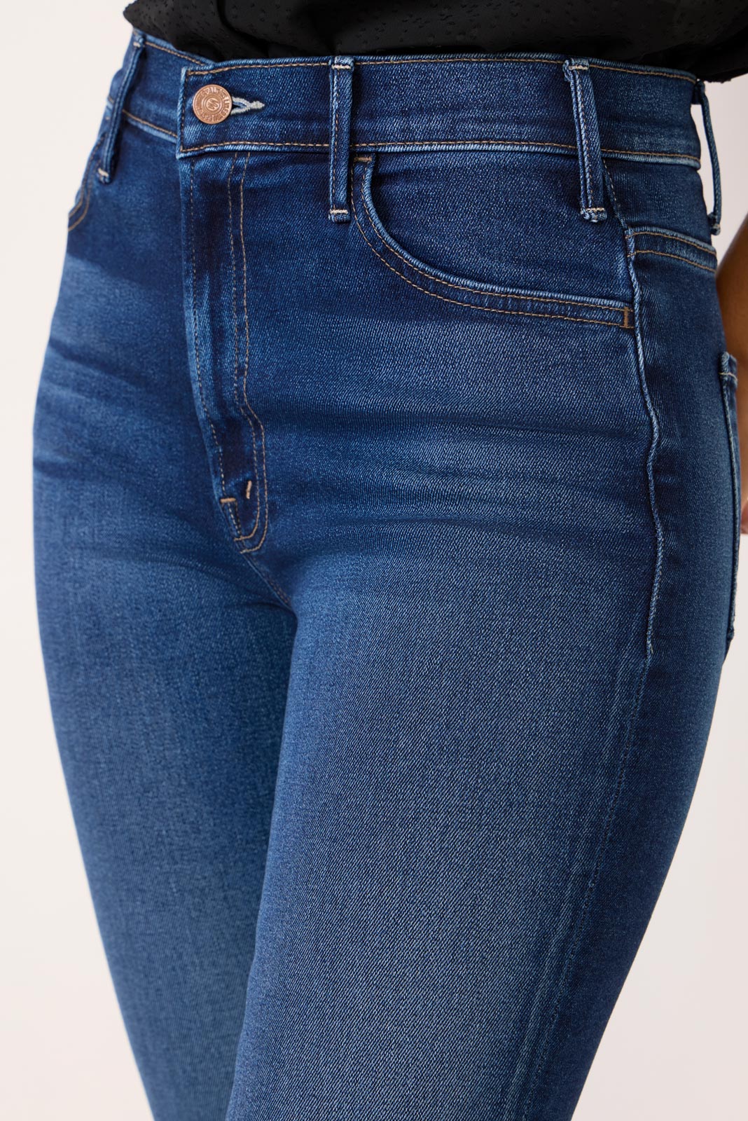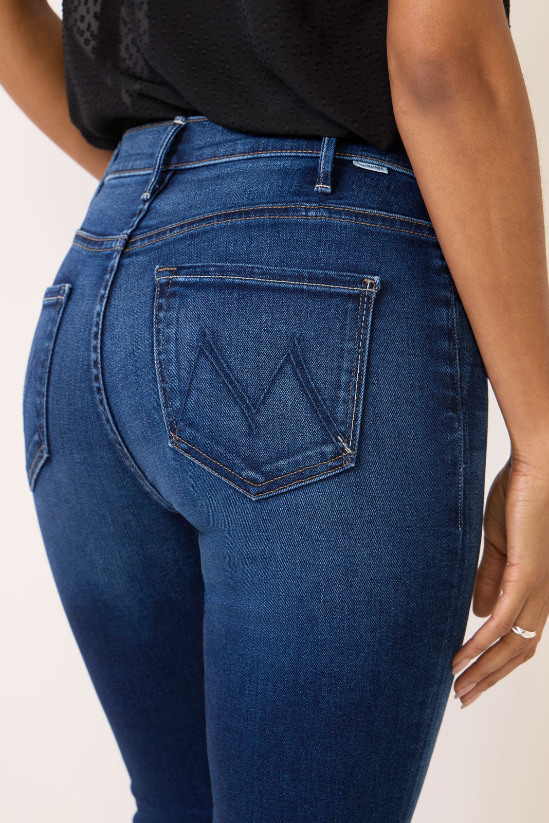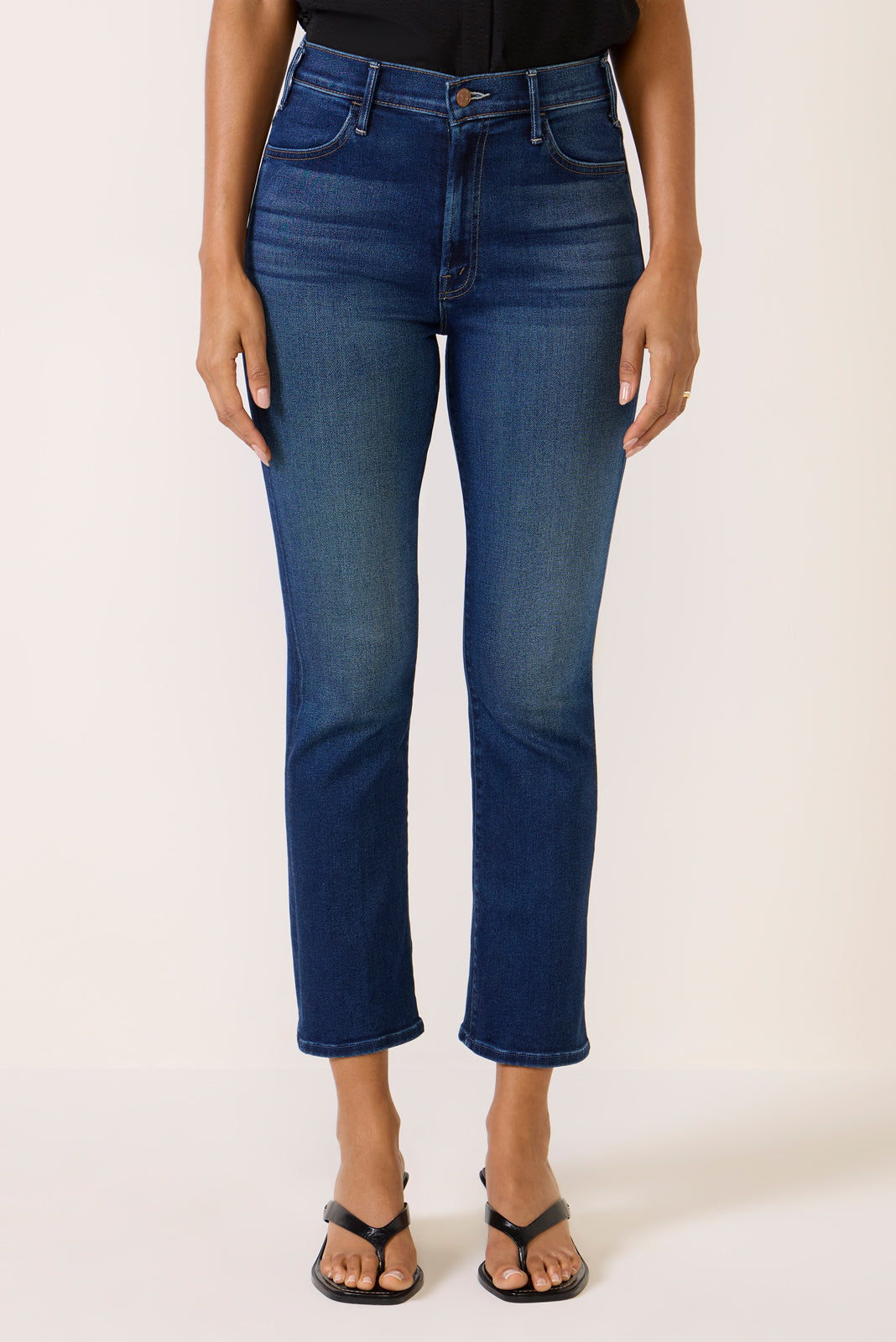 A dark blue wash and subtly flared hems define The Hustler Ankle jean by MOTHER. featuring a high-rise fit. ankle-length inseam. and soft stretch denim fabric.