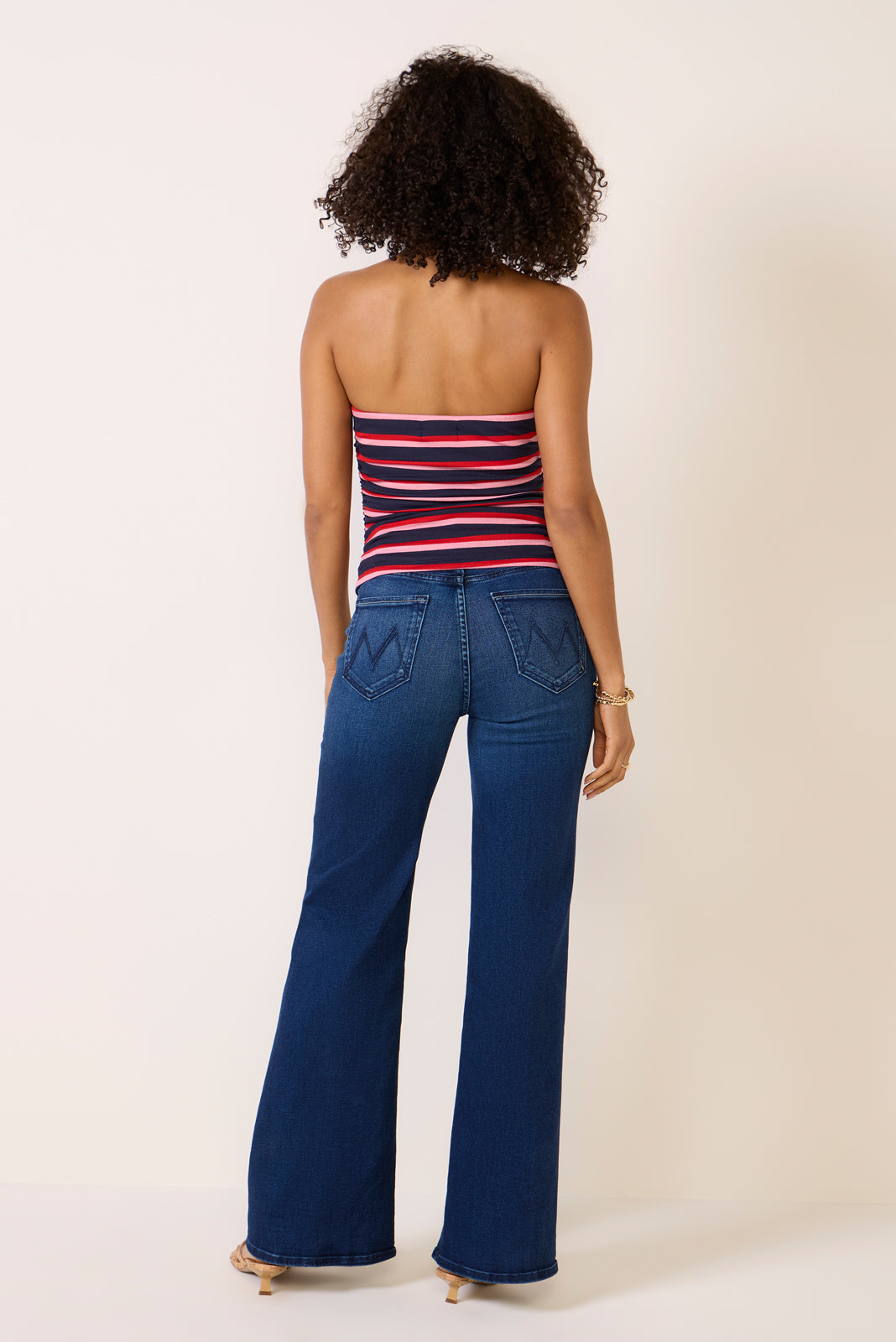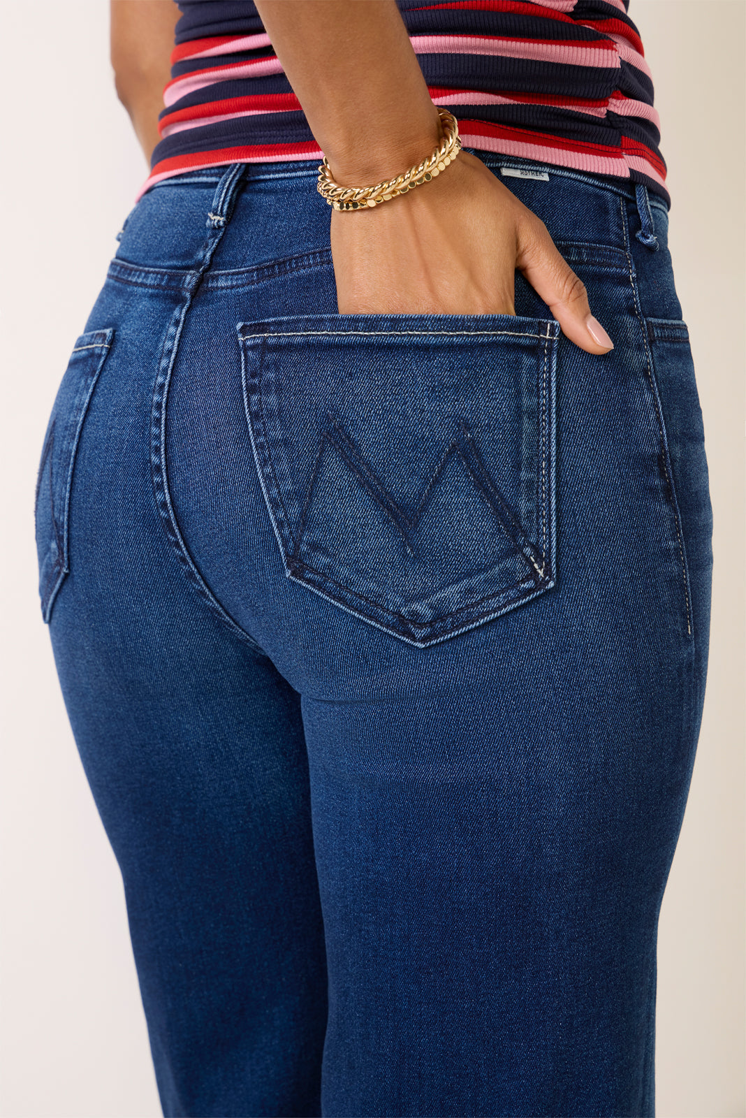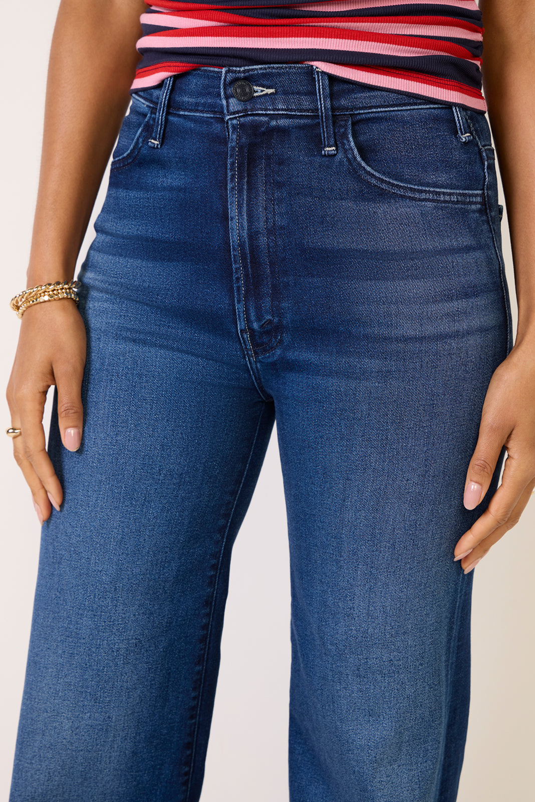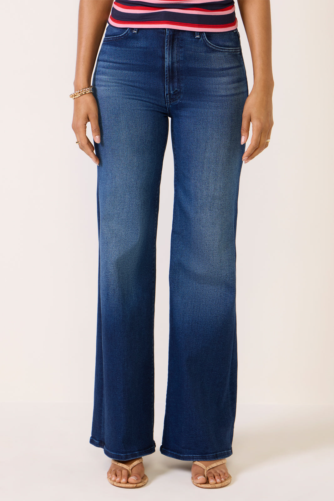 Elevate your denim collection with these '70s-inspired wide leg jeans by MOTHER. featuring a high-rise silhouette. full-length inseam. and soft stretch denim in a dark blue wash.