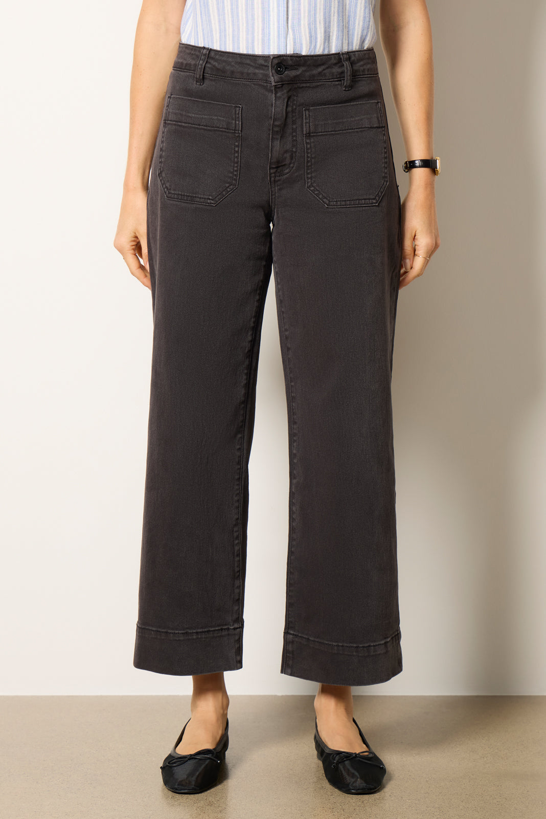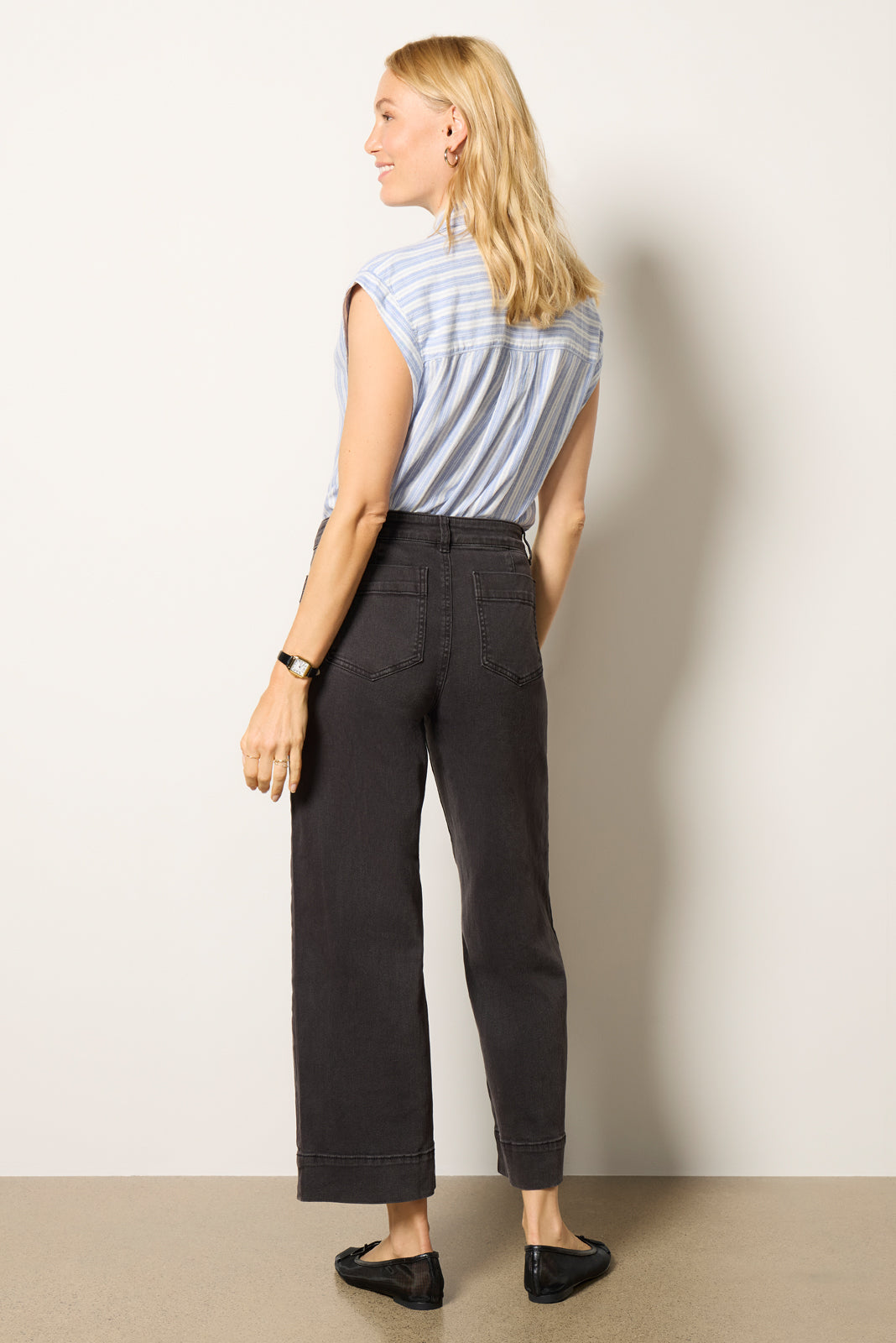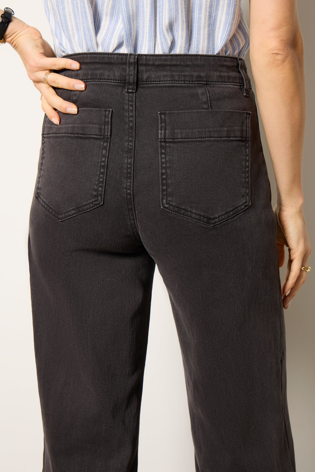 Finished in a versatile black wash. these stylish wide leg jeans by Sanctuary feature a mid-rise silhouette. trouser-style hems. and patch pockets at the front and back. You'll love them paired with everything from tees and tanks to dressy blouses.