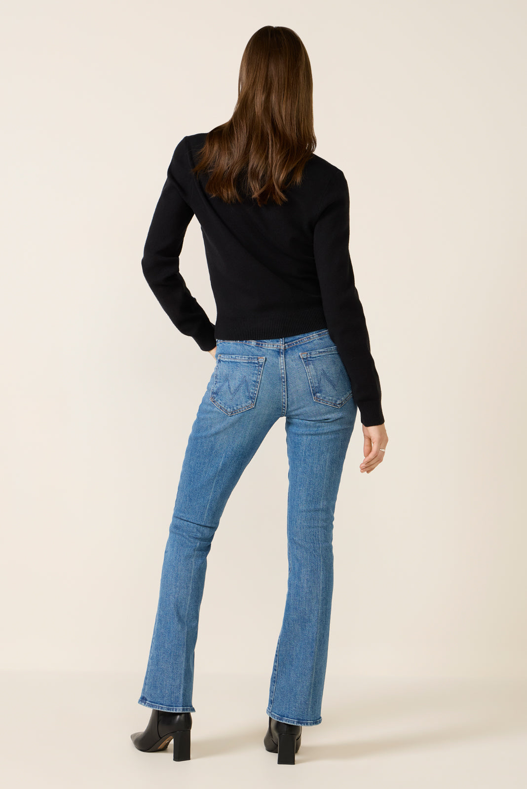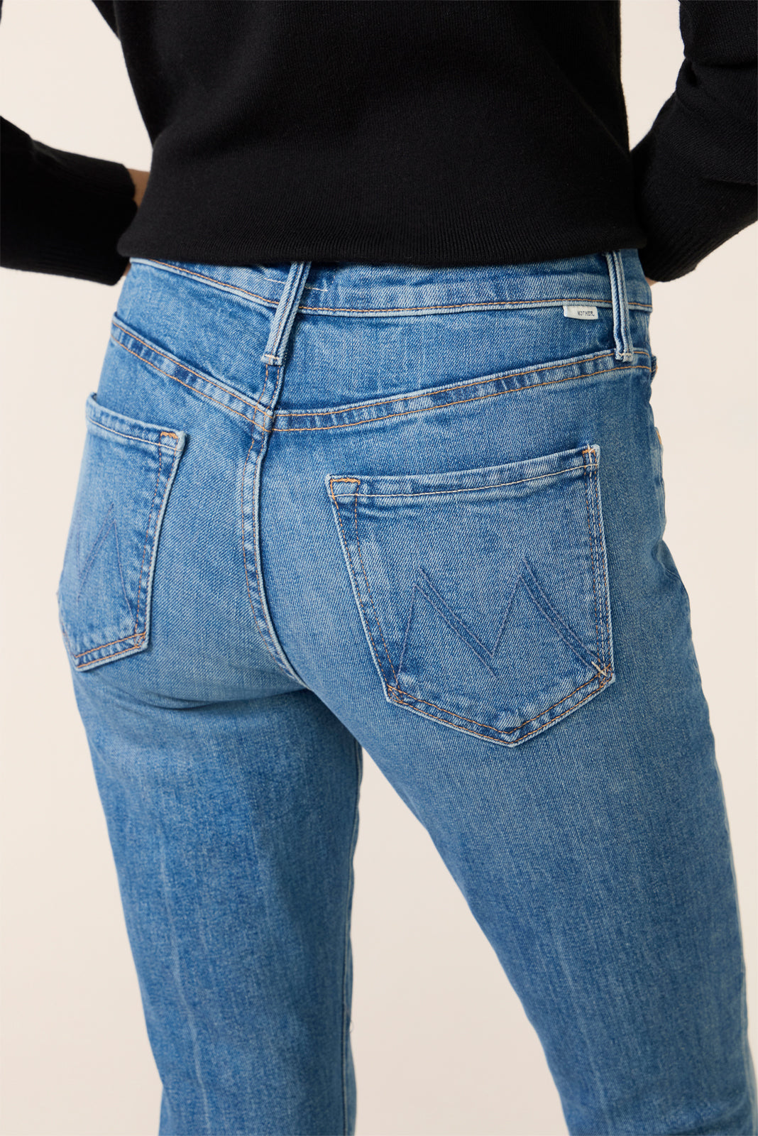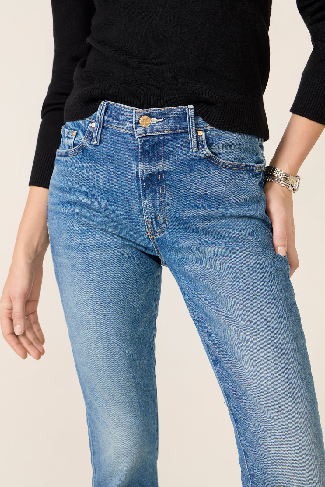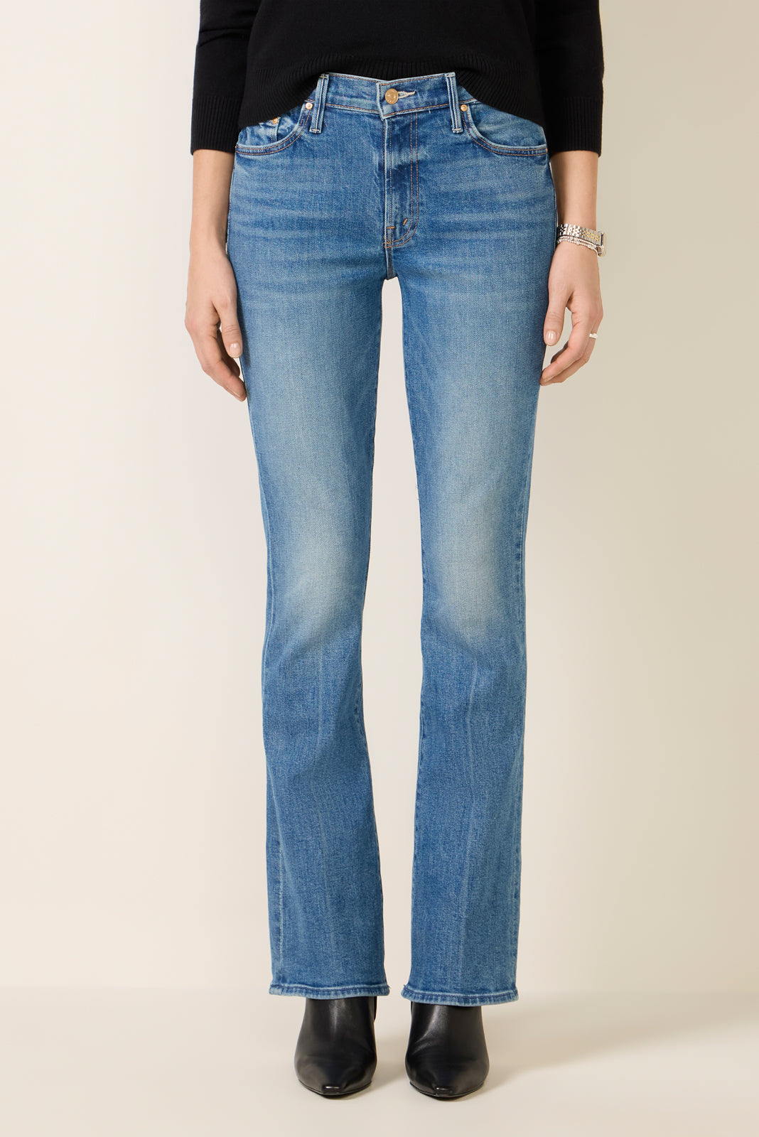 Crafted from rigid cotton denim. The Outsider Sneak bootcut jean by MOTHER features a flattering mid-rise silhouette. full-length inseam. and medium blue wash with fading at the knees.