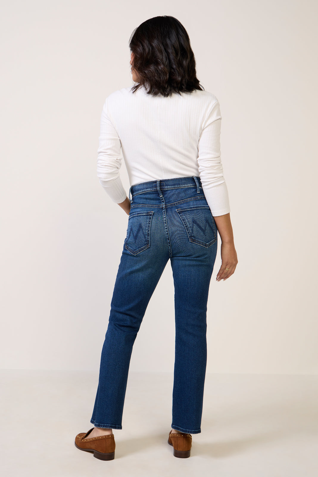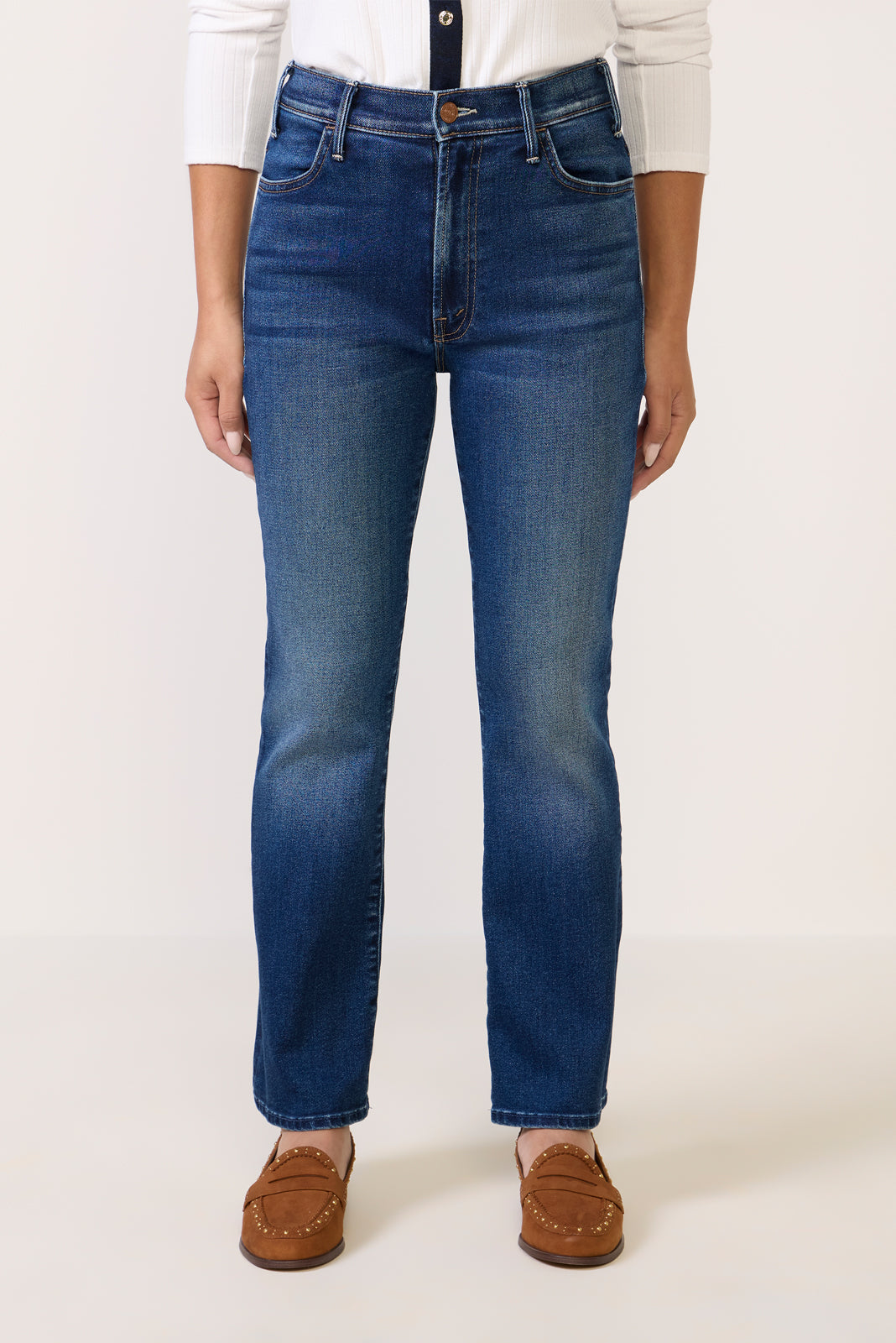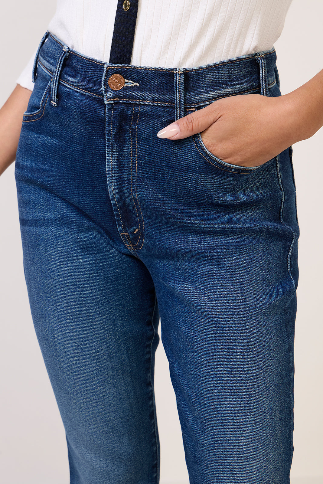 Finished in a faded dark blue wash. the Petite Lil' Hustler flare jean by MOTHER is crafted from soft stretch denim with a high-rise fit and ankle-length hems. Designed to complement petite body types. these jeans feature a higher knee placement. shorter inseam. and shorter rise for a perfect. always-flattering fit.