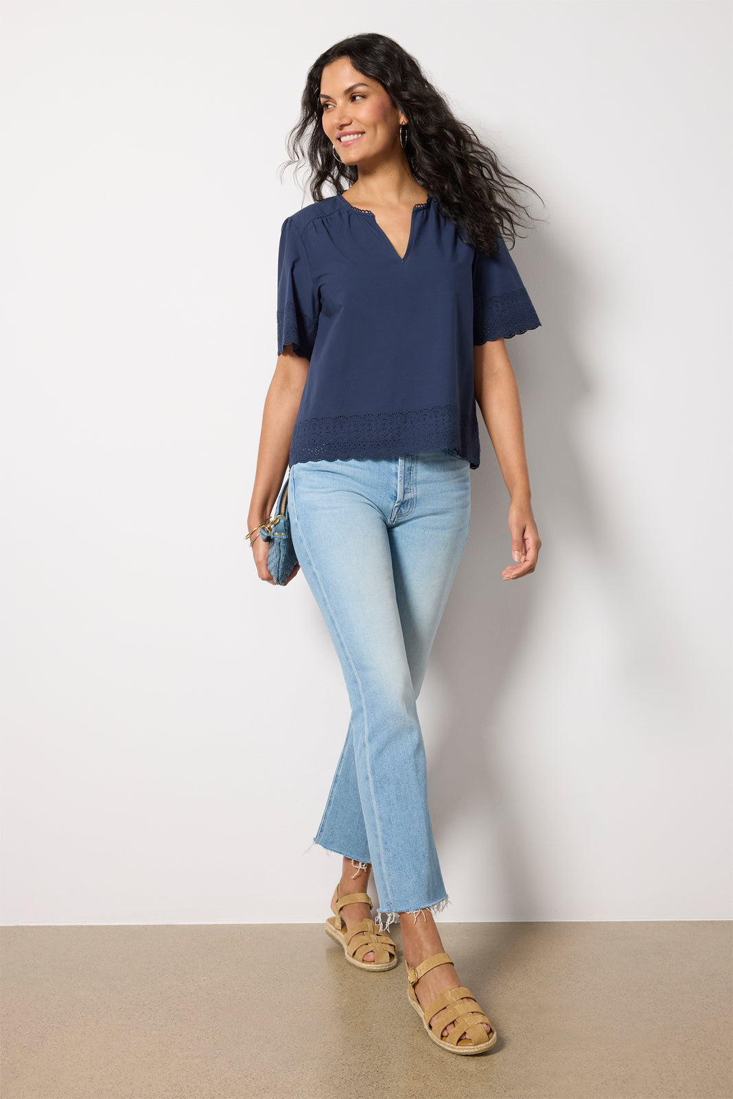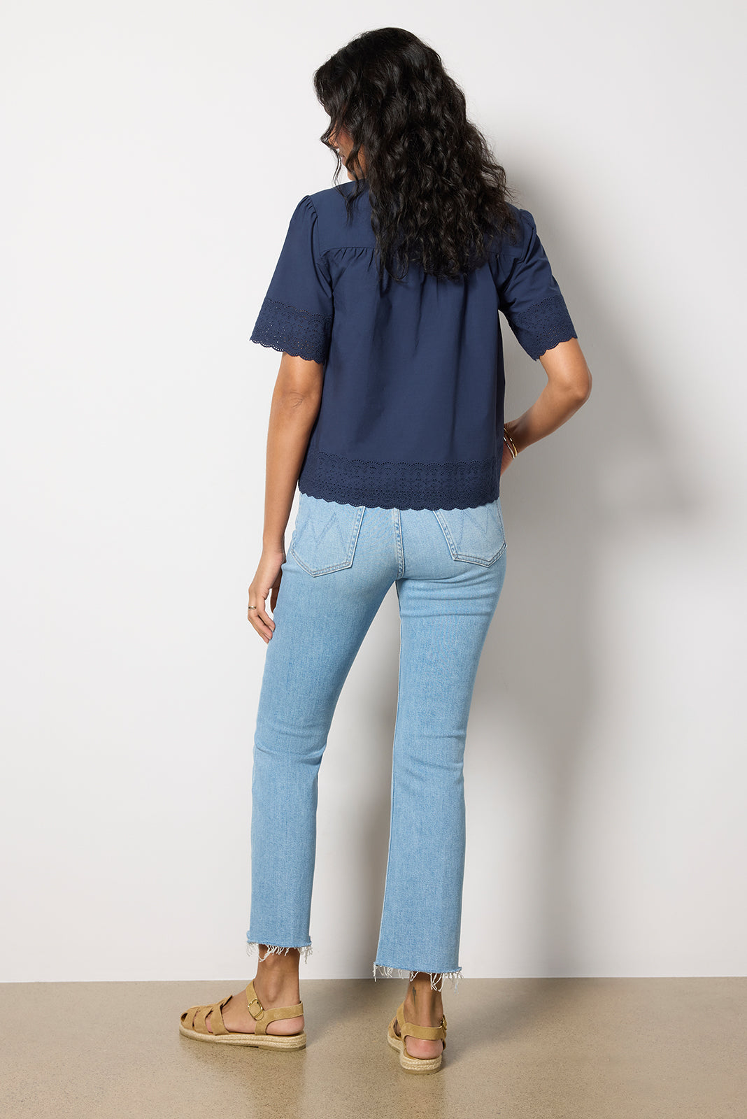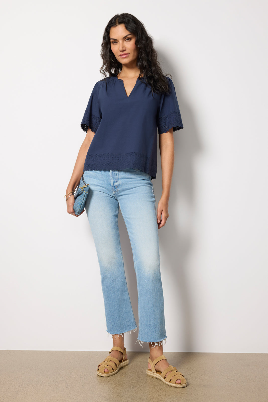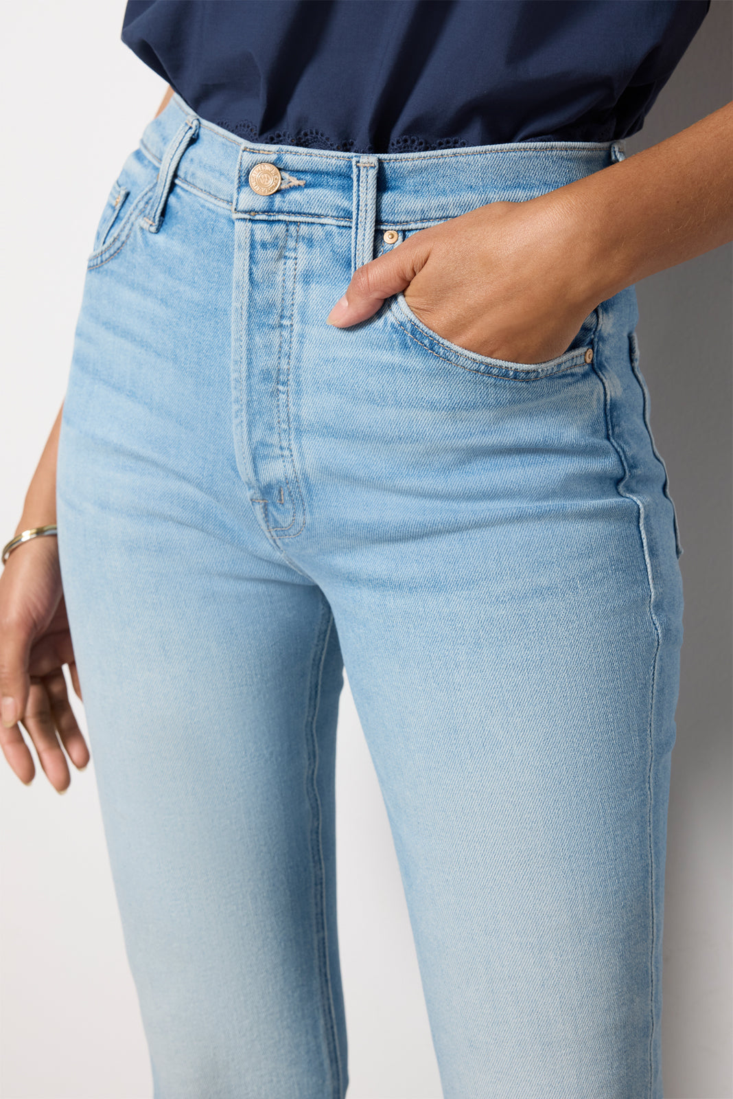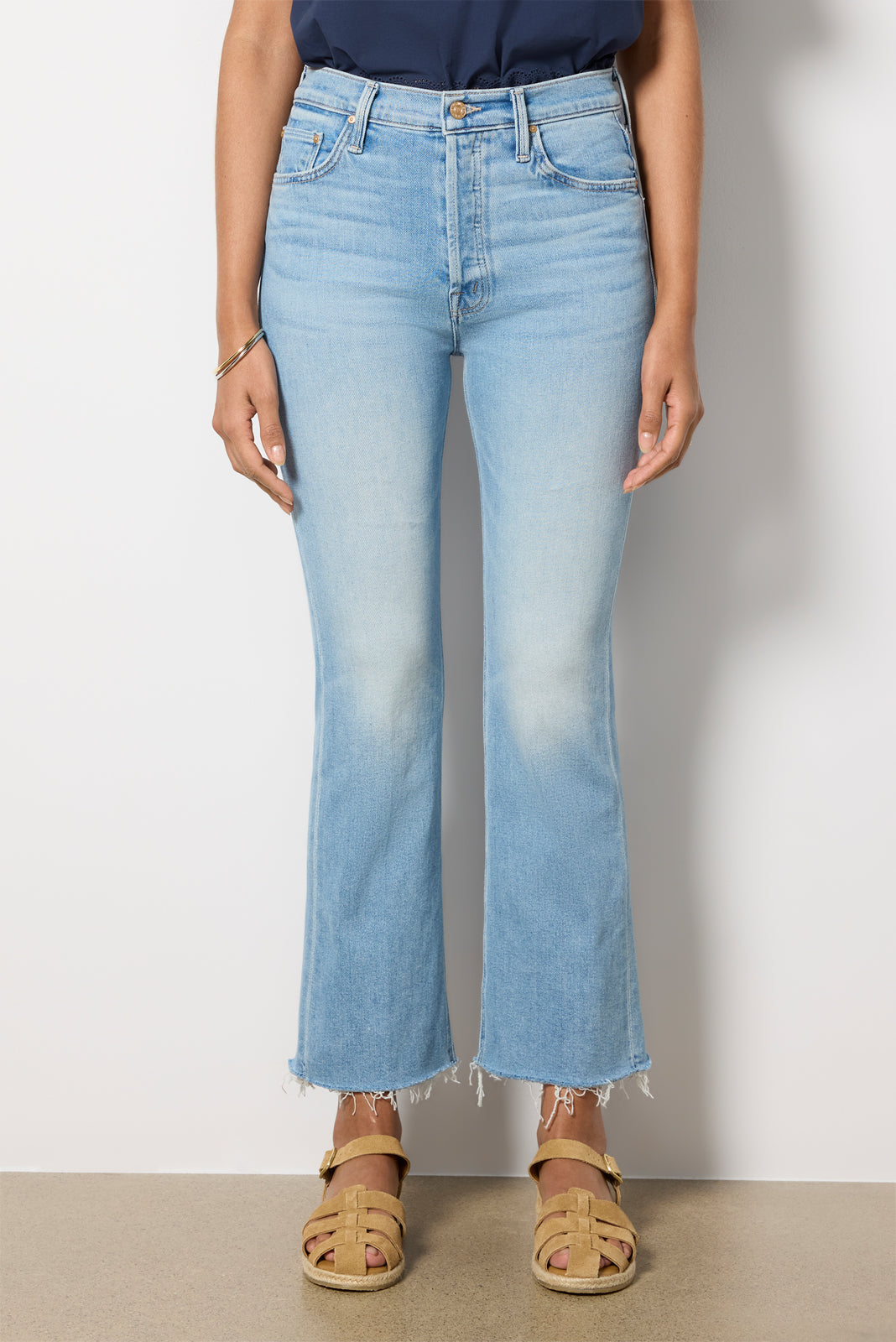 A versatile denim staple. the Tripper Flood jean by MOTHER features a straight leg silhouette with a high-rise waist. raw hems. and a light blue wash that's perfect for dressing up or down.