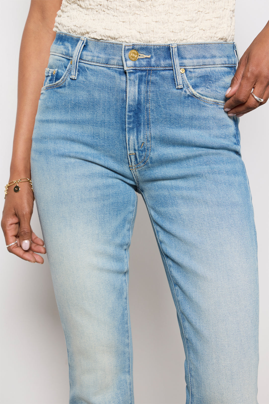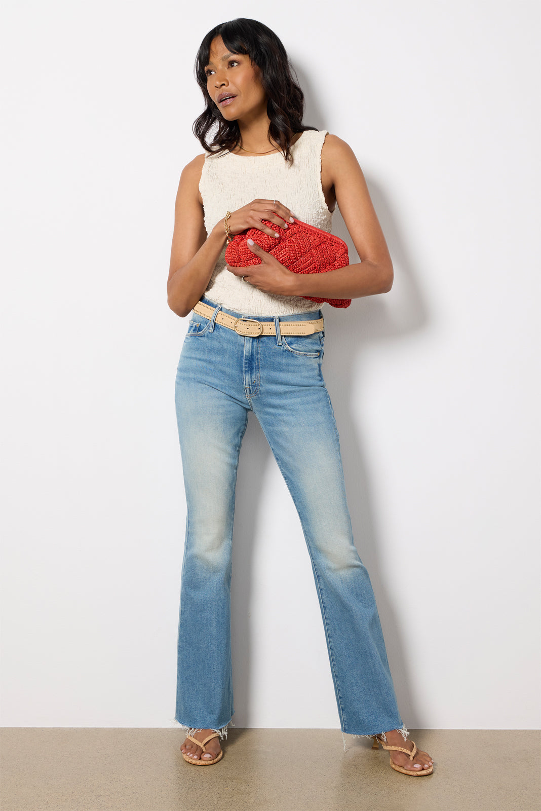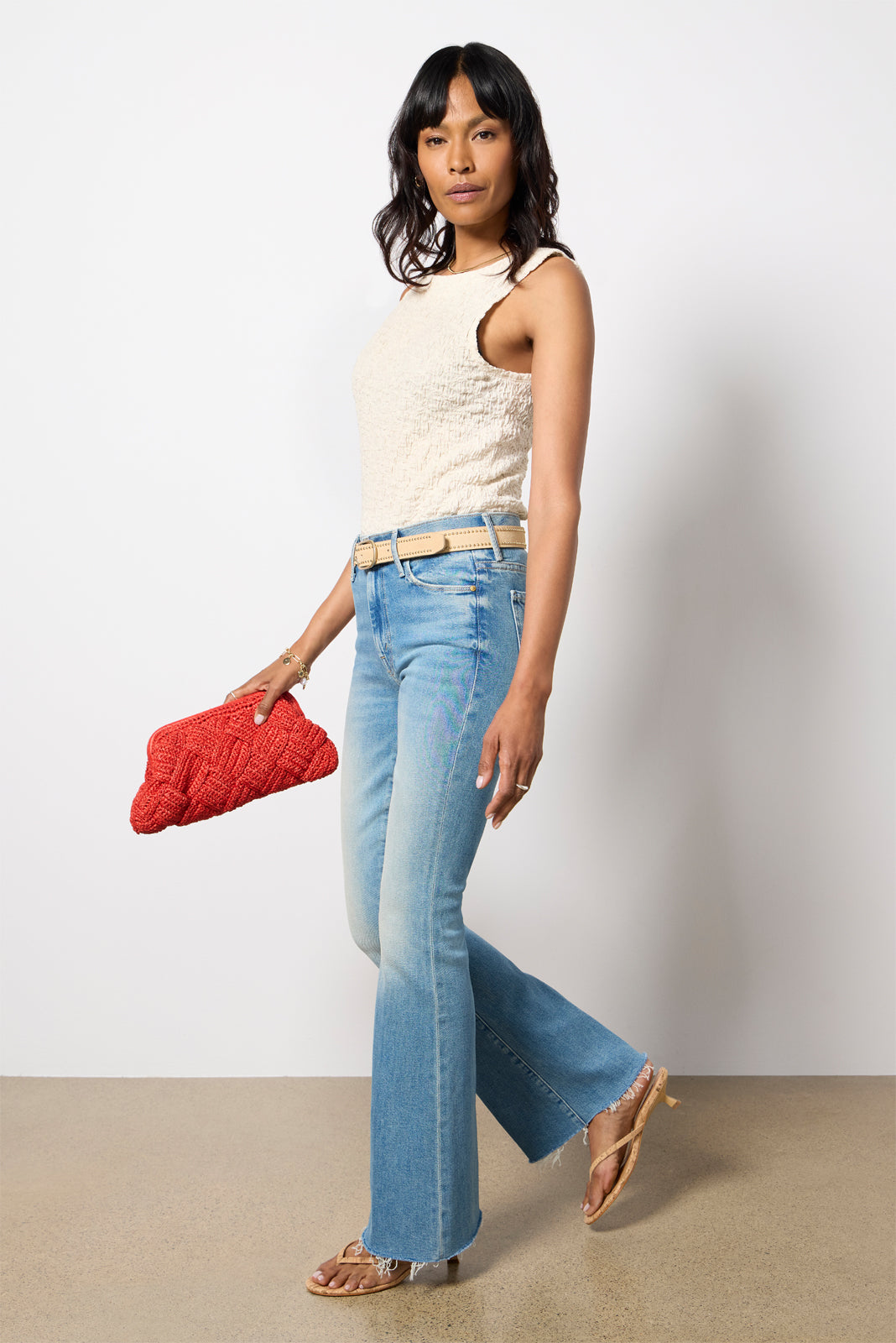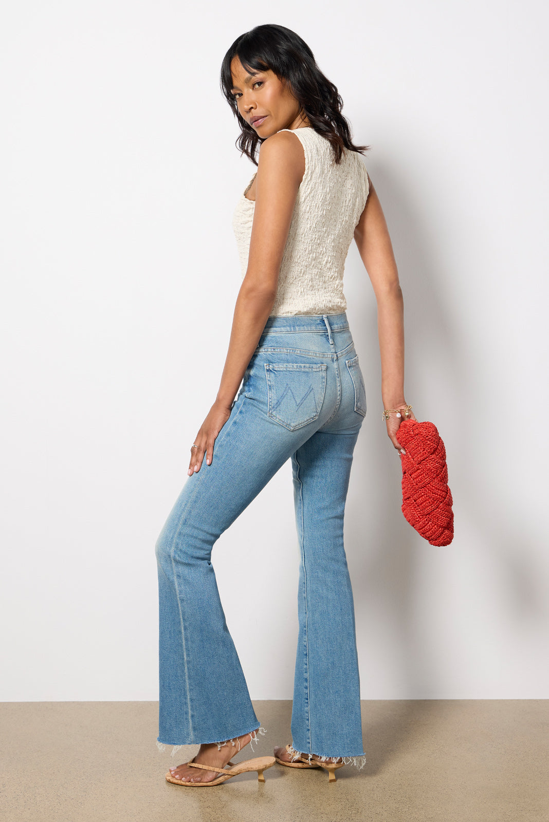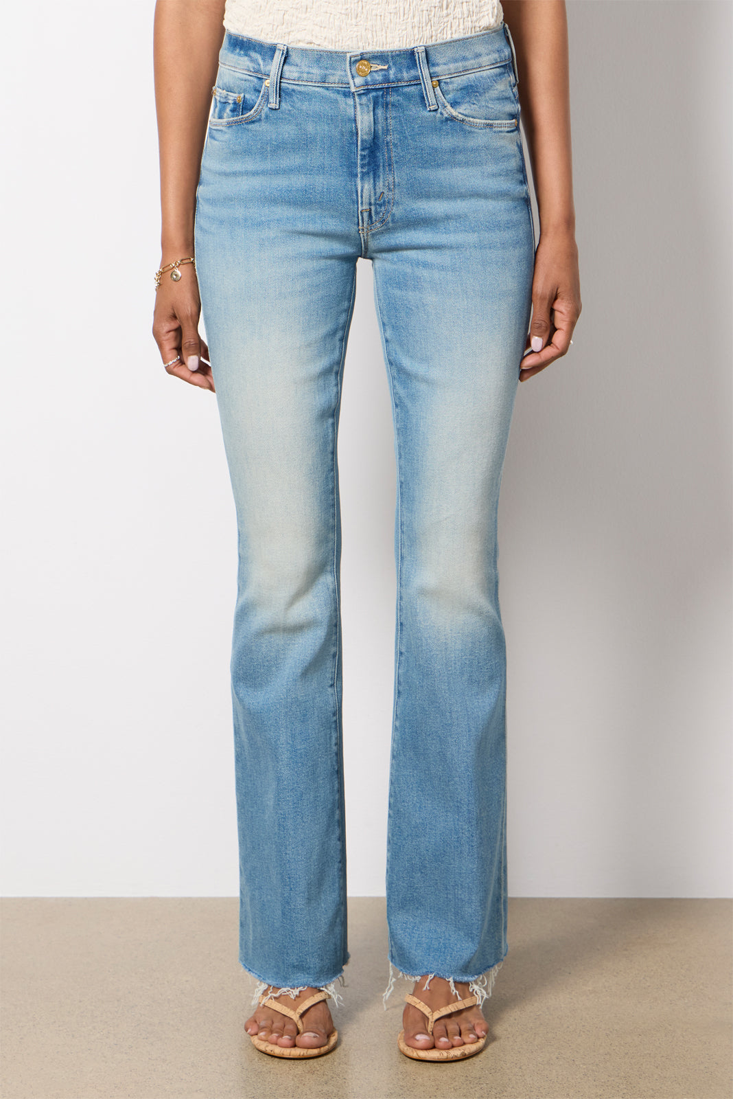 Finished with full-length raw hems. the Weekender Fray flare jean by MOTHER is crafted in soft stretch denim with a flattering mid-rise waist and faded light blue wash.