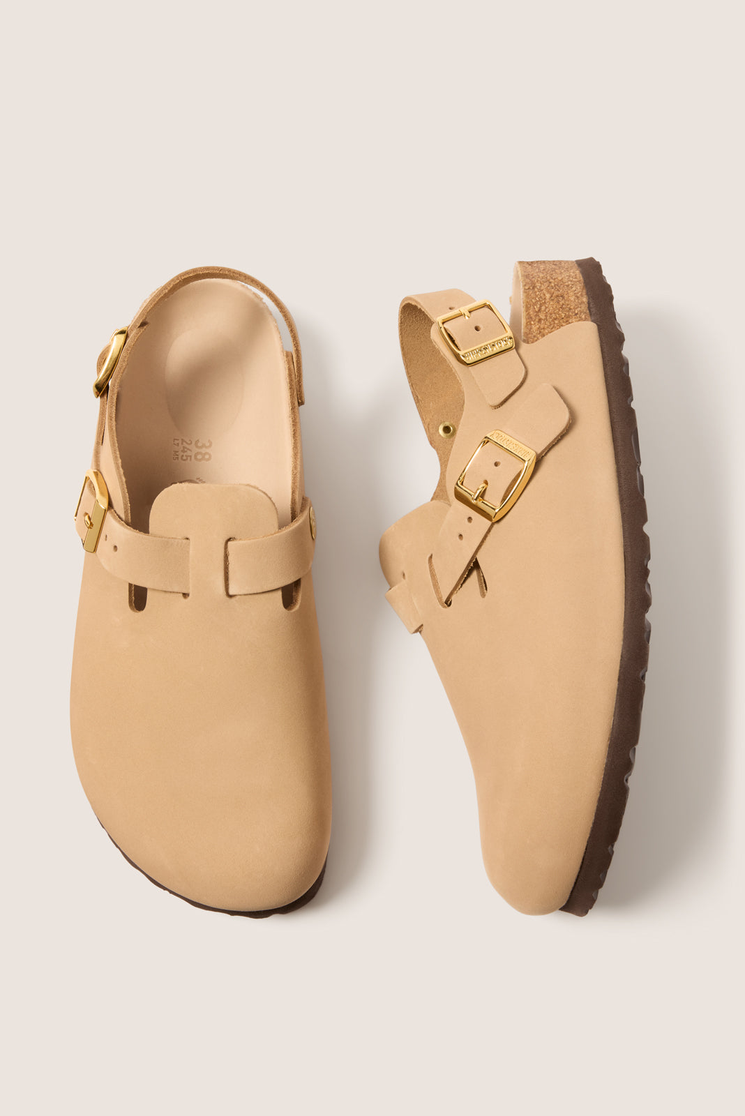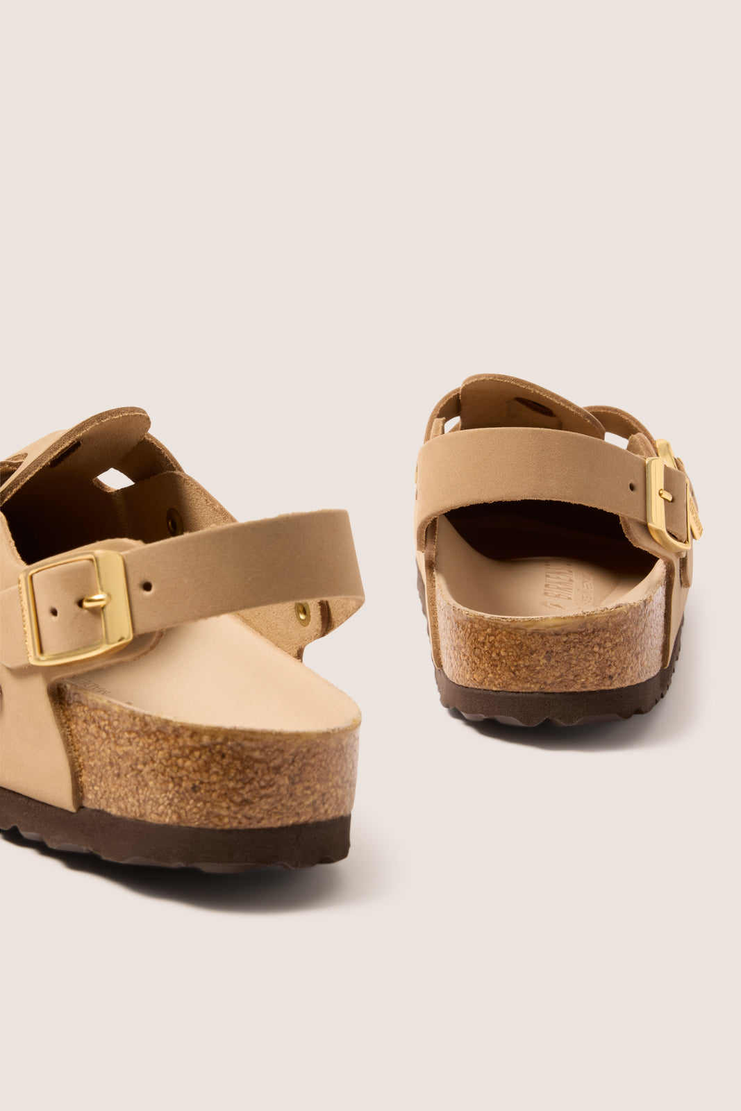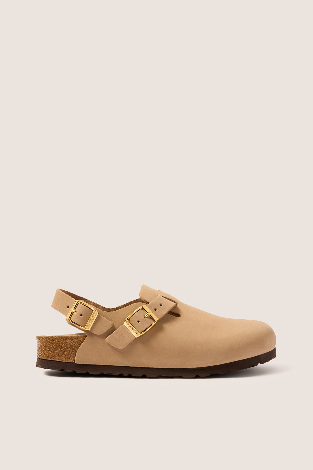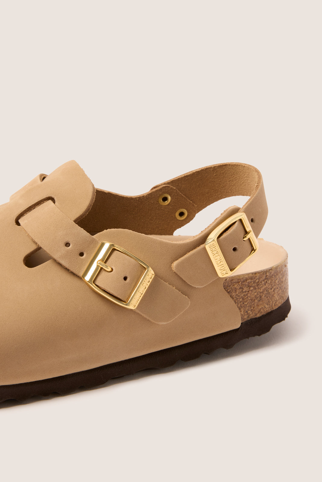 Gold-tone buckle details define these iconic Tokio clogs by Birkenstock. featuring a leather upper. slip-on design with adjustable ankle strap. and contoured cork footbed.