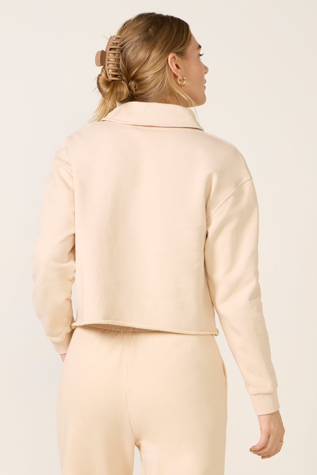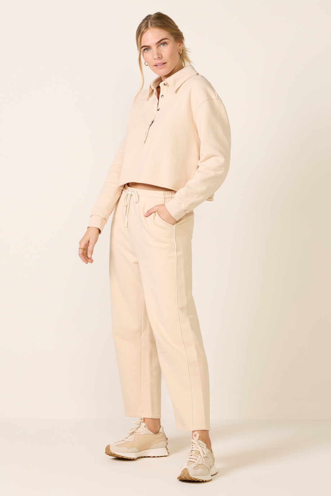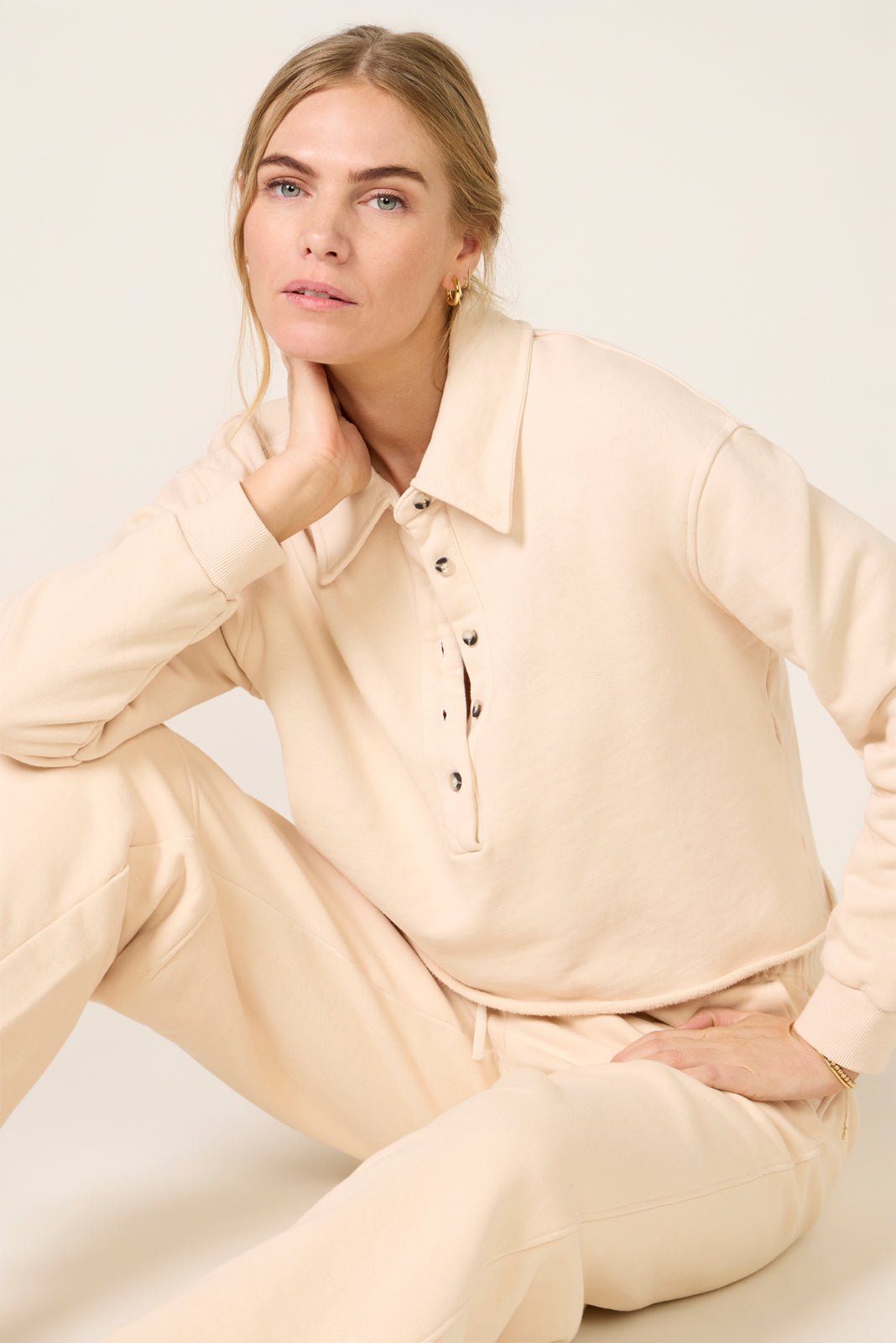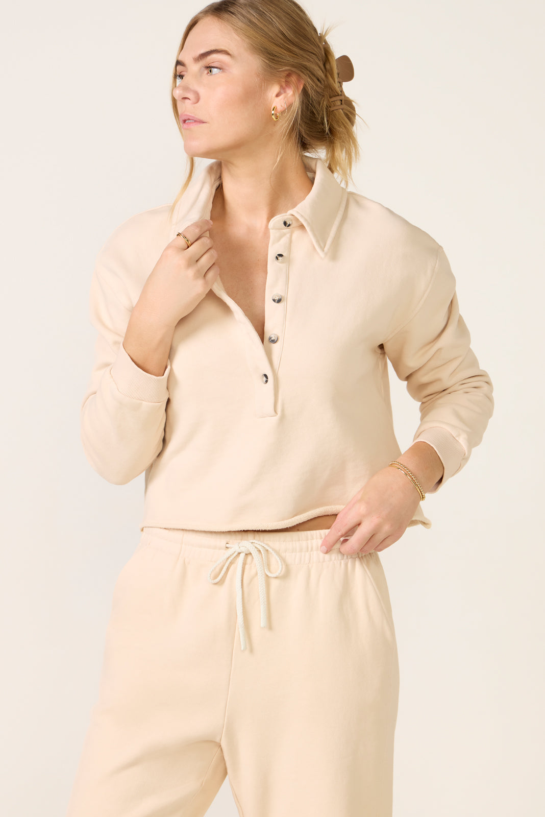 Elevate your laid-back look with the Vinny collared sweatshirt by perfectwhitetee. crafted from soft. heavy fleece fabric with a button-front neckline and cropped raw-edge hem for a lived-in feel. Pair with the matching Fallon Barrel Sweatpant for a comfy two-piece set.