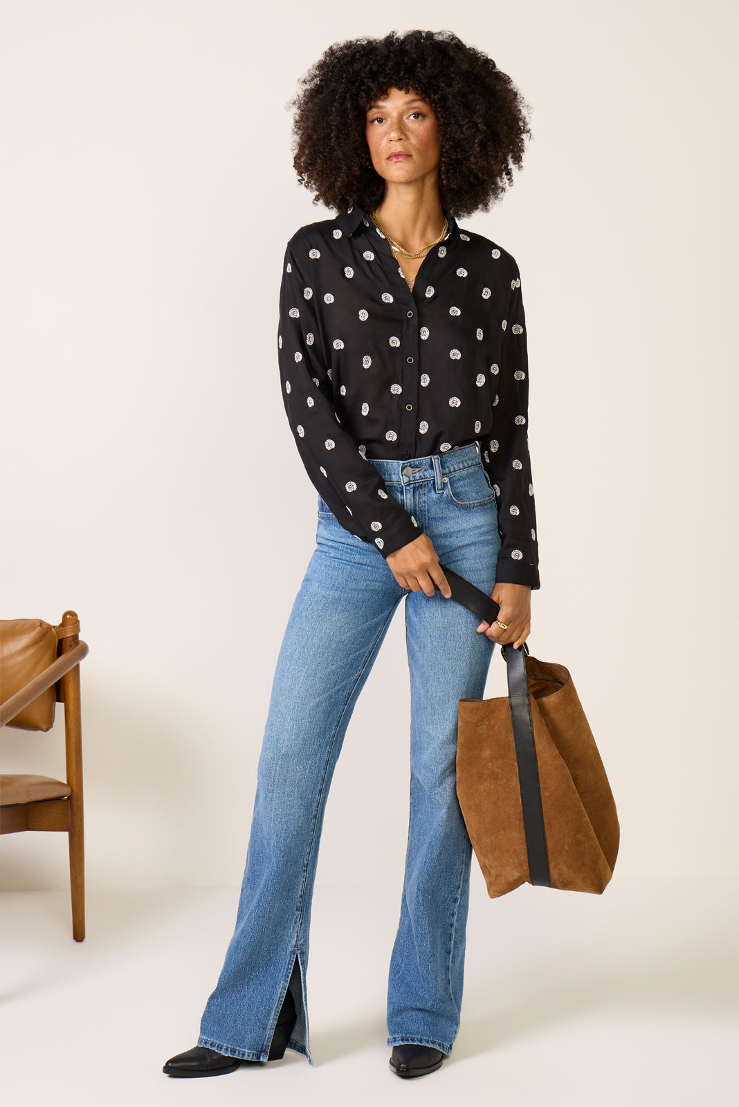 Crafted in comfortable stretch denim. this bootcut jean by EVEREVE features a mid-rise silhouette with a 34" inseam. versatile blue wash. and slit hems.