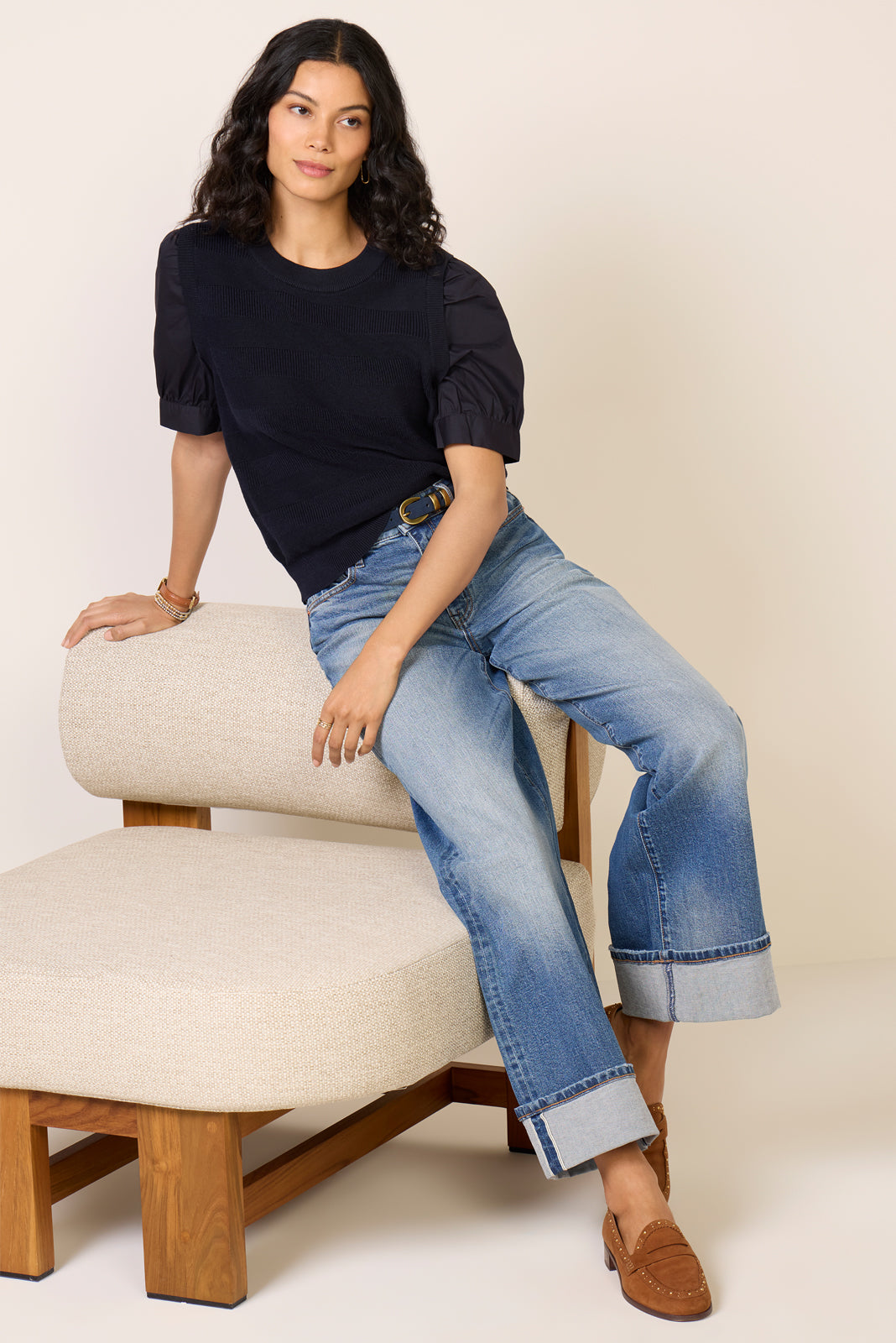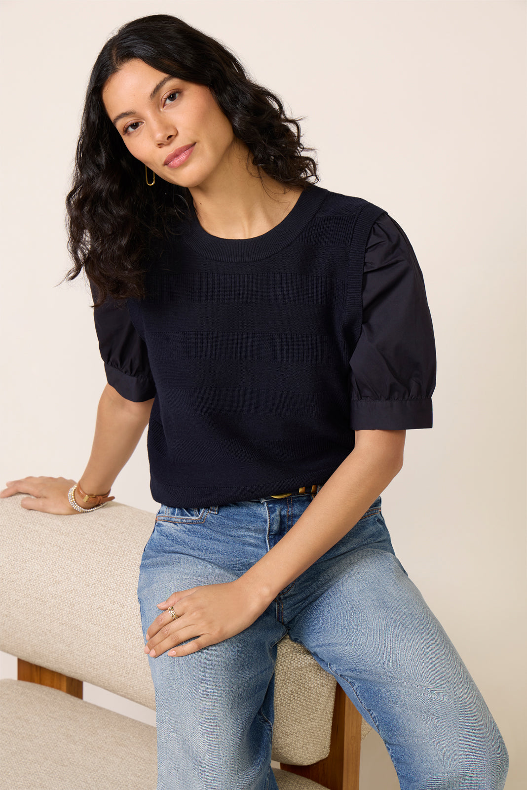 Get the perfect layered look with the Violet twofer pullover by EVEREVE. featuring a chic knit sweater vest with subtle ribbed stripes and attached cotton puff sleeves.