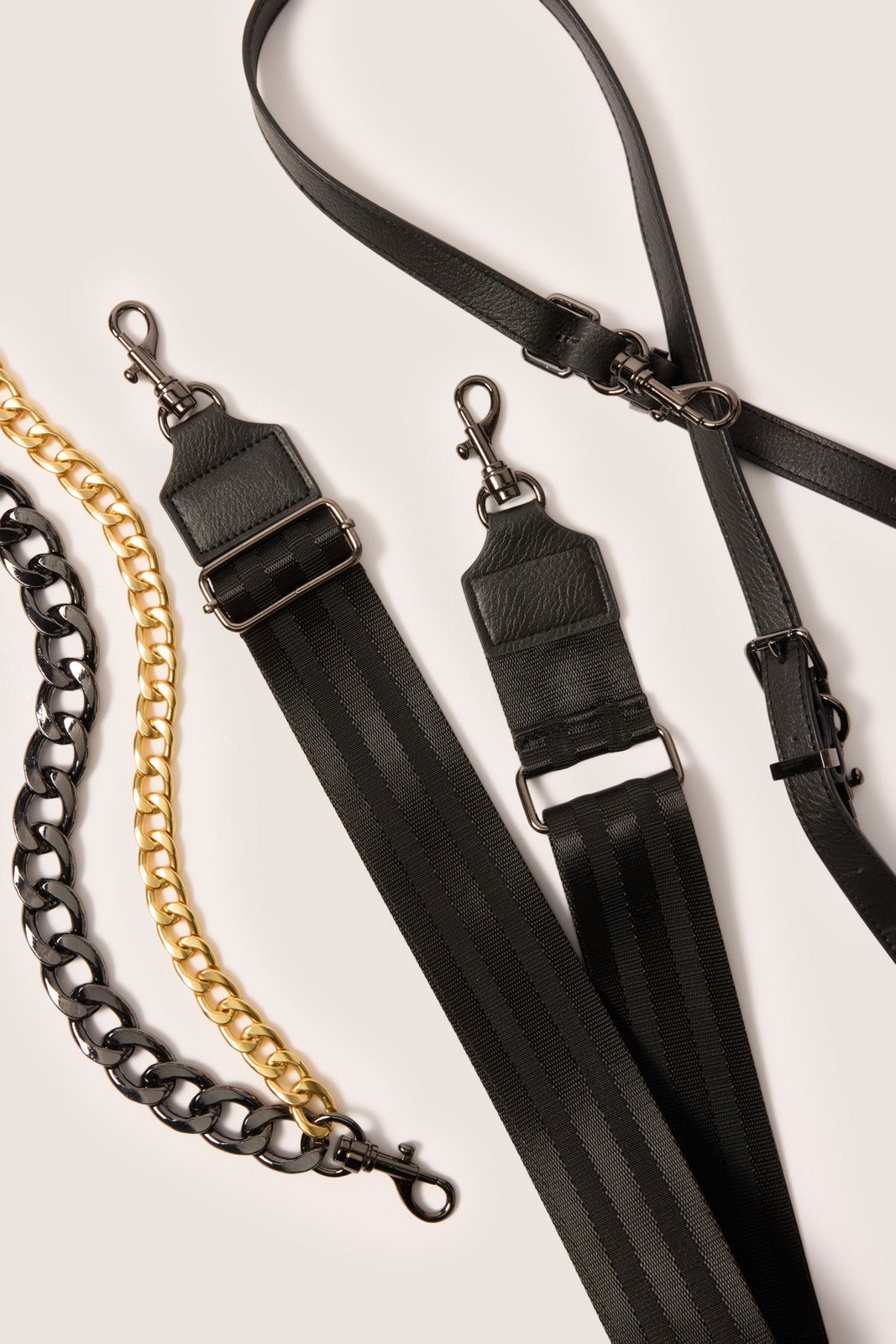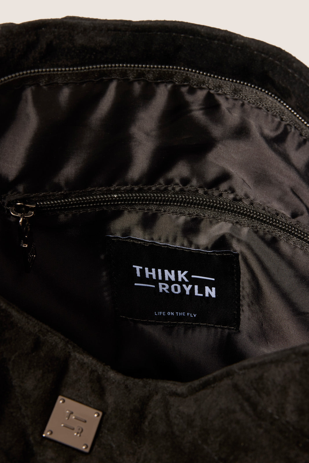 So-chic and endlessly versatile. the VIP Handbag by Think Royln features a quilted suede exterior. zipper closure. and interior zipper pocket. It includes three detachable strap options—an adjustable leather shoulder strap. a double chain strap. and an adjustable crossbody strap—to carry on any occasion.