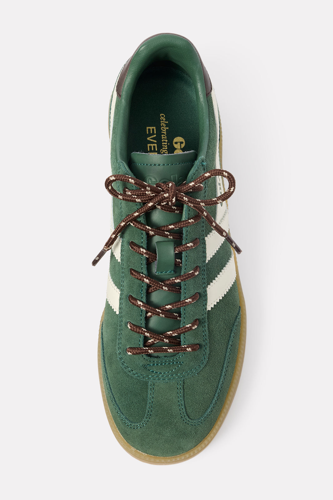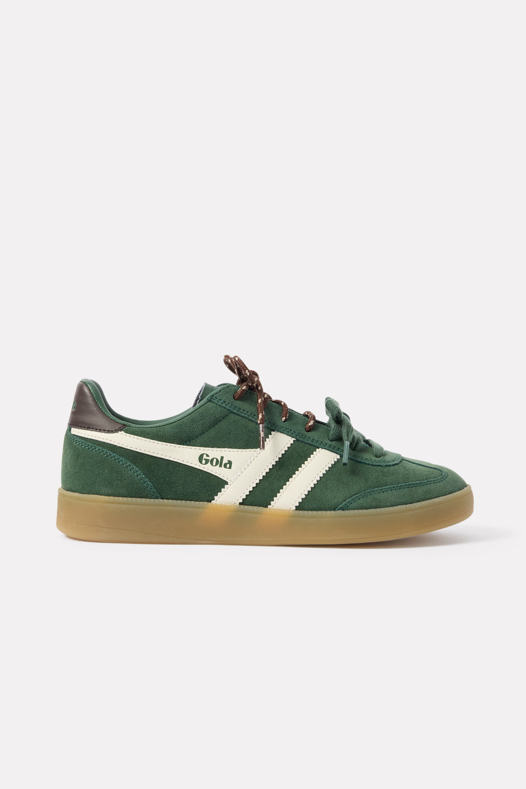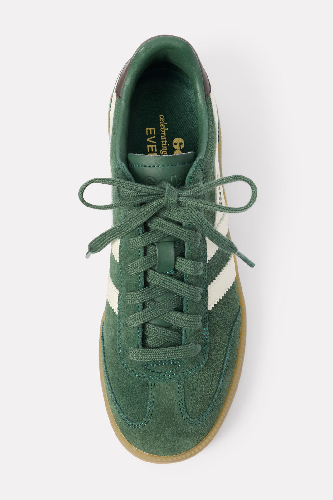A sporty paneled design defines these chic low-top sneakers by Gola. featuring a green suede upper. gum sole. and two lace options for a customizable look.