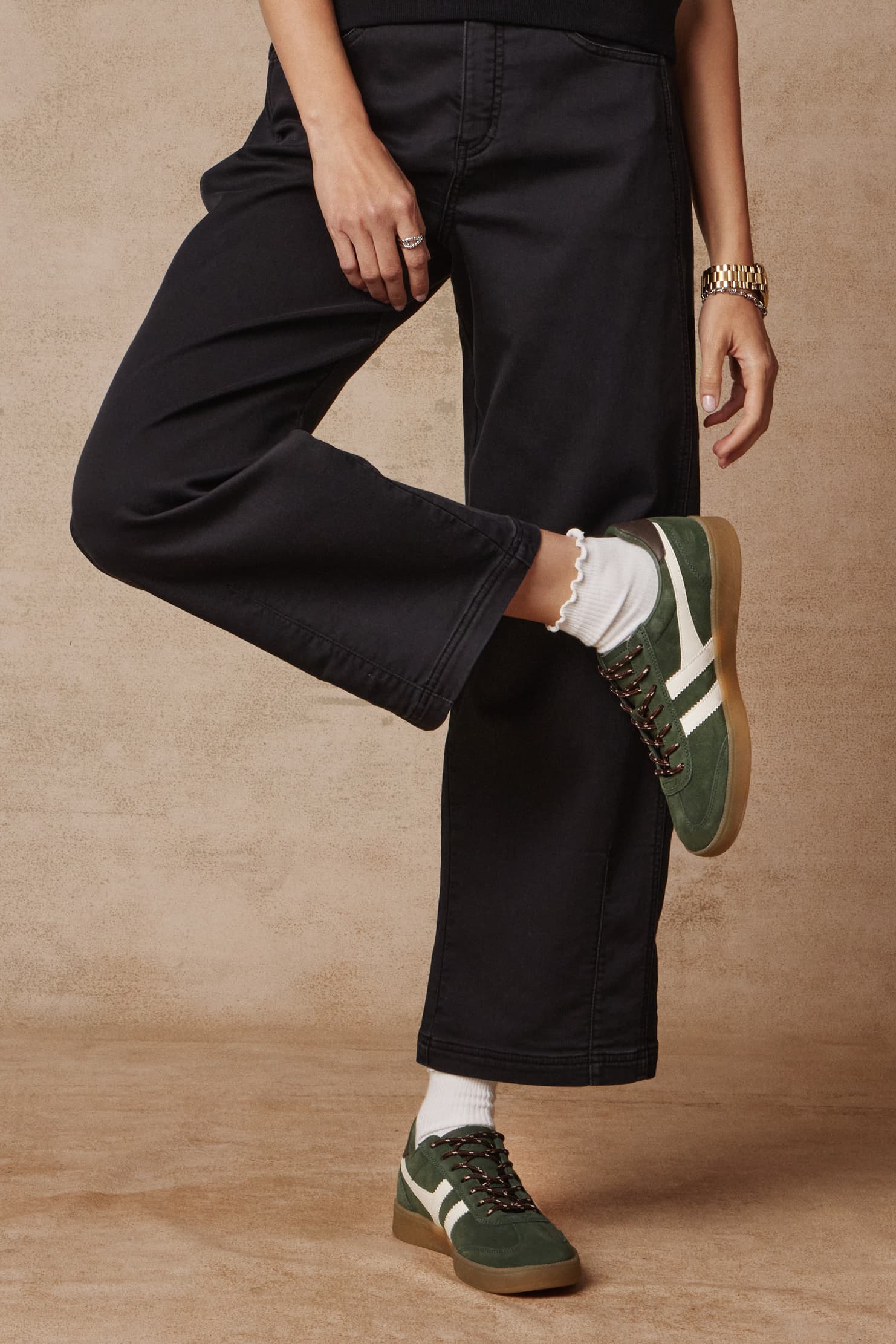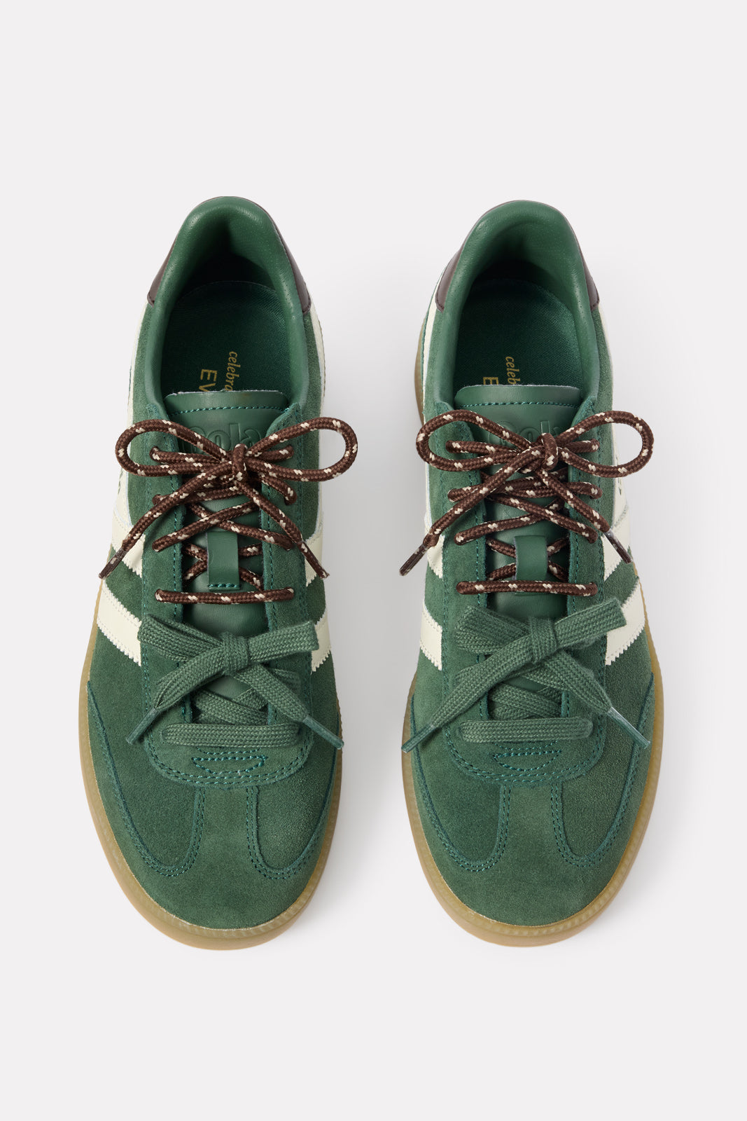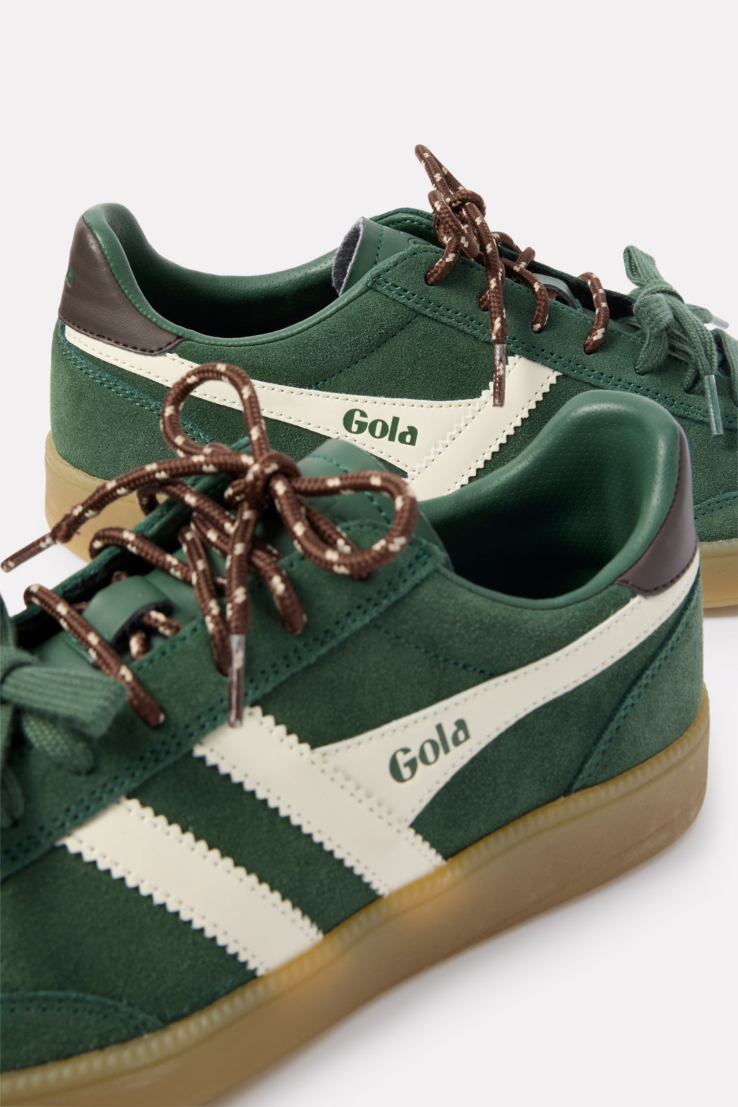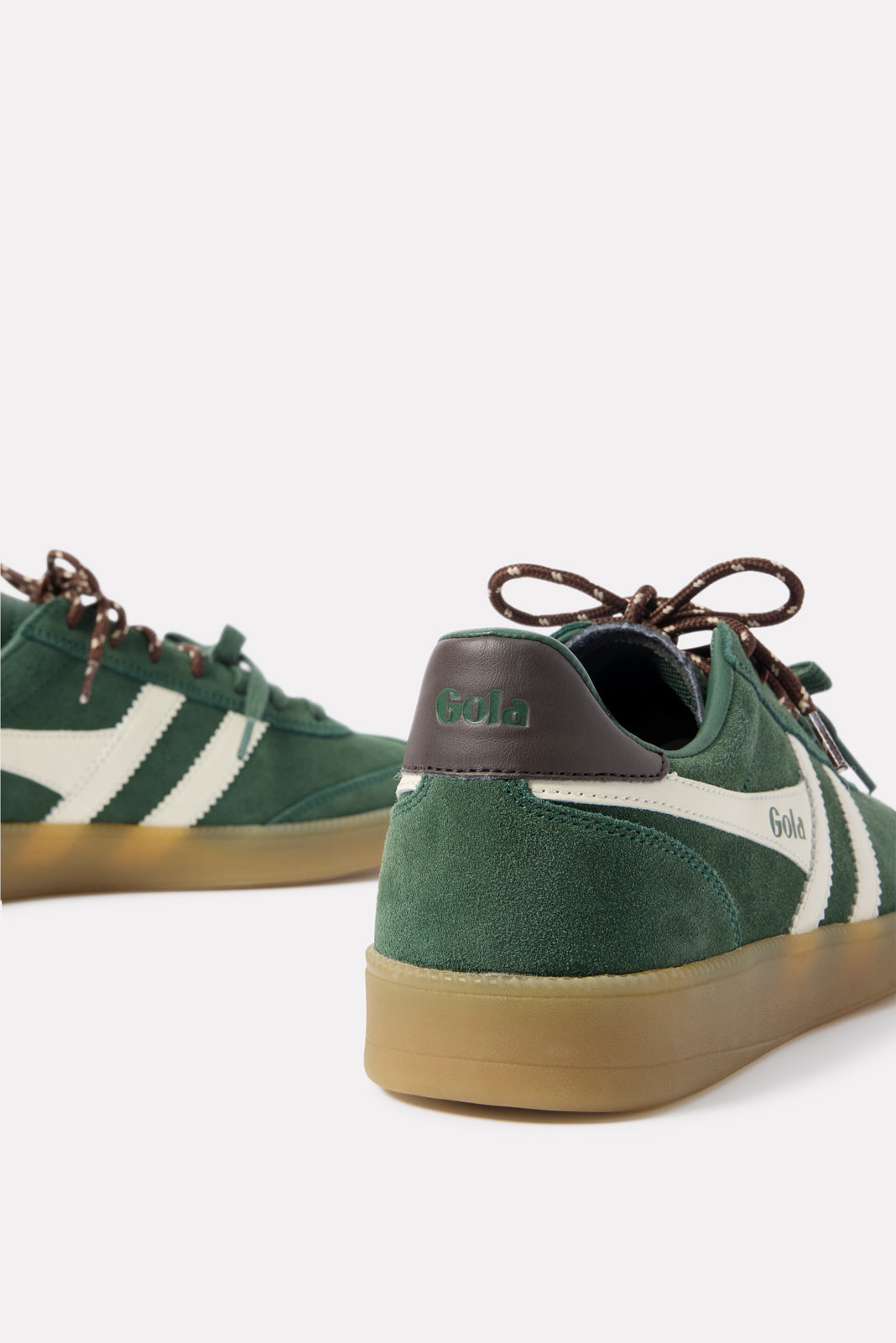 A sporty paneled design defines these chic low-top sneakers by Gola. featuring a green suede upper. gum sole. and two lace options for a customizable look.