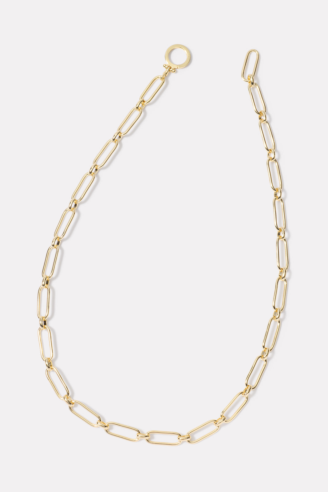 Designed to be worn with or without charms. the Zoey Statement Necklace by Gorjana features an 18K gold-plated open link design and a hinged closure.